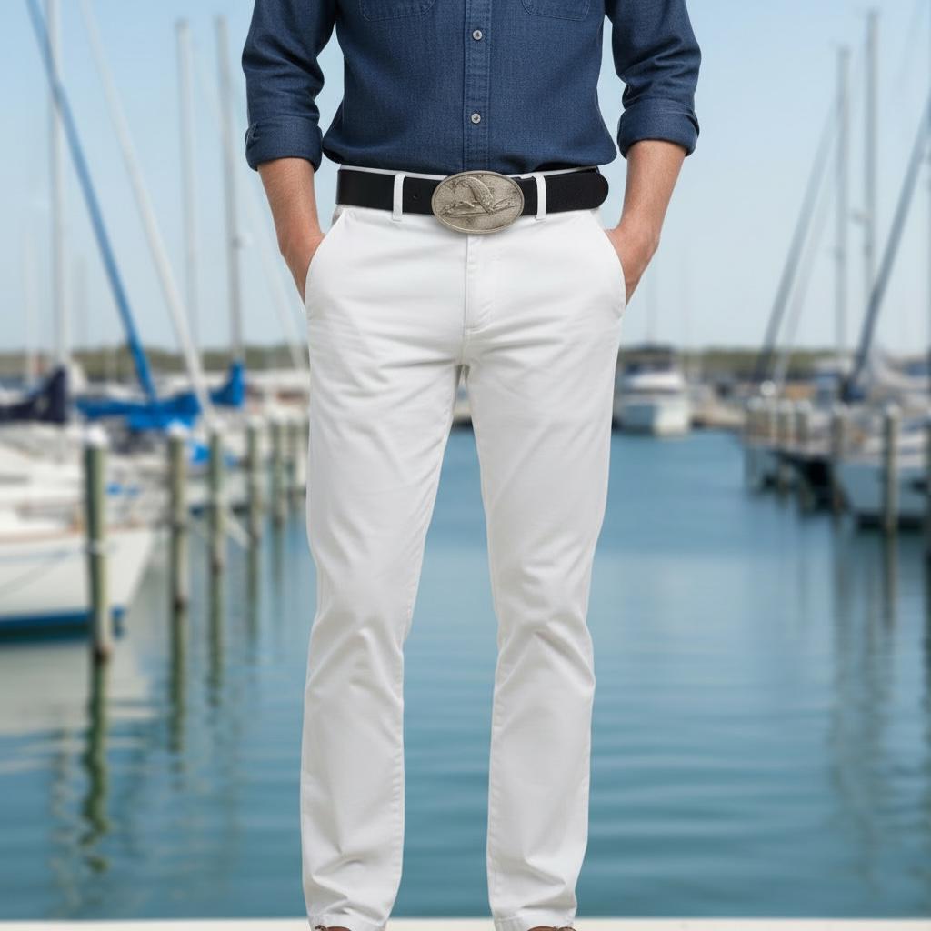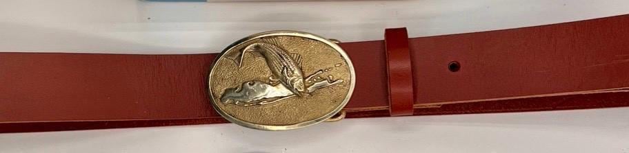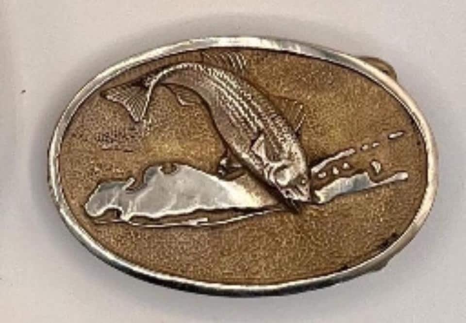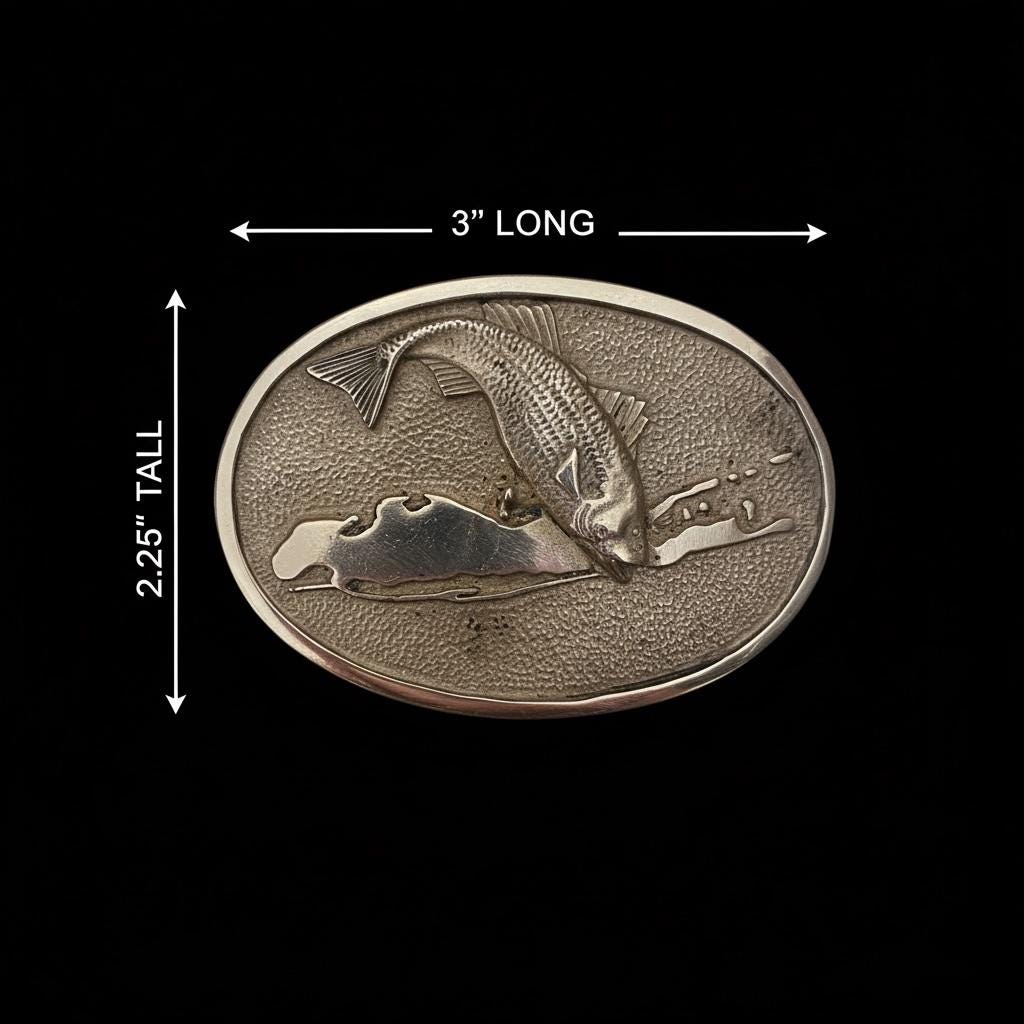 Add coastal character to your wardrobe with this detailed jumping striped bass and Long Island map belt buckle paired with a custom-cut genuine leather belt. Featuring a sculpted fish leaping over water with textured background detailing, this buckle blends rugged maritime style with timeless craftsmanship.