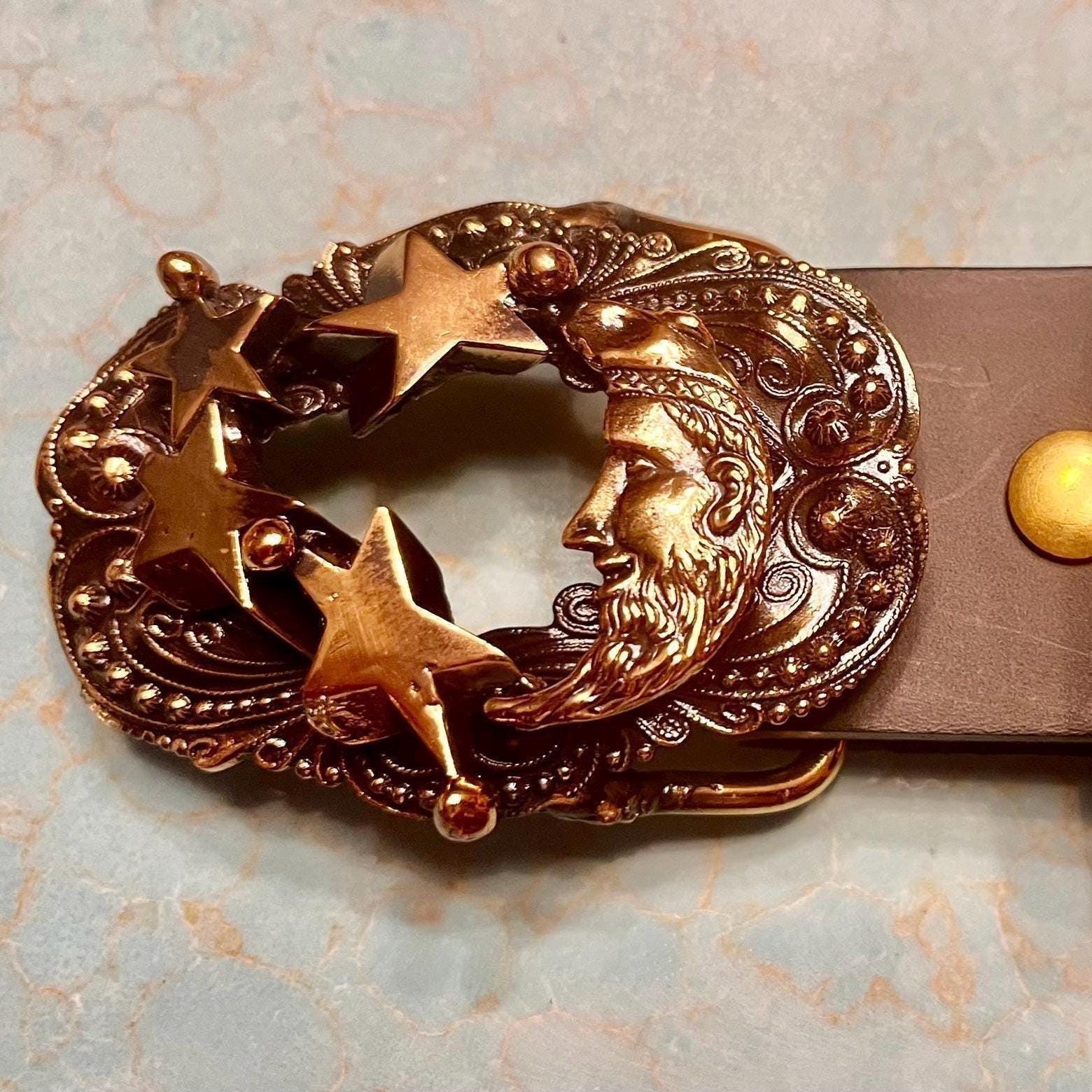- Handmade brass buckle featuring detailed moon and stars motifs by Richard Kaish