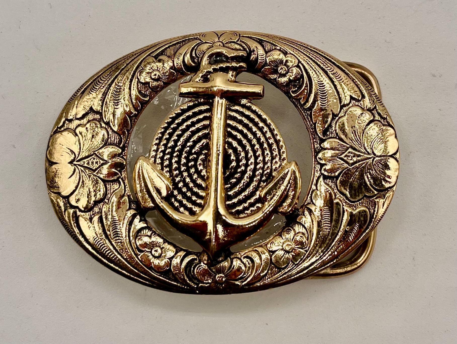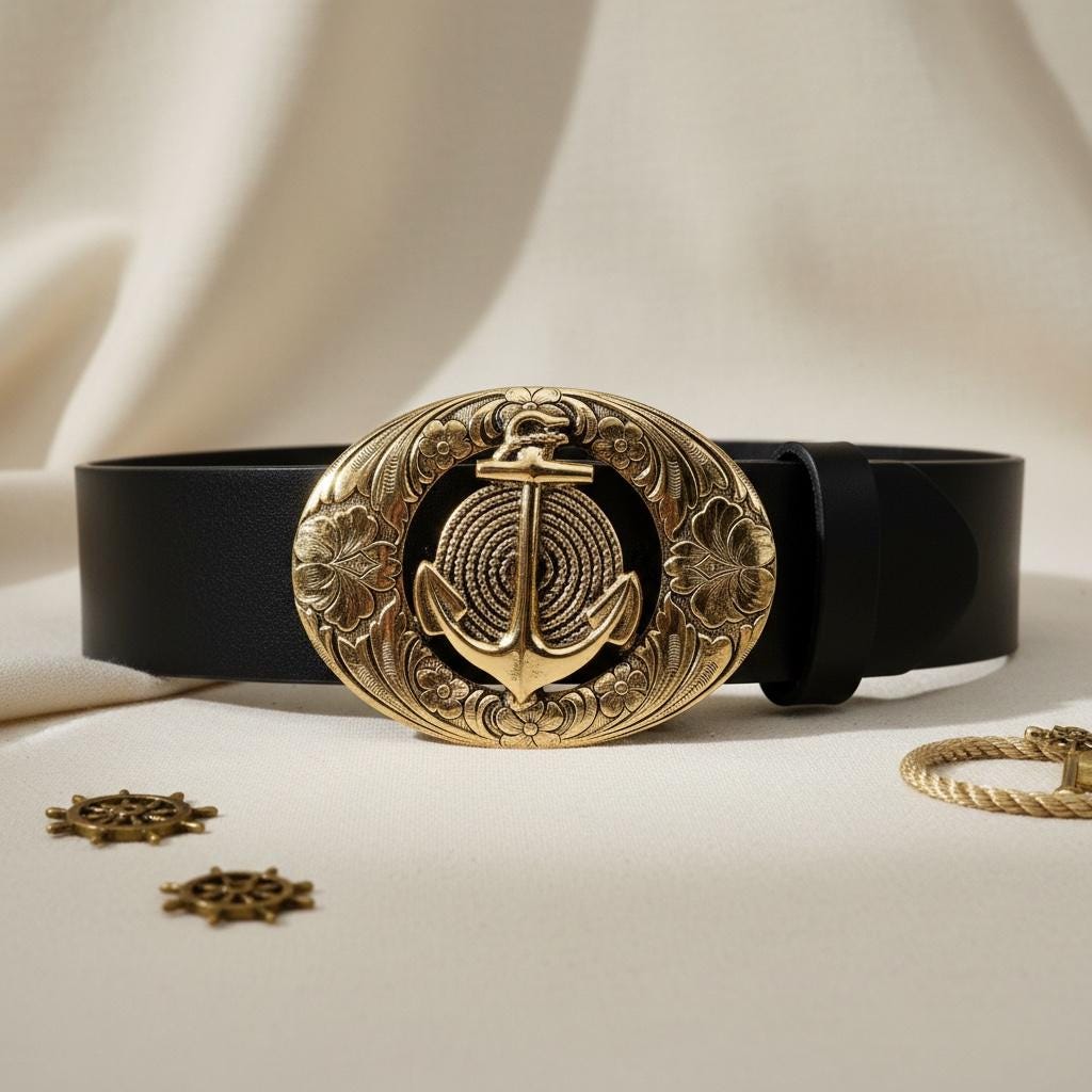 Set sail on style with this artisan-crafted belt featuring a striking anchor and compass rose design, perfect for those drawn to nautical charm and timeless symbols of hope and guidance. This solid brass buckle, expertly made by Cape Cod silversmith Richard Kaish, pairs beautifully with a handmade leather belt available in British tan, dark brown, or black. Whether you're a sea lover or searching for a meaningful gift, this accessory brings both craftsmanship and maritime spirit to your wardrobe.