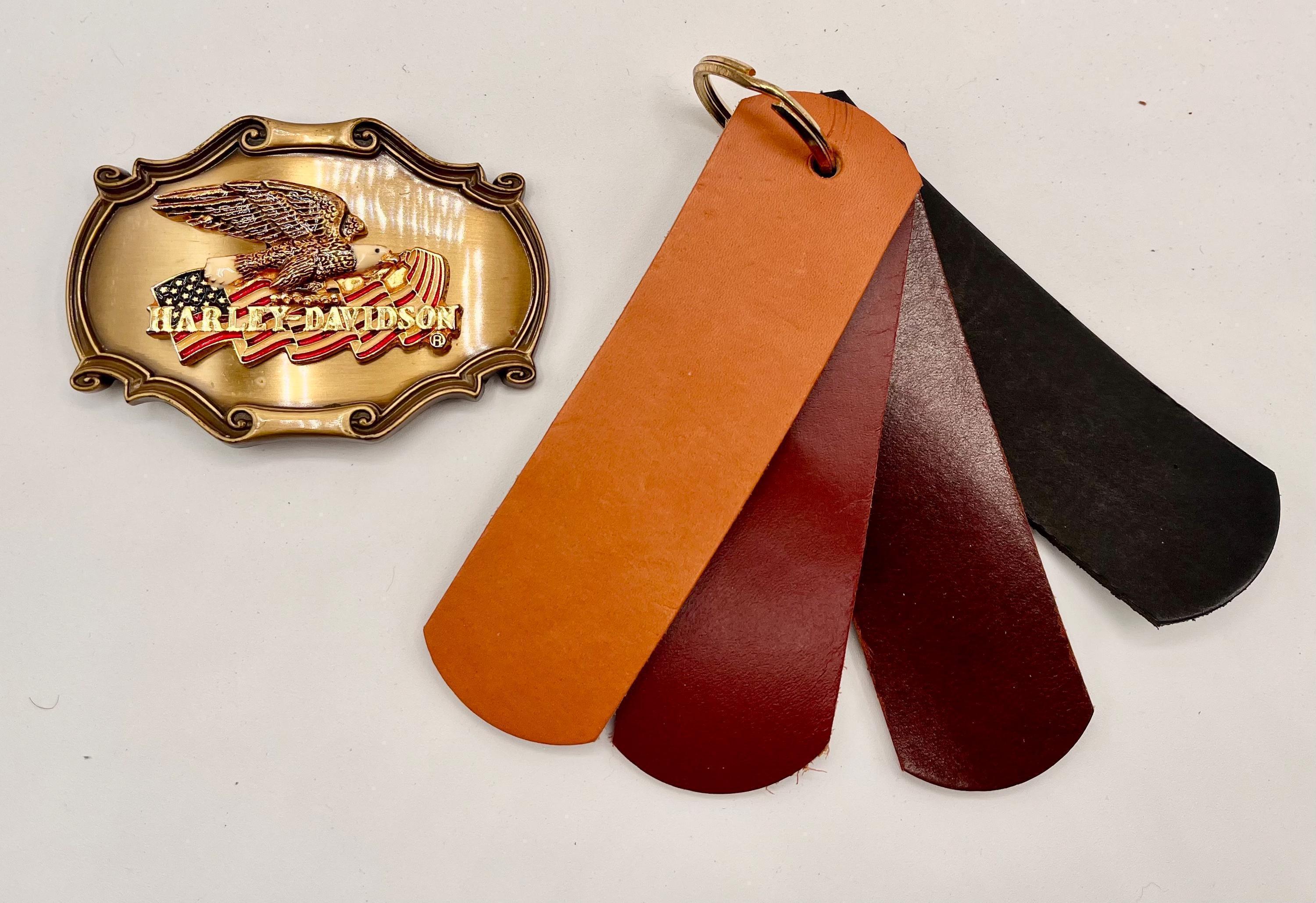 Embrace the spirit of the open road with this handmade leather belt set, designed for the true Harley Davidson enthusiast. Featuring a unique vintage raintree buckle, each piece tells a story steeped in timeless biker heritage and rugged durability. Crafted with care in Patchogue, New York, this belt perfectly blends classic style with custom fit leather to celebrate individuality and craftsmanship.