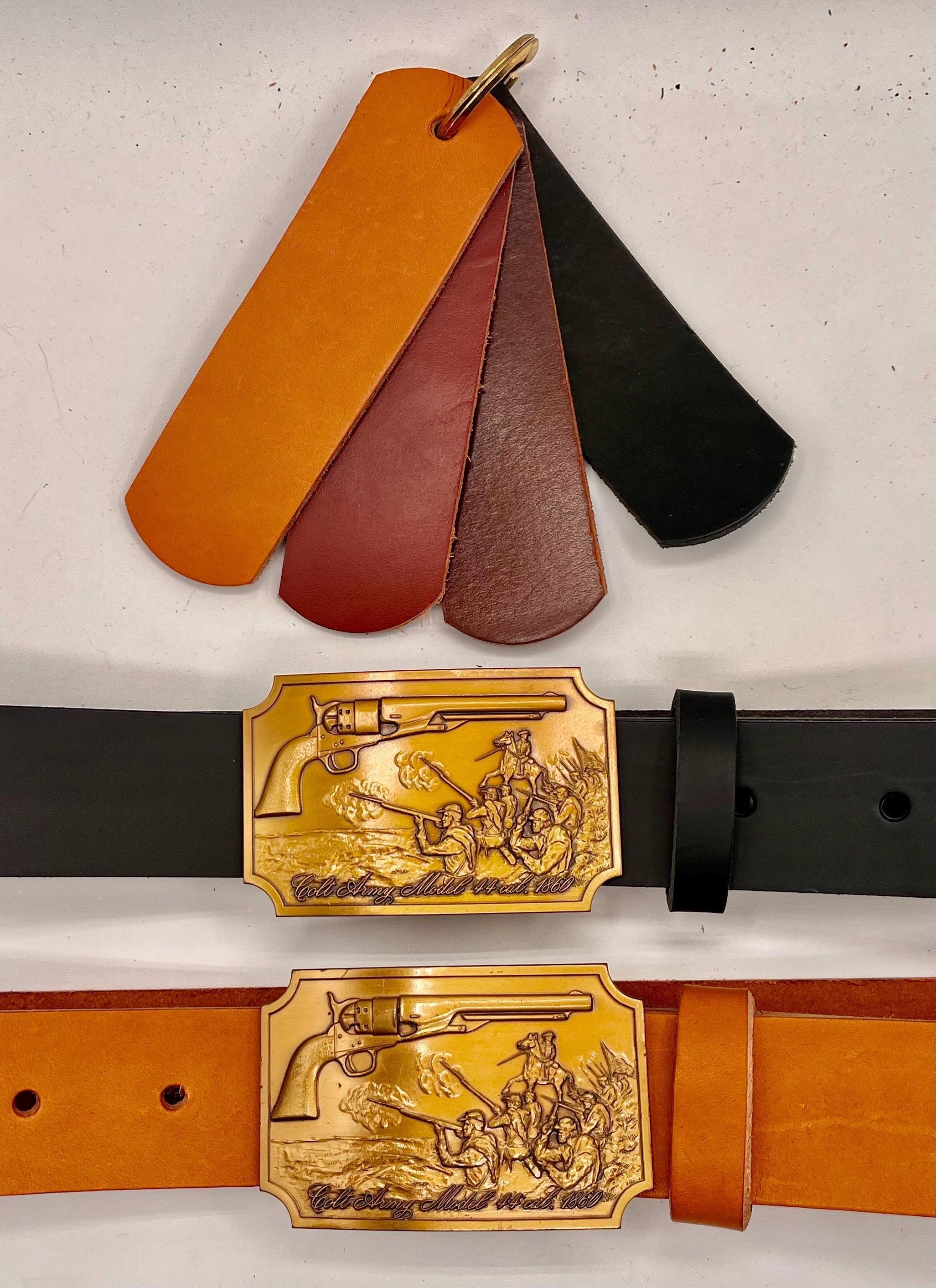 Step into the spirit of the American West with this custom leather belt, designed for those who appreciate rugged craftsmanship and authentic style. Featuring a brass western style buckle inspired by the iconic Colt 1860 revolver, this belt is a perfect gift for gun lovers and enthusiasts of military style belts. Handmade in Patchogue NY, it blends durable materials with timeless design to celebrate heritage.
