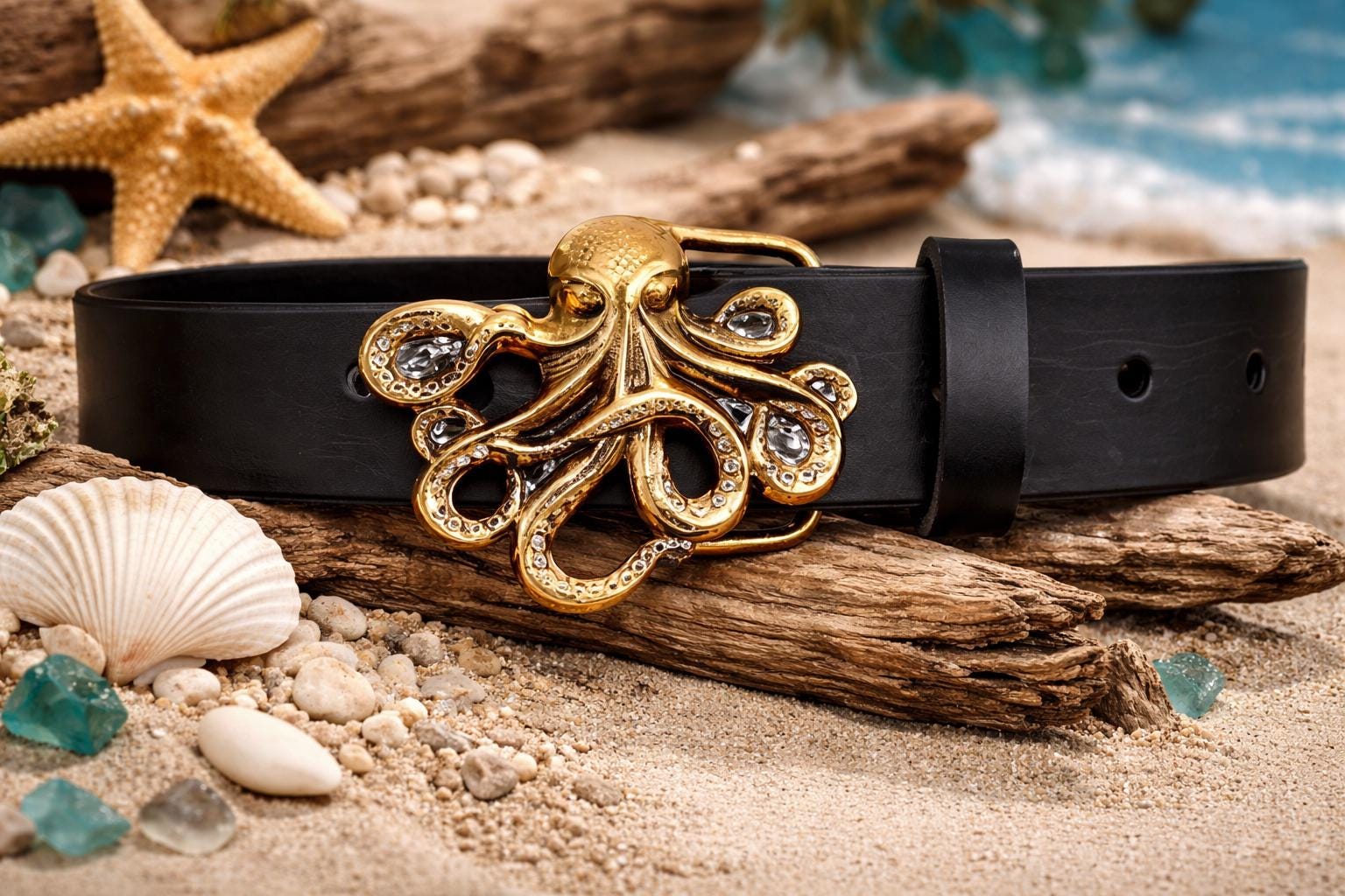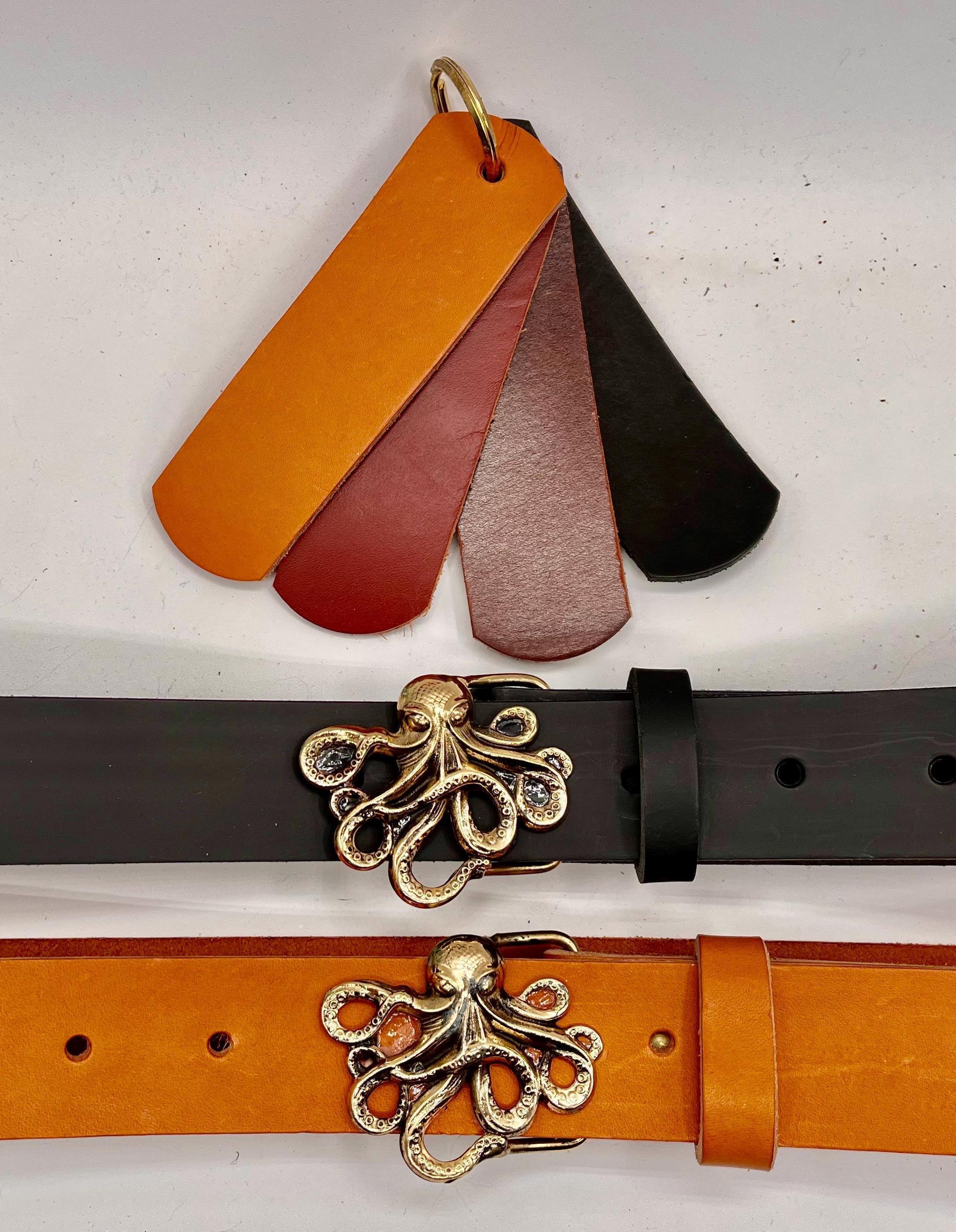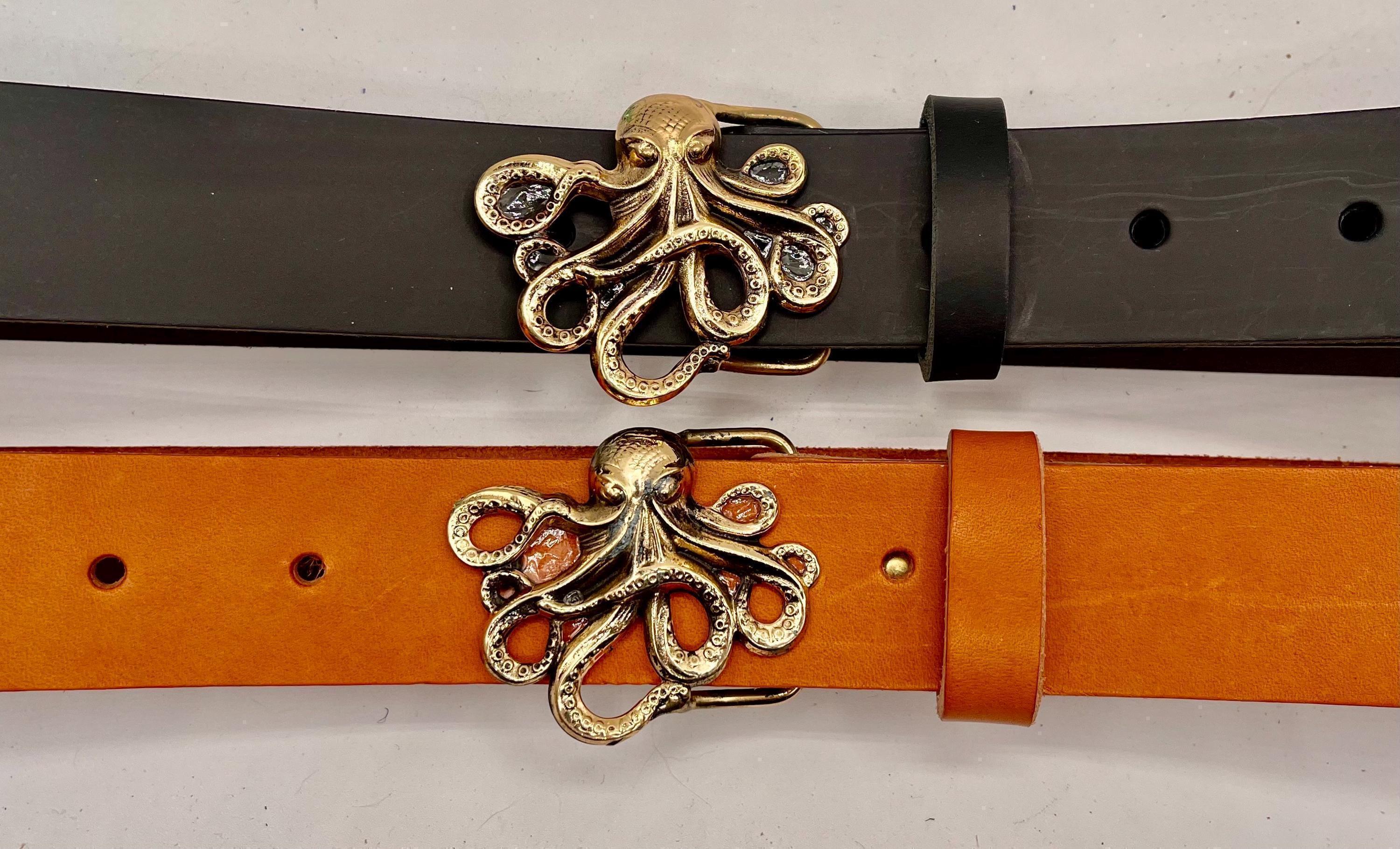 Discover a stunning blend of craftsmanship and maritime charm with this custom waist belt, featuring a striking octopus nautical art buckle that captures the essence of the sea. Designed by acclaimed artist Richard Kaish, each buckle is a wearable art piece that pairs beautifully with rich British tan, dark brown, or classic black leather. Whether you're drawn to maritime style or seeking a unique sea lover gift, this belt offers timeless appeal in multiple colors.