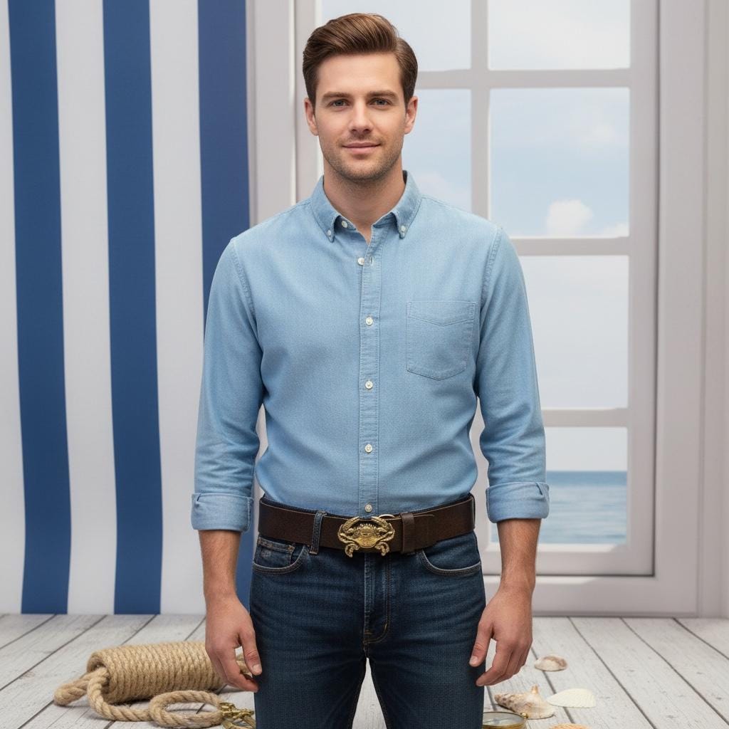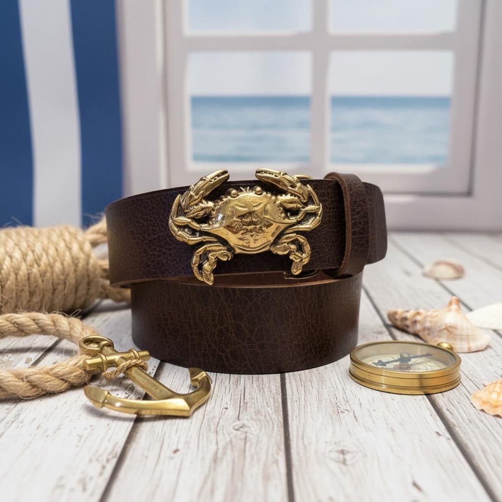 - ✅ Handmade buckle showcasing the symbolic blueclaw crab design by Richard Kaish
