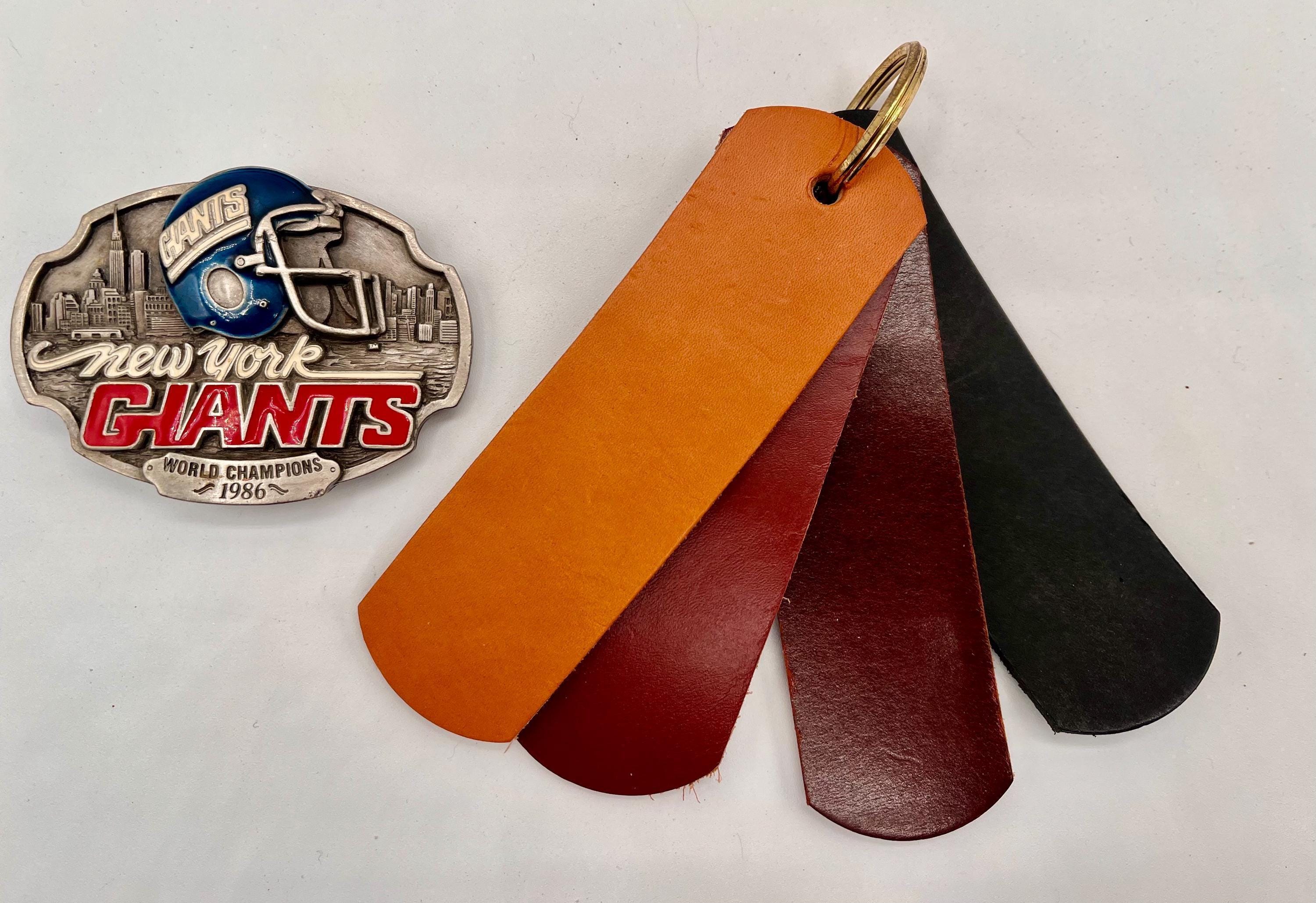 Celebrate your passion for vintage NY Giants memorabilia with this finely crafted leather belt featuring a pewter buckle commemorating the iconic 1986 World Champion season. Handmade with care from premium US cowhide leather, this accessory blends timeless style with durable craftsmanship. Whether you choose British tan, dark brown, or black, this custom handmade belt is designed to honor your fandom with authenticity and lasting appeal.