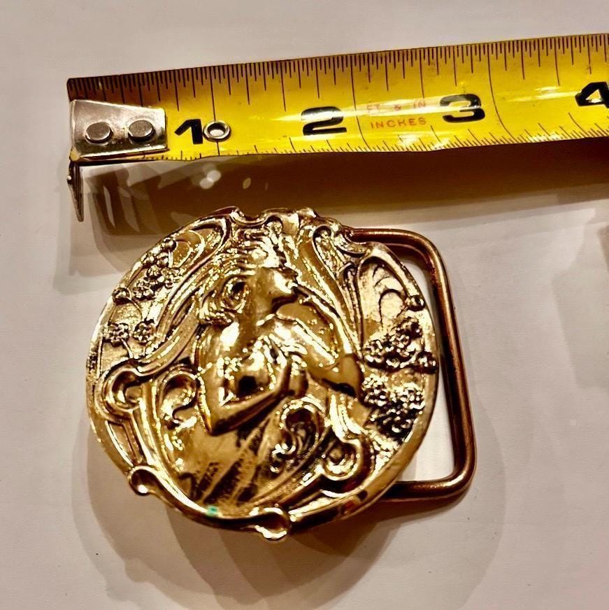 - Handmade brass buckle featuring the iconic Art Nouveau lady design by Richard Kaish