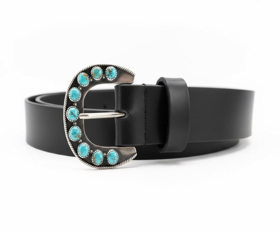 This timeless buckle features natural turquoise set in solid sterling silver, creating a striking statement piece rooted in Southwestern heritage and craftsmanship. Each buckle is paired with our custom-made leather belt, cut and finished by hand for durability, comfort, and heirloom quality.