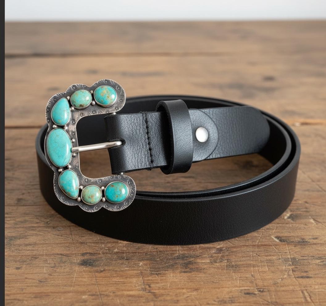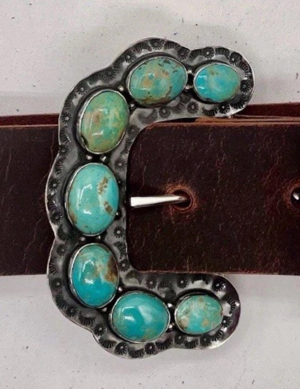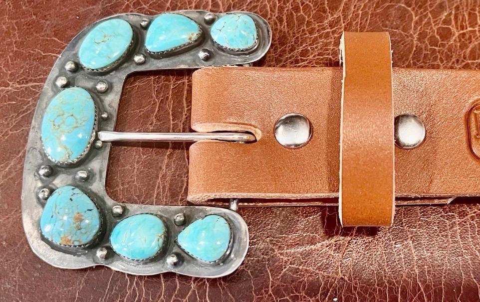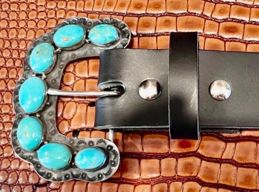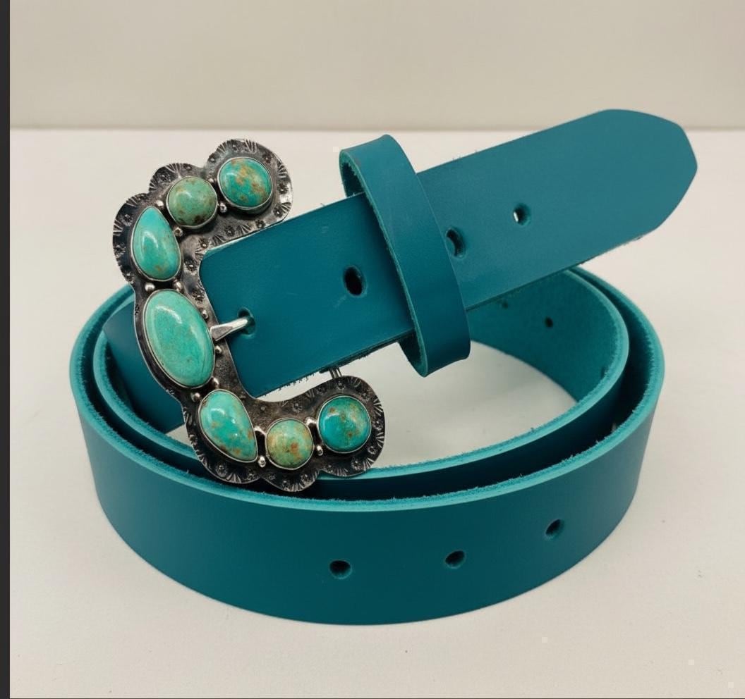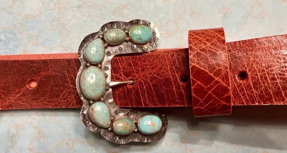 **Please note that each buckle is unique and features different turquoise variations and the shape of the buckle may slightly deviate. See photos of the buckles. Feel free to contact seller to preview the buckle before it is added to your belt and shipped.