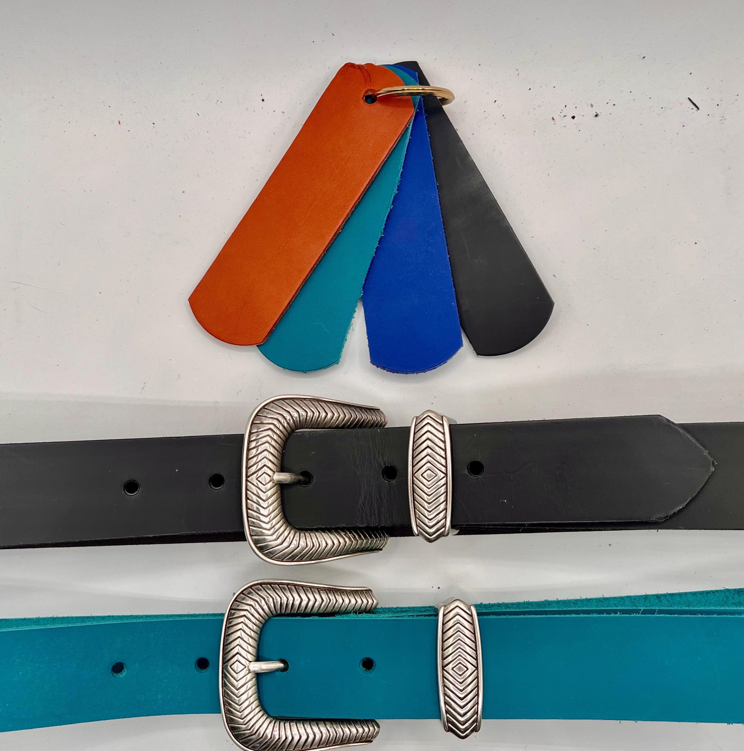 Discover the rugged allure of our cowhide ranger belt, a true testament to Western cowboy style crafted with care in Patchogue, NY. This premium accessory blends the rich tones of British tan, classic black, and vibrant cobalt blue to elevate your wardrobe with authentic charm. Each belt is a high-end accessory designed for those who appreciate durability and timeless craftsmanship.