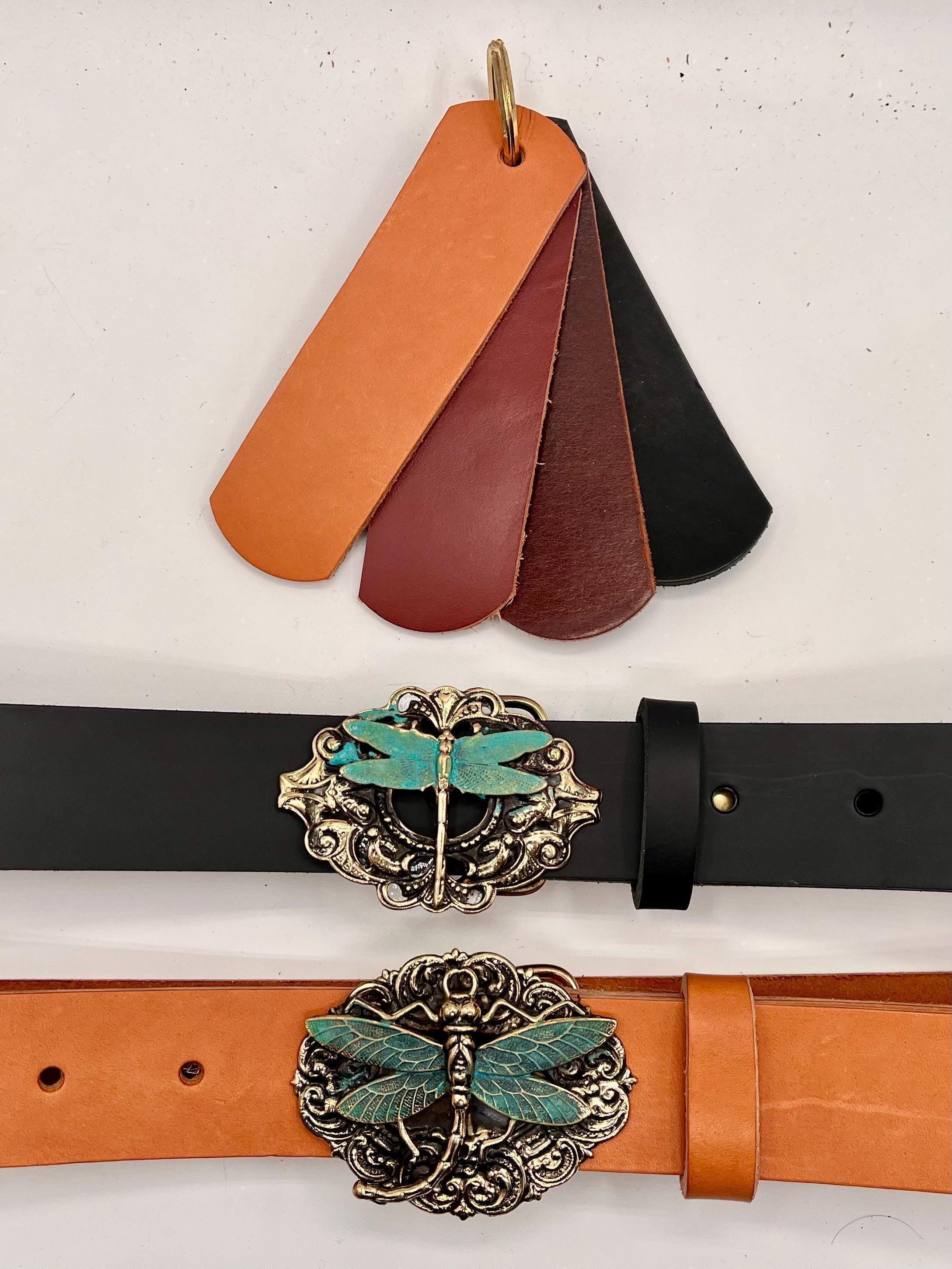 Embrace the natural elegance of this brass dragonfly belt buckle, a true wearable art piece that captures the delicate beauty found in nature. Handmade by master artisan Richard Kaish, this accessory pairs a durable brass buckle with rich British tan leather, offering a versatile and timeless addition to any wardrobe. Whether dressing up or down, this unisex fashion belt brings a touch of rustic charm and refined craftsmanship to your everyday style.