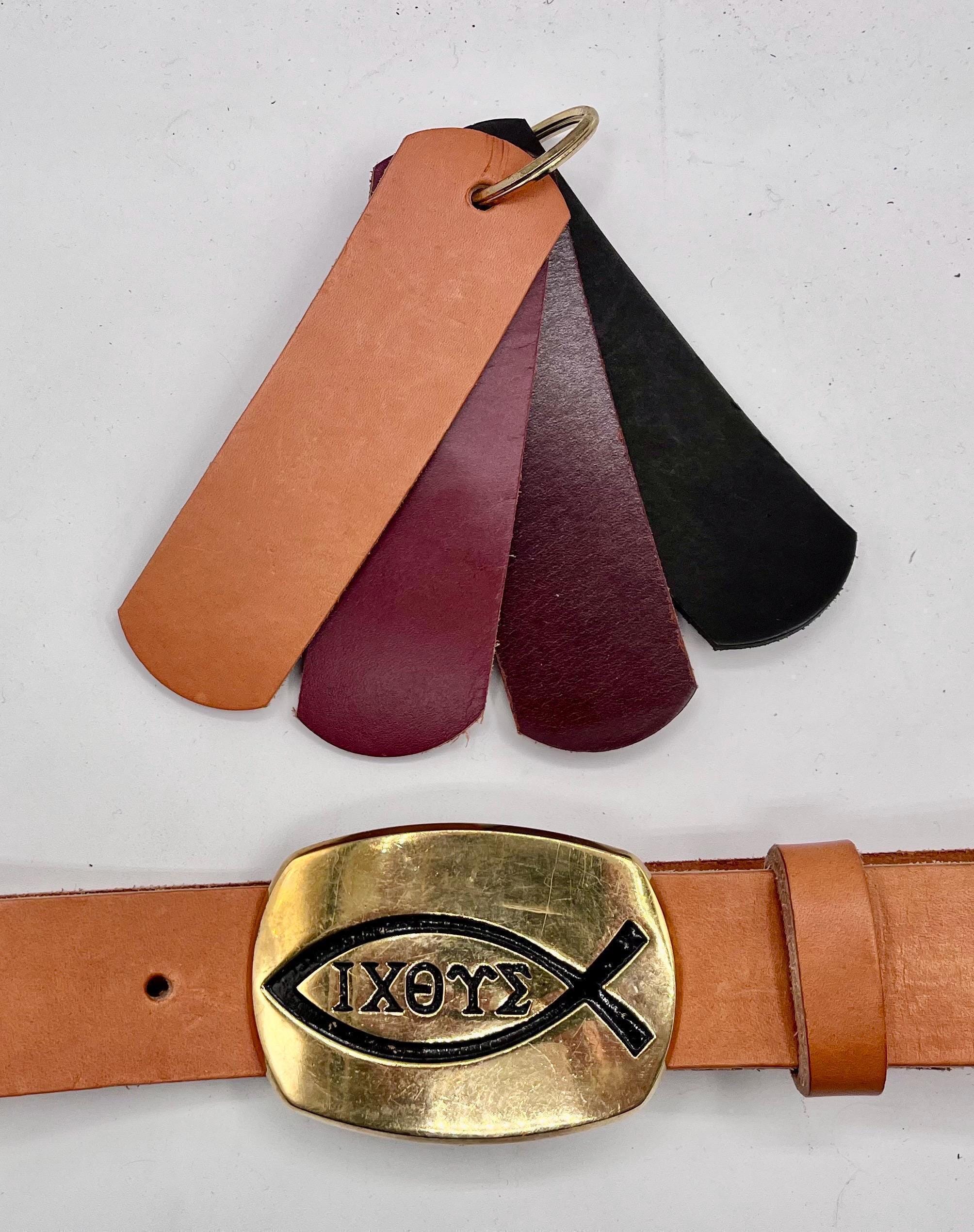 Experience the perfect blend of faith and craftsmanship with this Jesus Fish belt buckle, a cherished Christian faith gift that carries profound meaning. Handcrafted in Patchogue, NY, this genuine brass buckle is paired with premium leather straps available in four rich colors, including British tan leather and dark brown belt options. Each piece from Baron Brass and Bonfe Leather Workshop reflects timeless tradition and quality that speaks to both style and spiritual significance.
