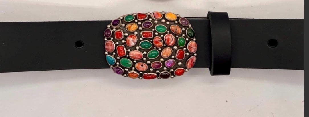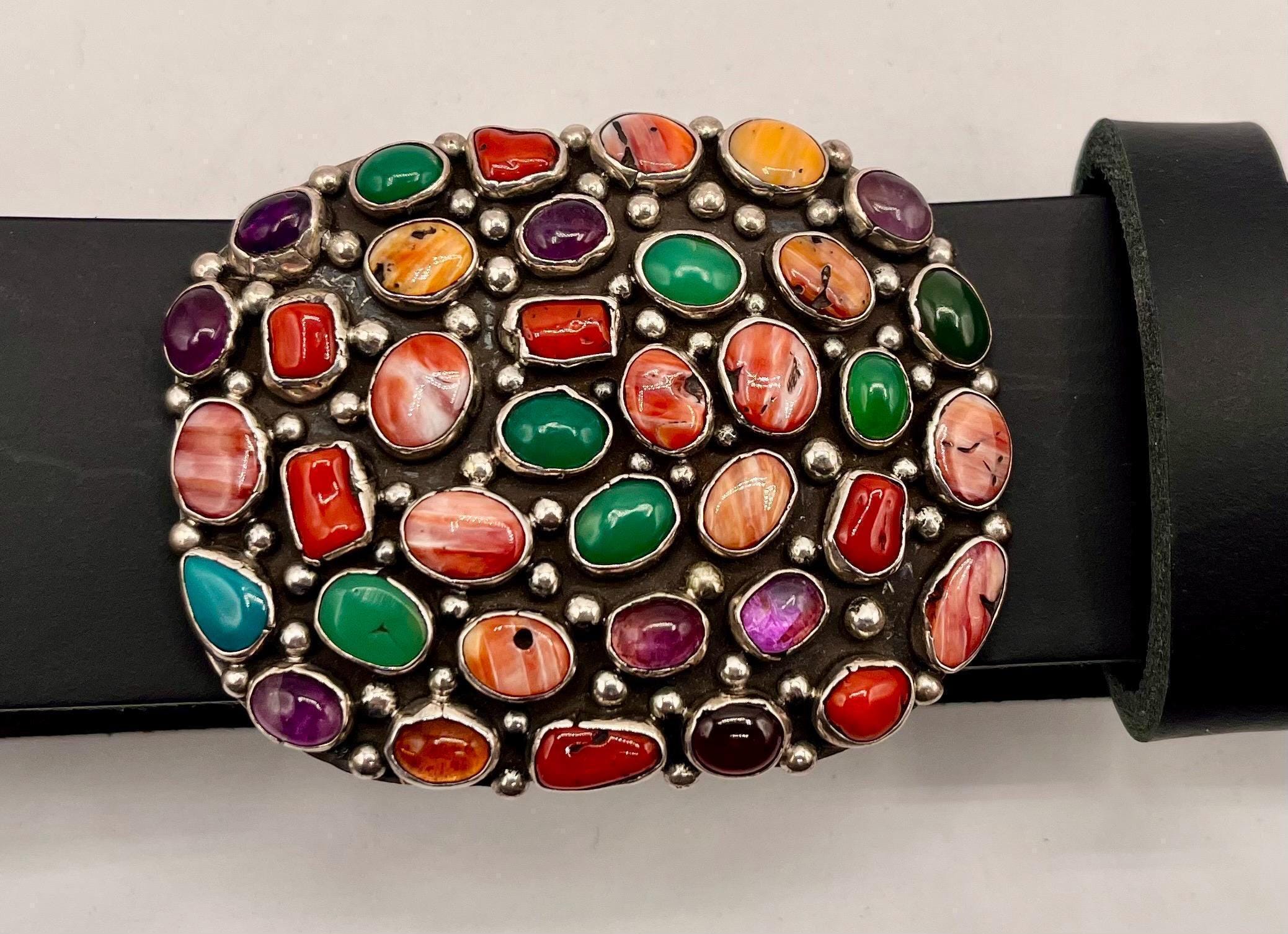 - Handmade sterling silver buckle featuring ~30 individually set multi-gemstones for a unique and colorful design