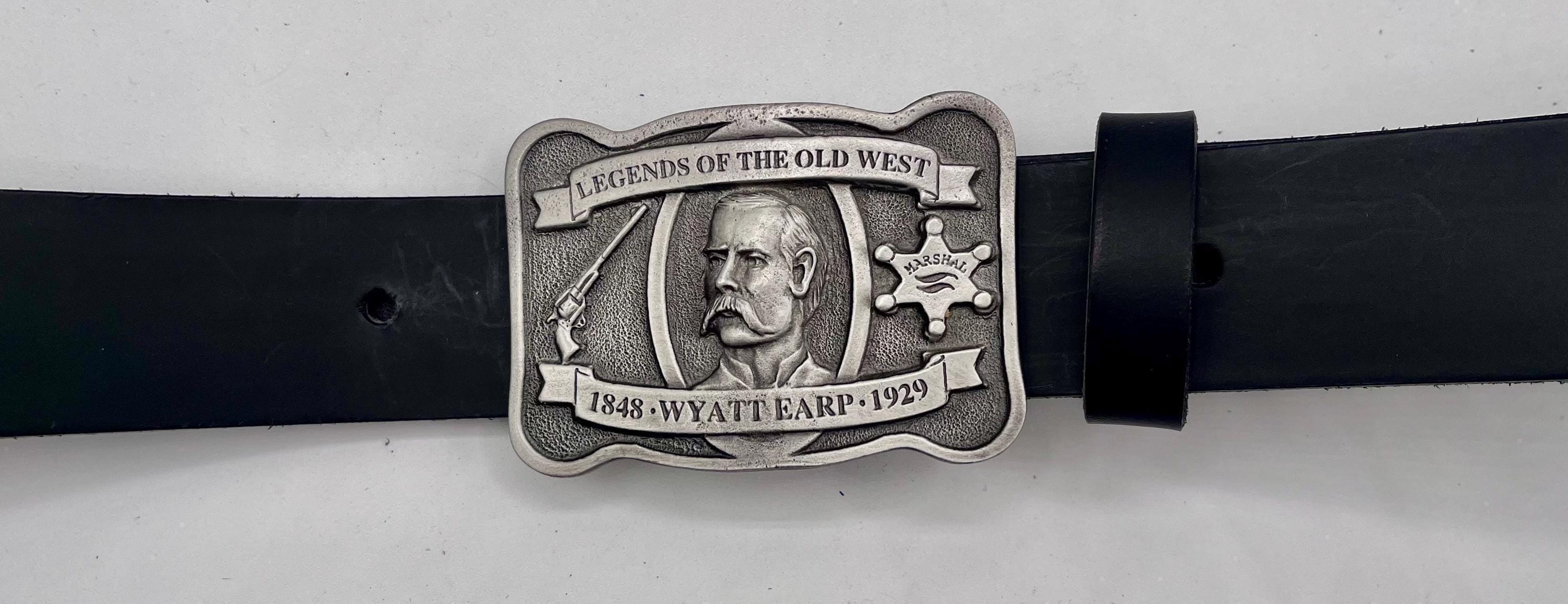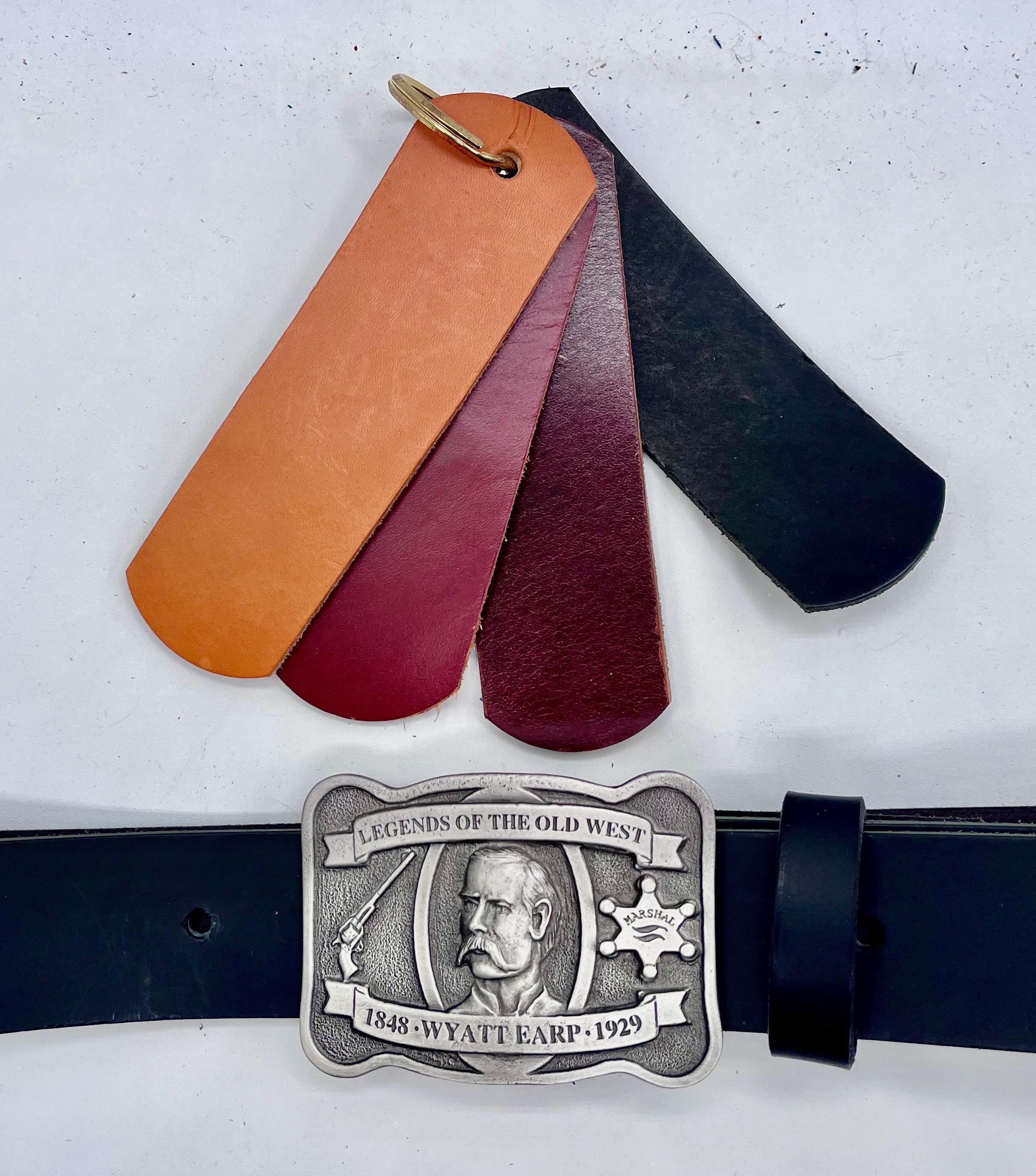 Step into the rugged charm of the Old West with this Wyatt Earp belt buckle, expertly paired with a custom cowhide strap that captures authentic Western style. Handcrafted by Bonfe Leather Workshop, each piece blends tradition and quality, making it a standout collectible for lovers of pewter cowboy buckles and classic leather belts. The rich tones of British tan, dark brown, or black leather add timeless appeal to this unique accessory.