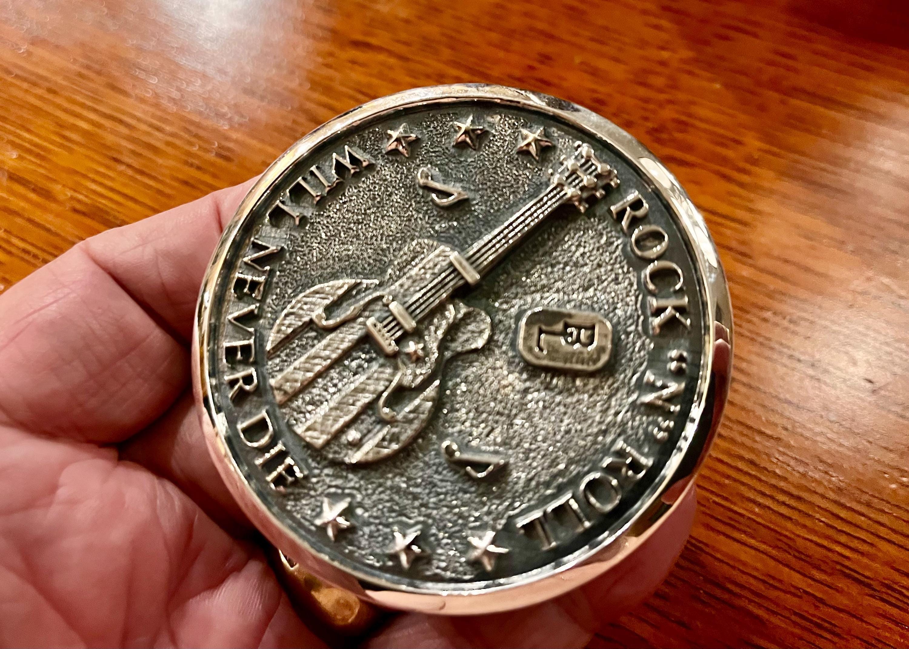 - Solid white brass buckle engraved with “rock ‘n’ roll will never die” for a bold statement