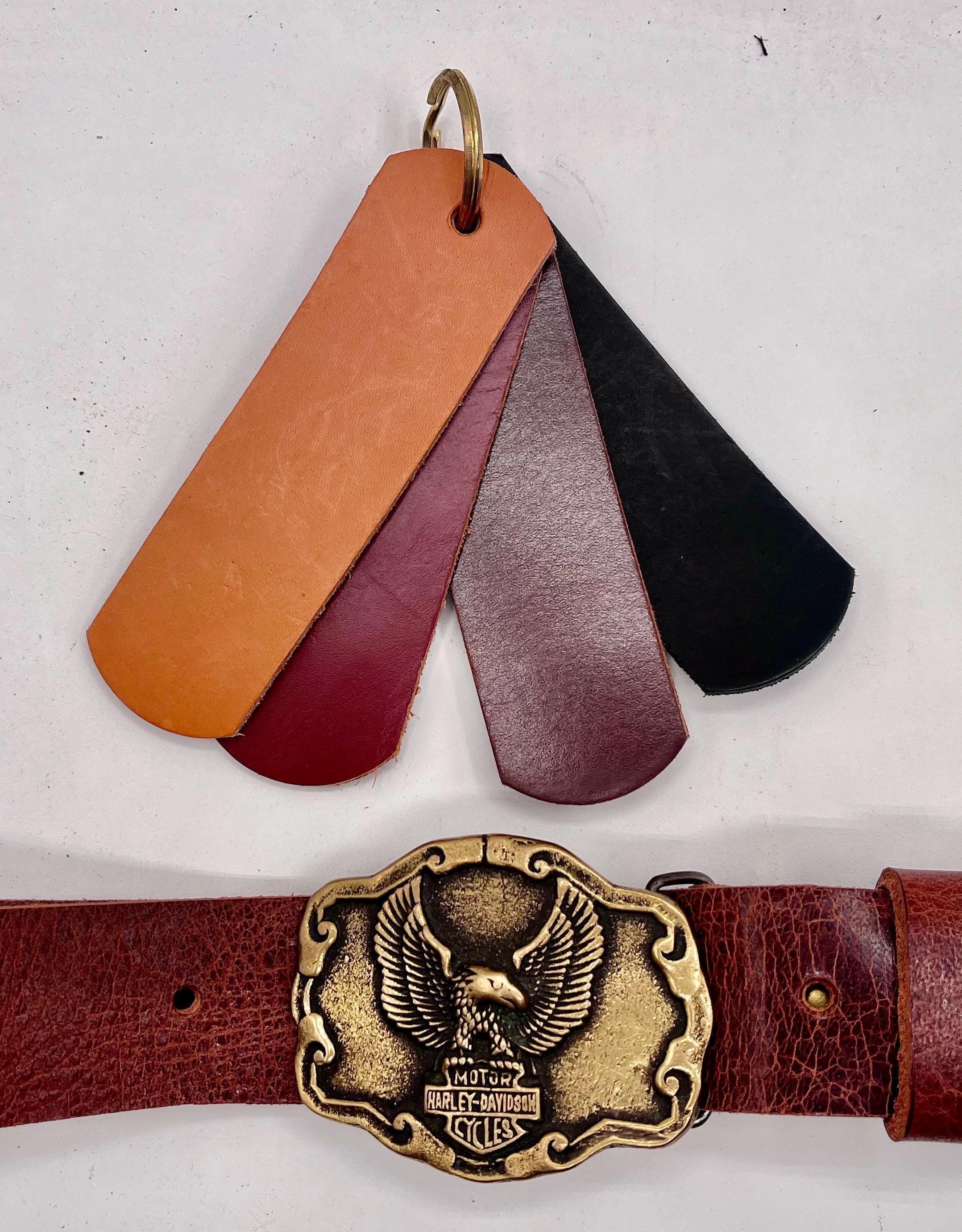 - Custom buffalo hide belt available in British tan, chestnut, dark brown, and black