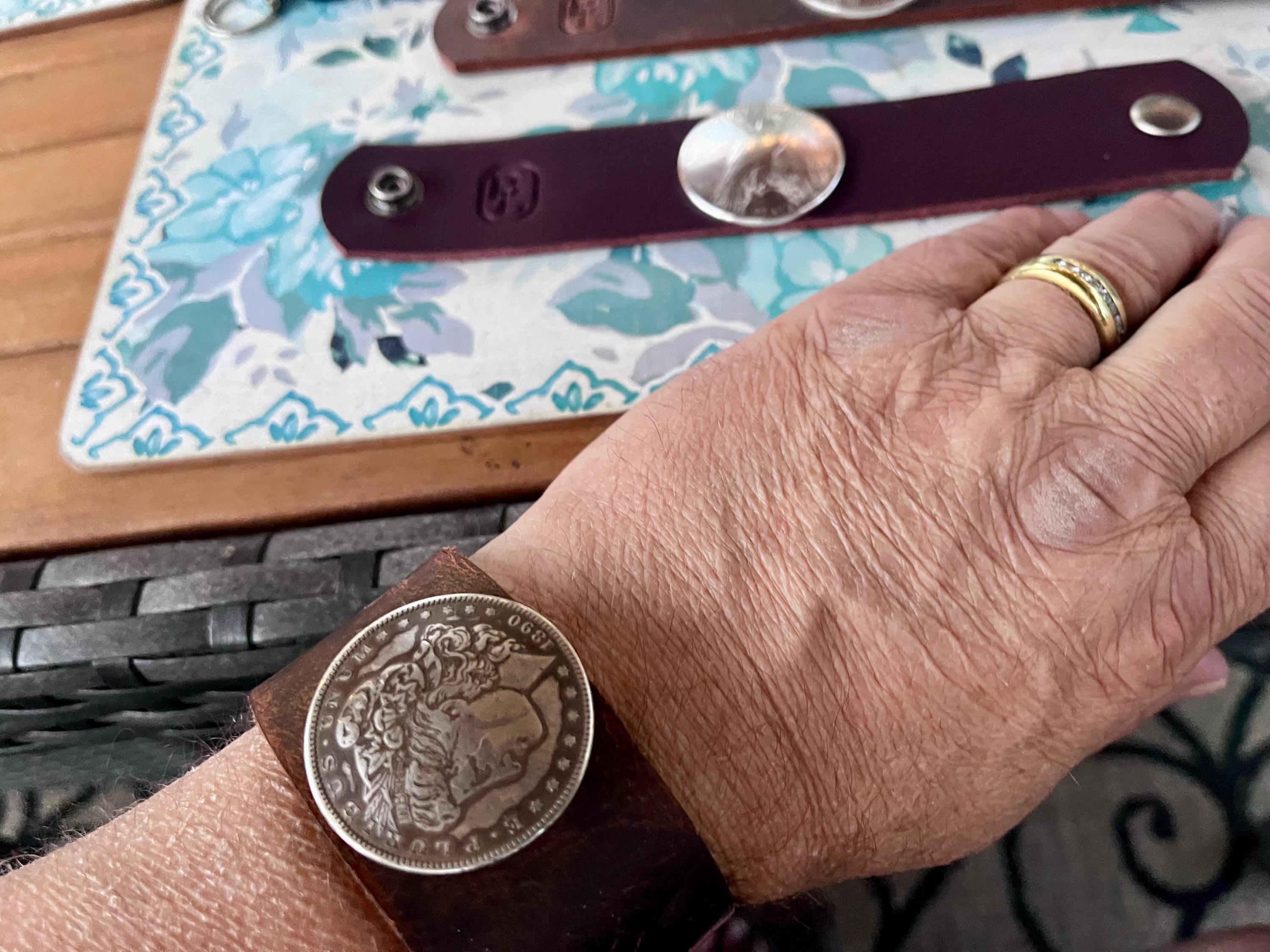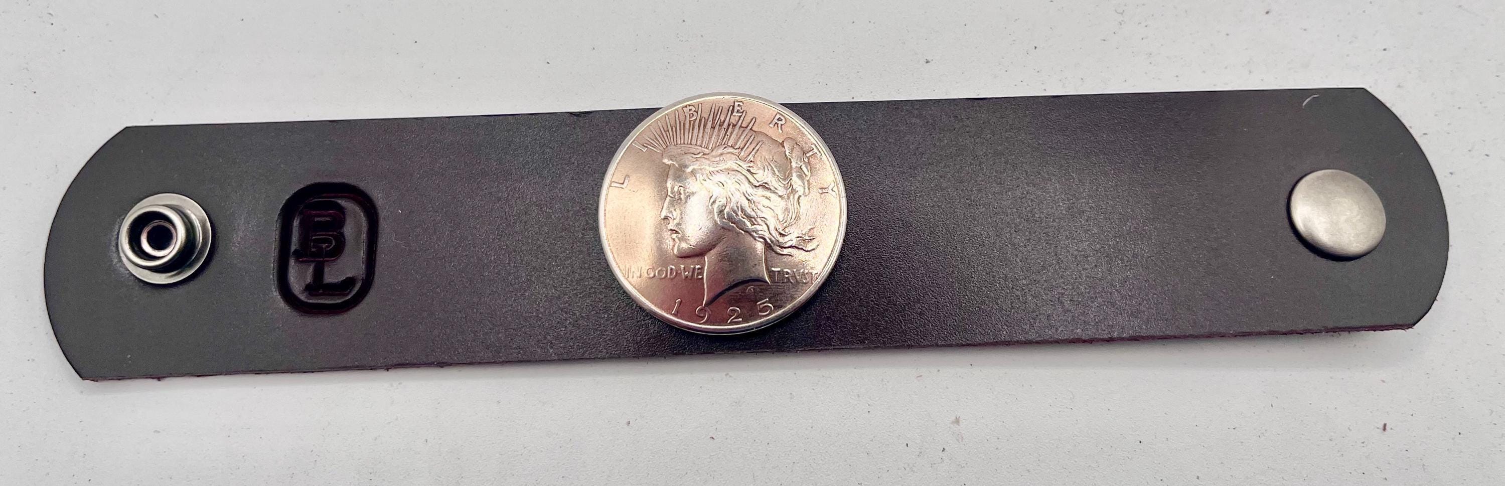 - Real domed Peace silver dollar coin mounted on premium crazy horse Buffalo leather