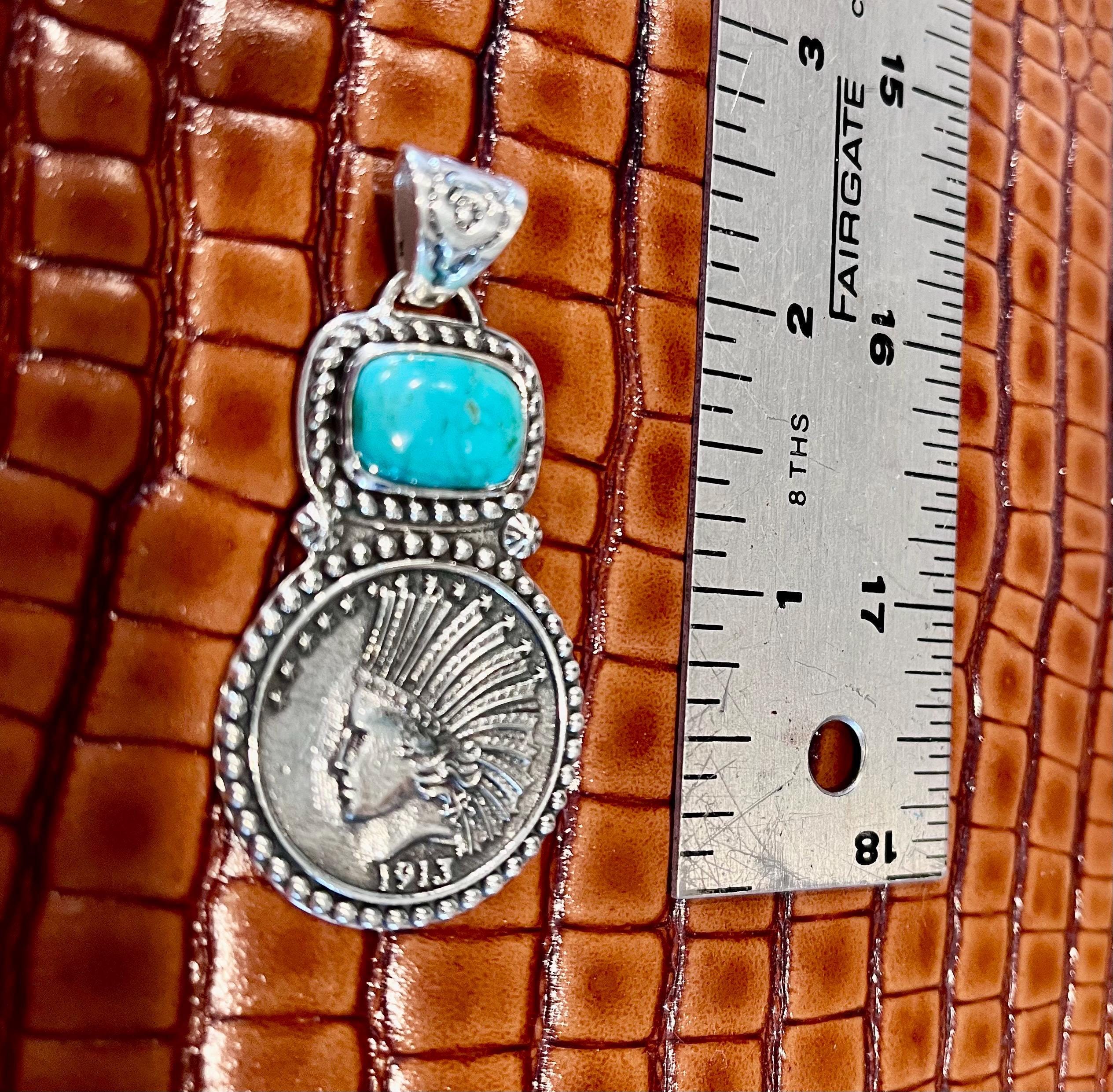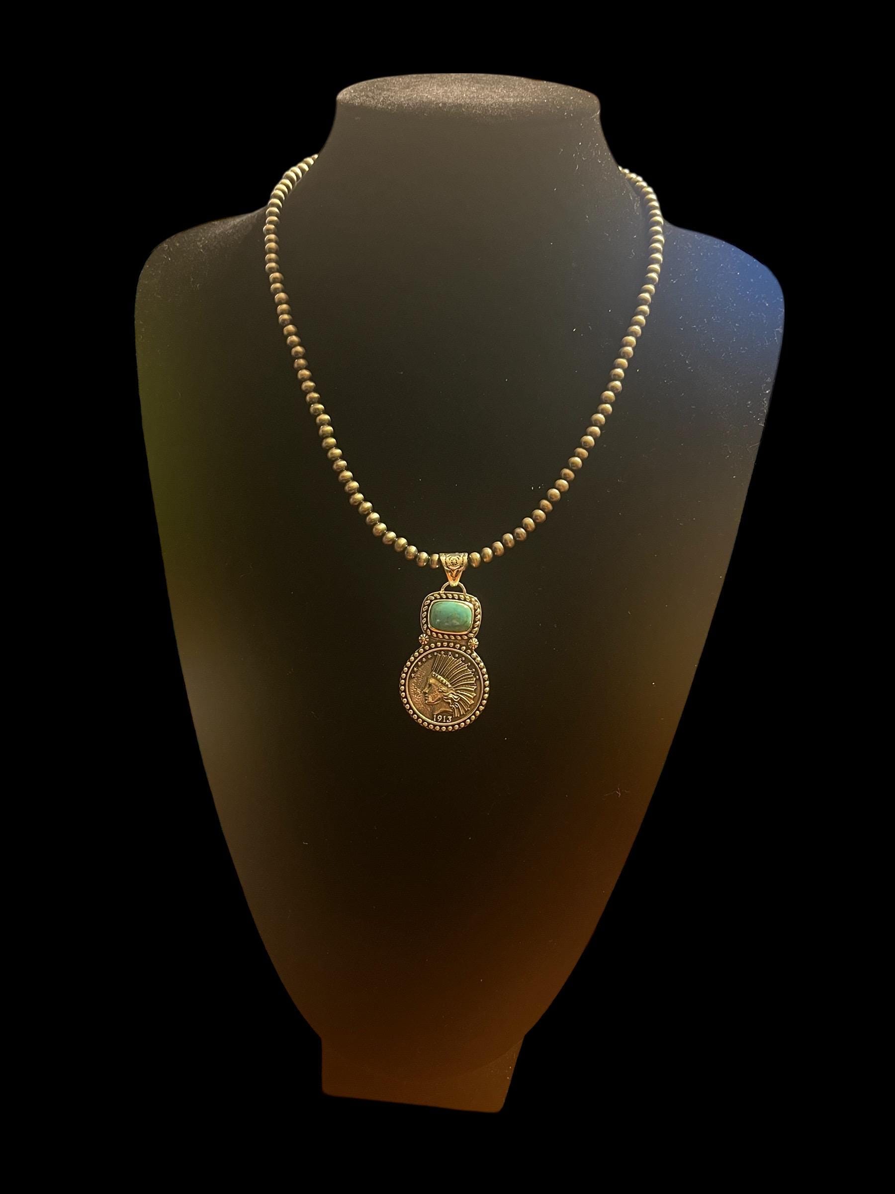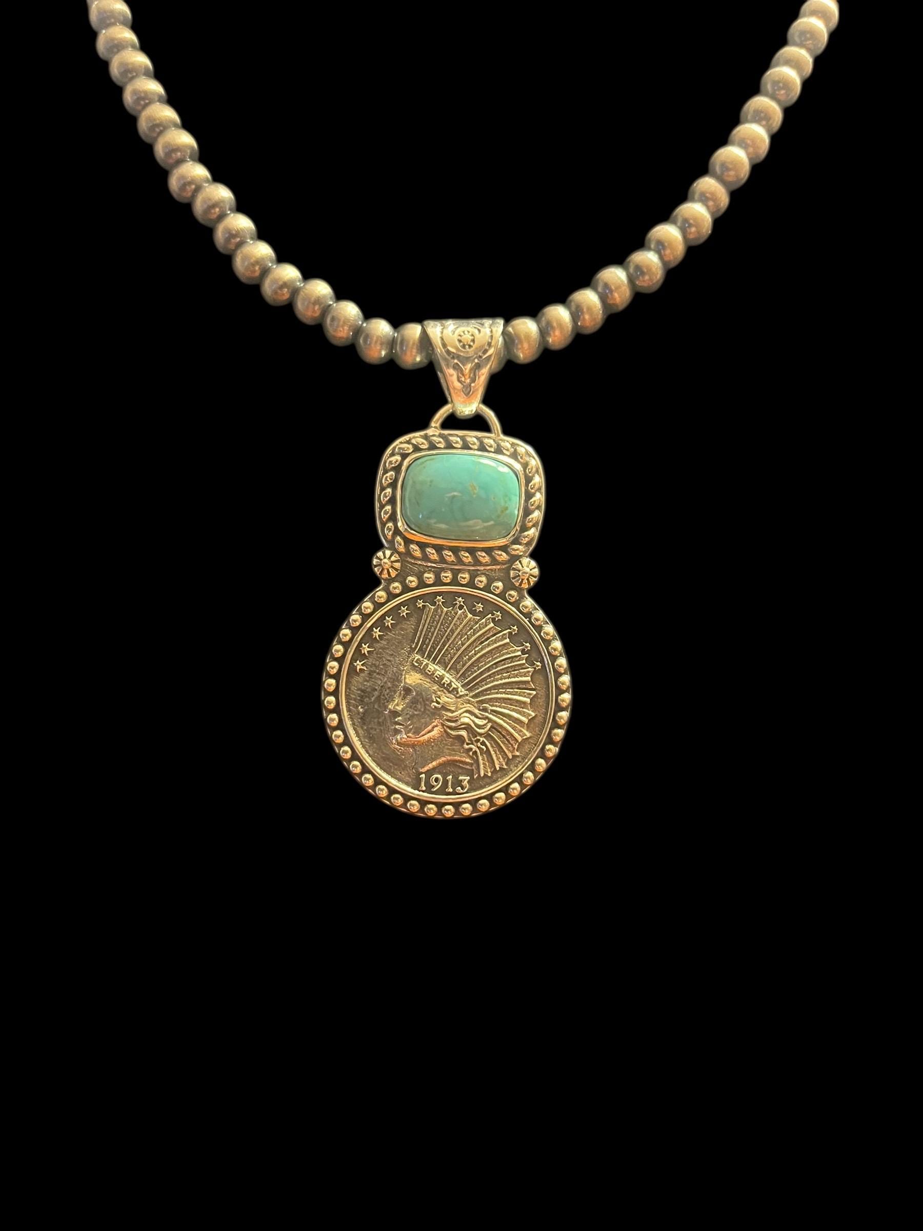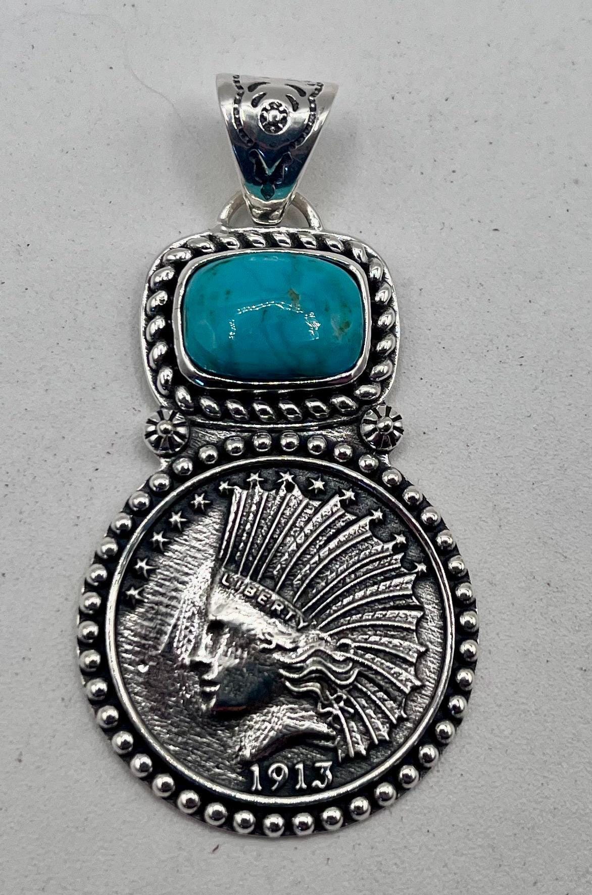 Step into a world where history meets artistry with this exquisite turquoise pendant, inspired by vintage Indian coin designs and crafted to celebrate the vibrant beauty of Blue Green Turquoise. Sourced from the famed Kingman Mine, the stone's rich hues perfectly complement the timeless charm of the $10 Indian Head coin centerpiece. This unique jewelry gift captures a boho chic necklace style that speaks to those who appreciate meaningful, handcrafted treasures.