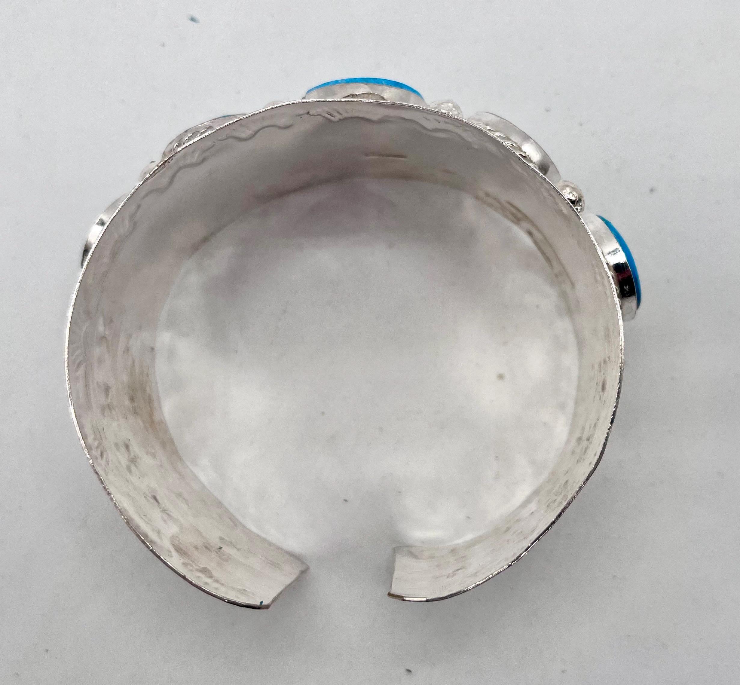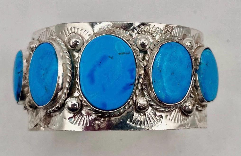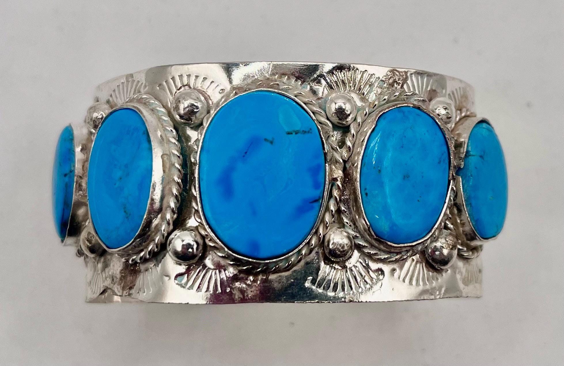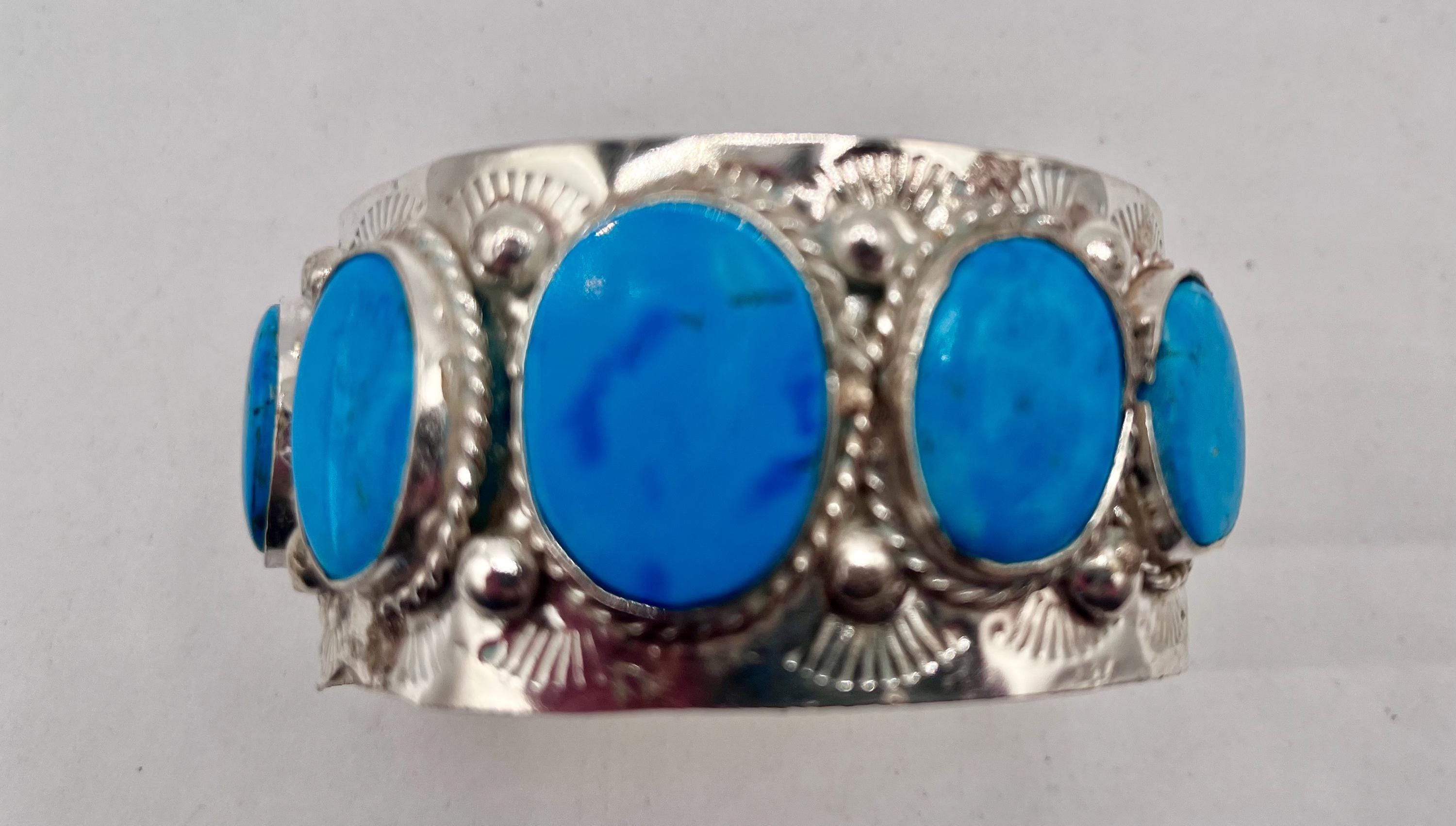- Handcrafted sterling silver cuff featuring five authentic Morenci turquoise stones