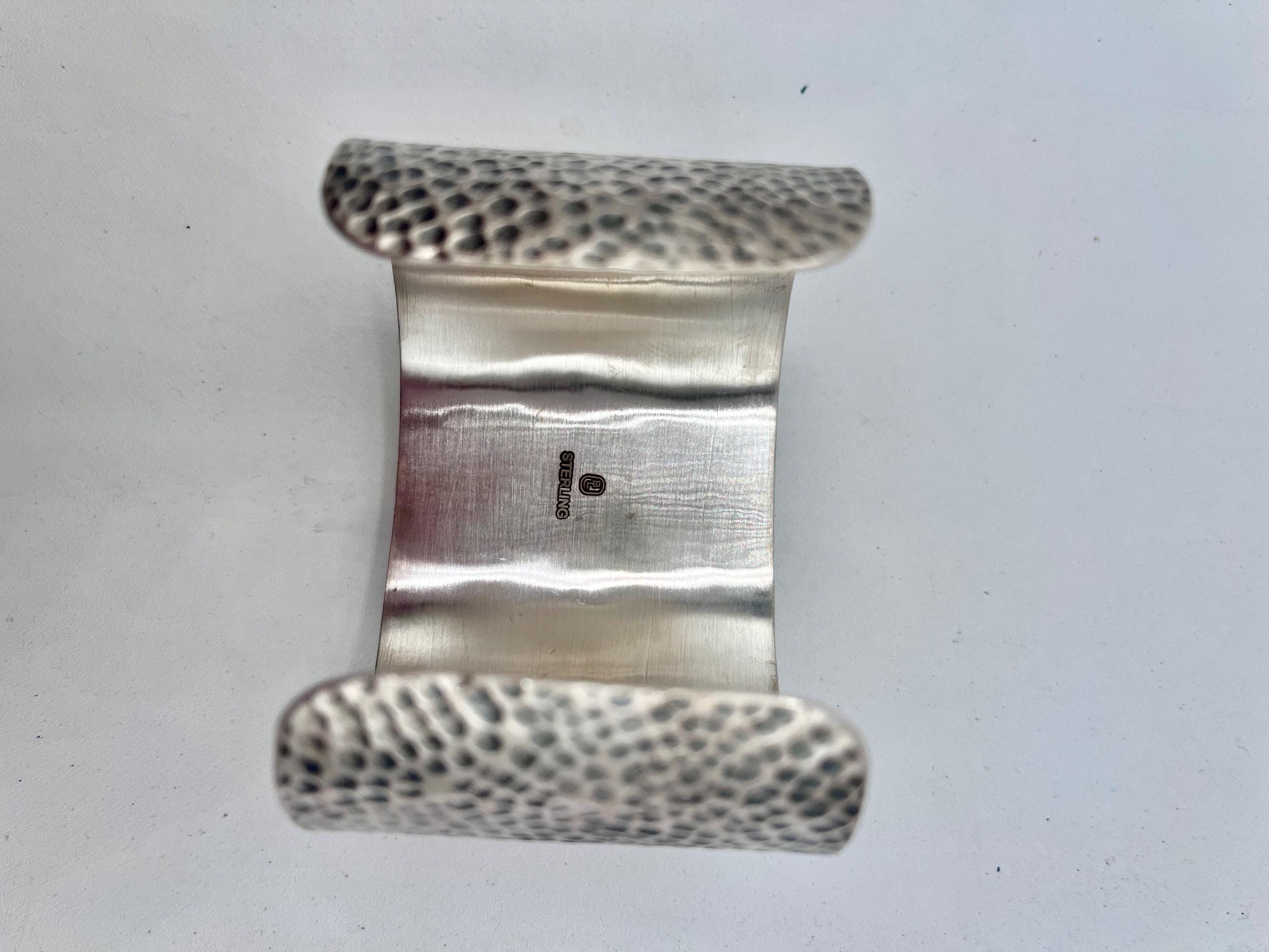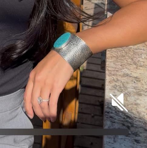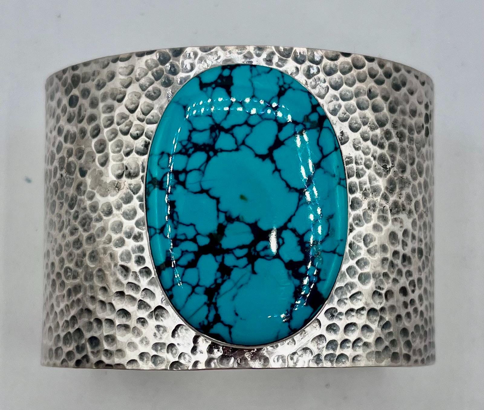- Features a striking Kingman turquoise centerpiece set in hammered sterling silver