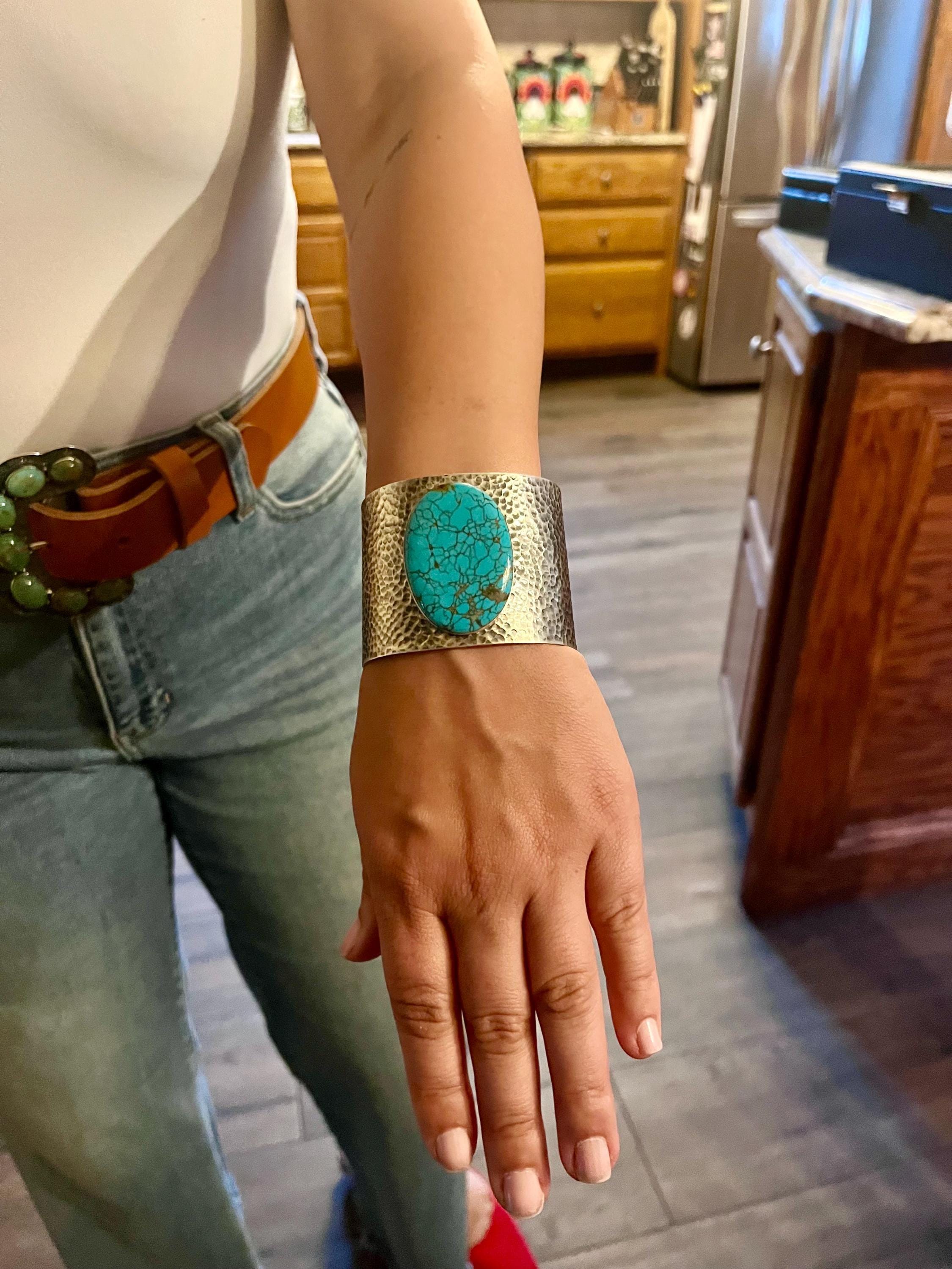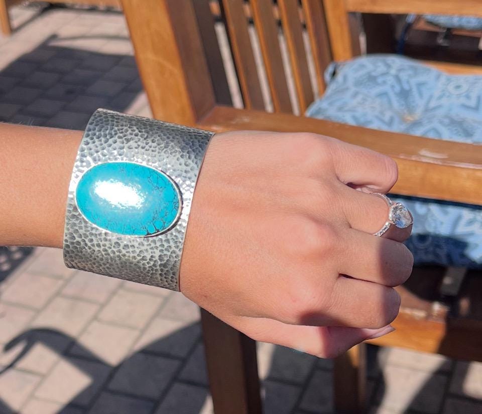Experience the timeless allure of southwestern artistry with this stunning cuff bracelet, featuring a vibrant Kingman turquoise stone that captures the essence of the desert sky. Handcrafted by skilled artisans in Patchogue NY, this piece blends comfort fit bracelet design with hammered sterling silver for a boho chic accessory that speaks to both elegance and bold style. Whether you're searching for a meaningful gift for her or a unique unisex cuff bracelet, this silver and turquoise creation offers a statement look that's truly one-of-a-kind.