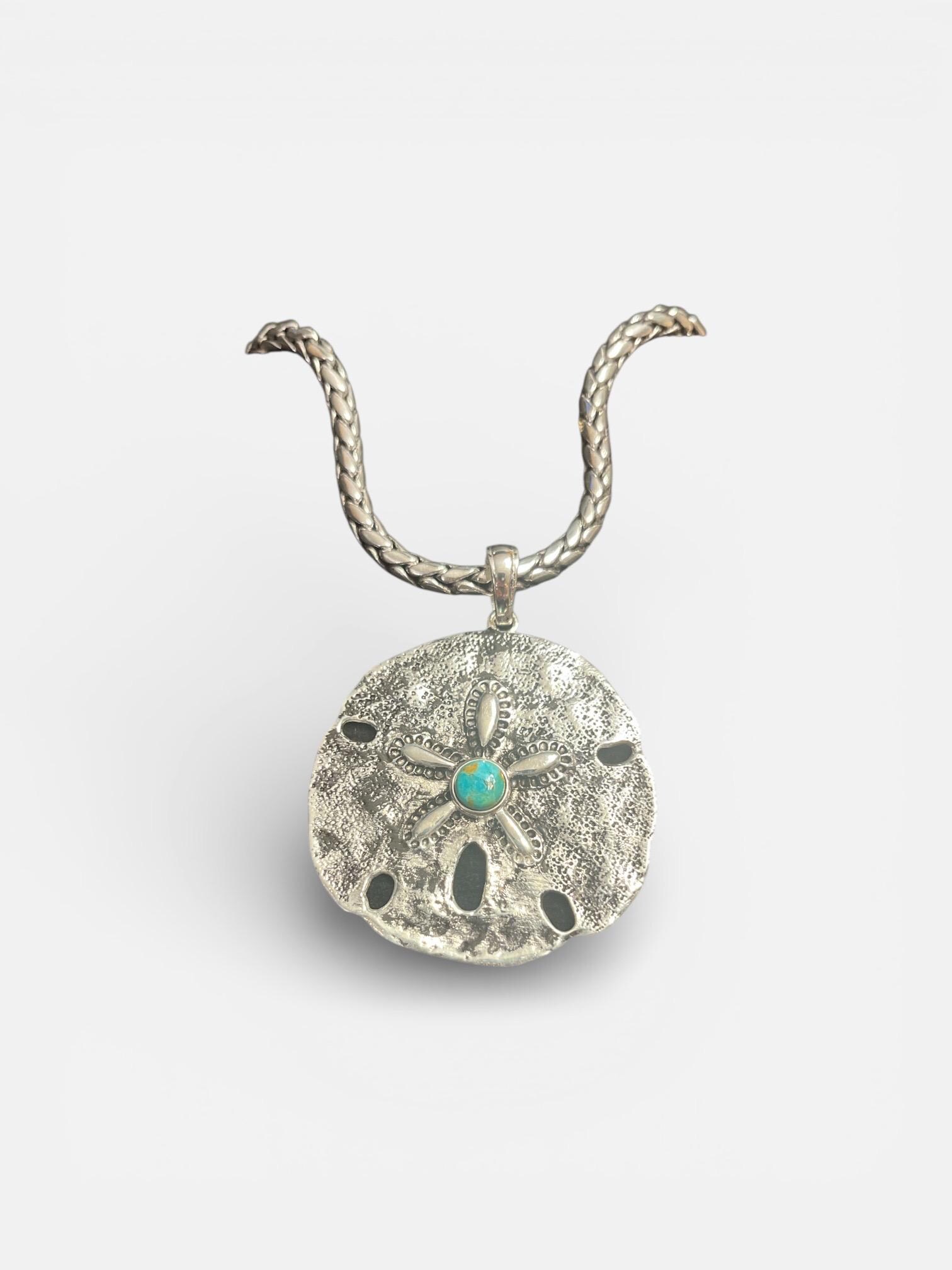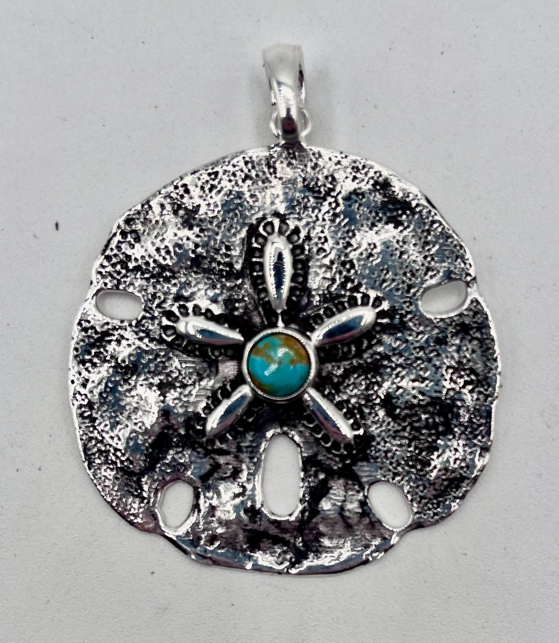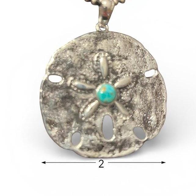 Experience the allure of southwest artistry with this handcrafted sand dollar pendant, a true celebration of natural beauty and cowboy charm. Featuring a genuine Kingman turquoise centerpiece set in pure white brass, this unique cowboy charm brings a touch of desert style to any outfit. Perfect for those who cherish handmade jewelry and distinctive accessories.