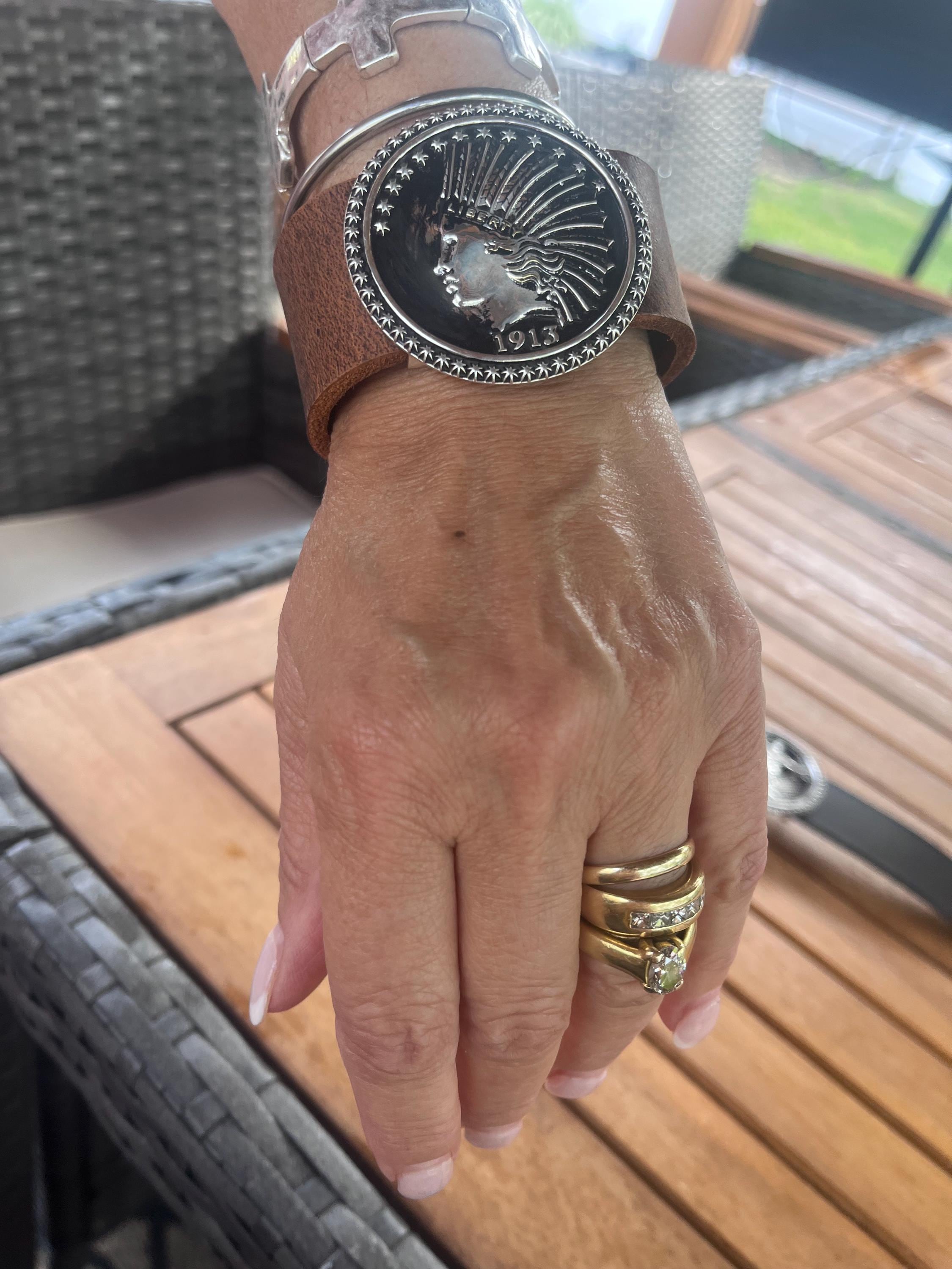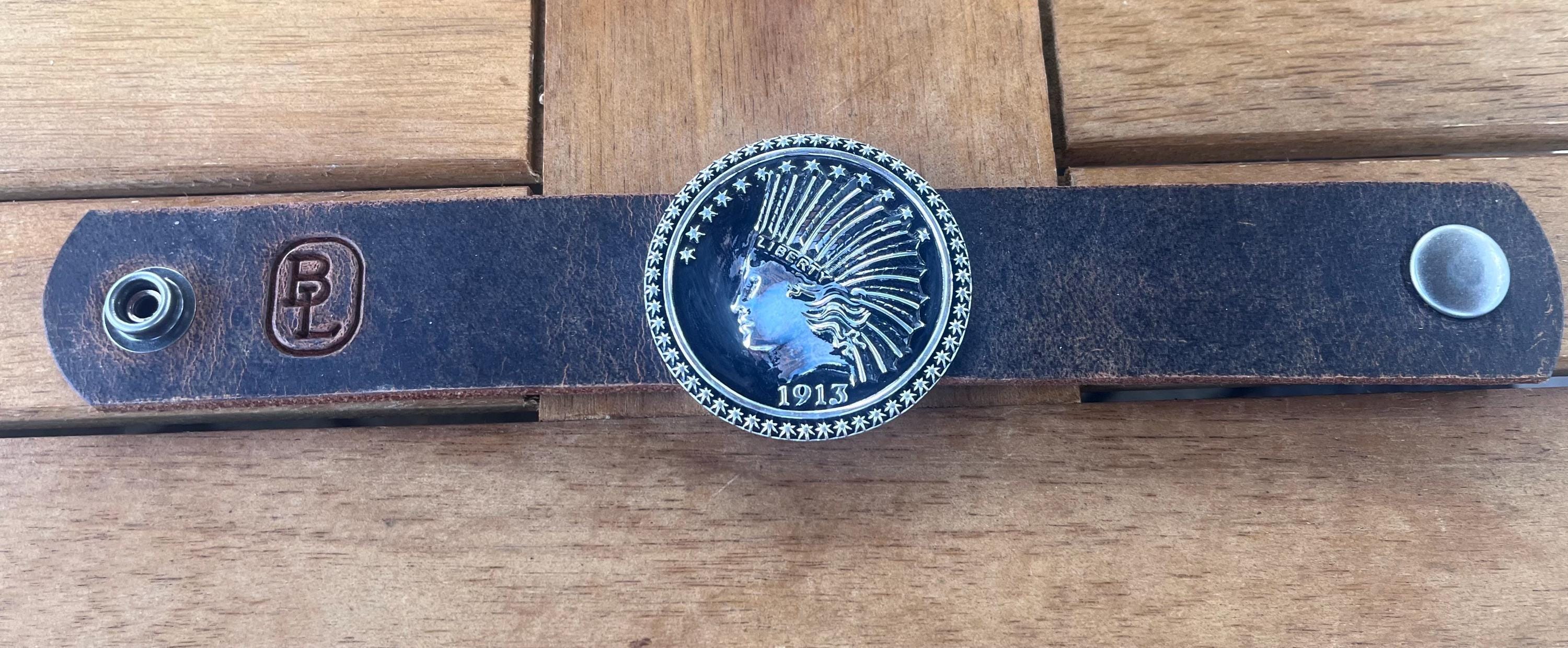 Discover the timeless allure of this artisan crafted cuff, inspired by the rich heritage of White Brass Indian design and featuring a commemorative dollar leather cuff centerpiece. Handmade with care by Bonfe Leather Workshop in Patchogue, NY, this piece beautifully blends rustic boho jewelry elements with ethnic style jewelry traditions. Perfect as a unique gift for him, this gold tone accessory captures both history and craftsmanship in one stunning leather cuff.
