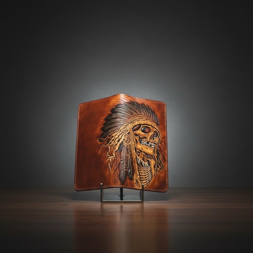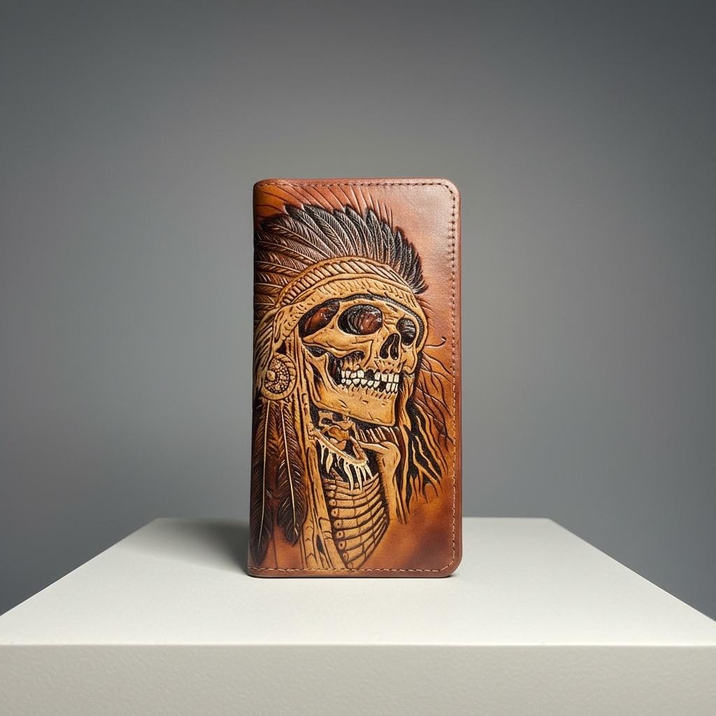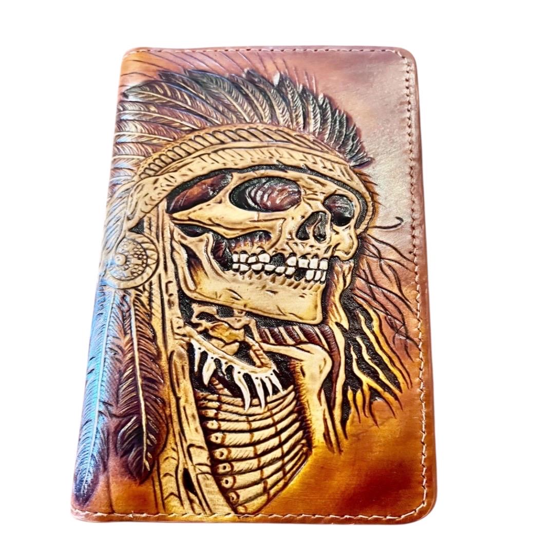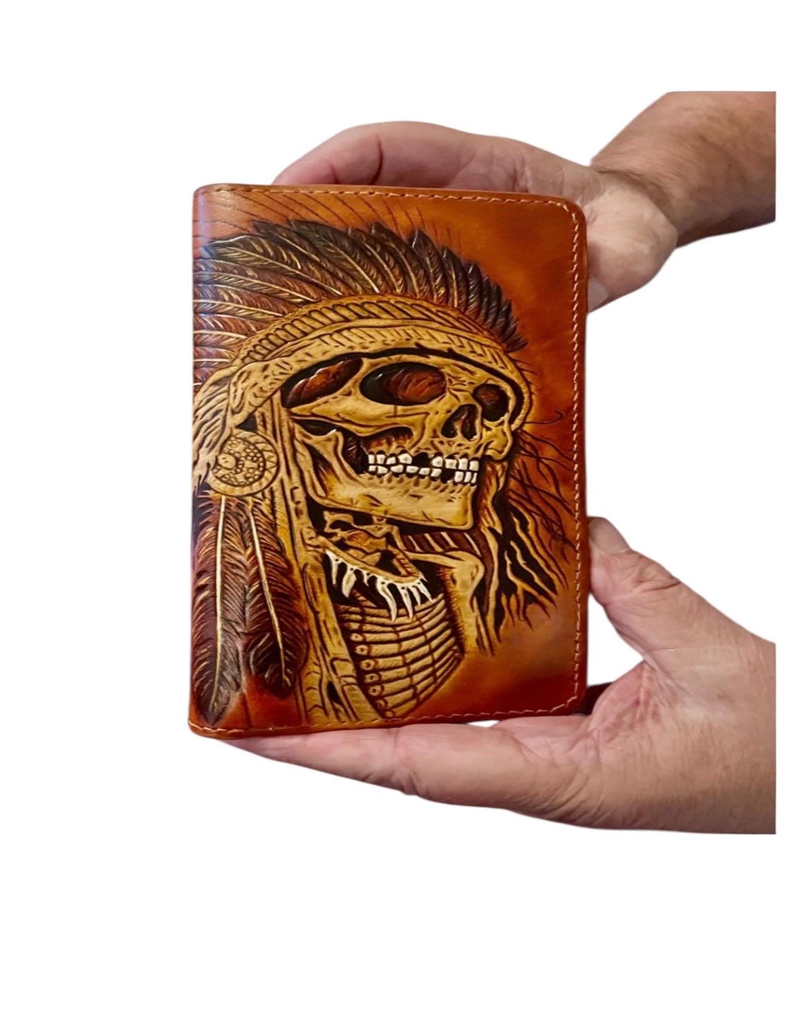 Step into the world of rugged biker style with this hand carved leather wallet, designed to capture the bold spirit of the Indian skull wallet tradition. Featuring a striking skull design chain, this piece blends heritage artistry with functionality, perfect for those who value genuine craftsmanship. Each wallet is a unique statement, crafted to embody strength and secure carrying on every ride.