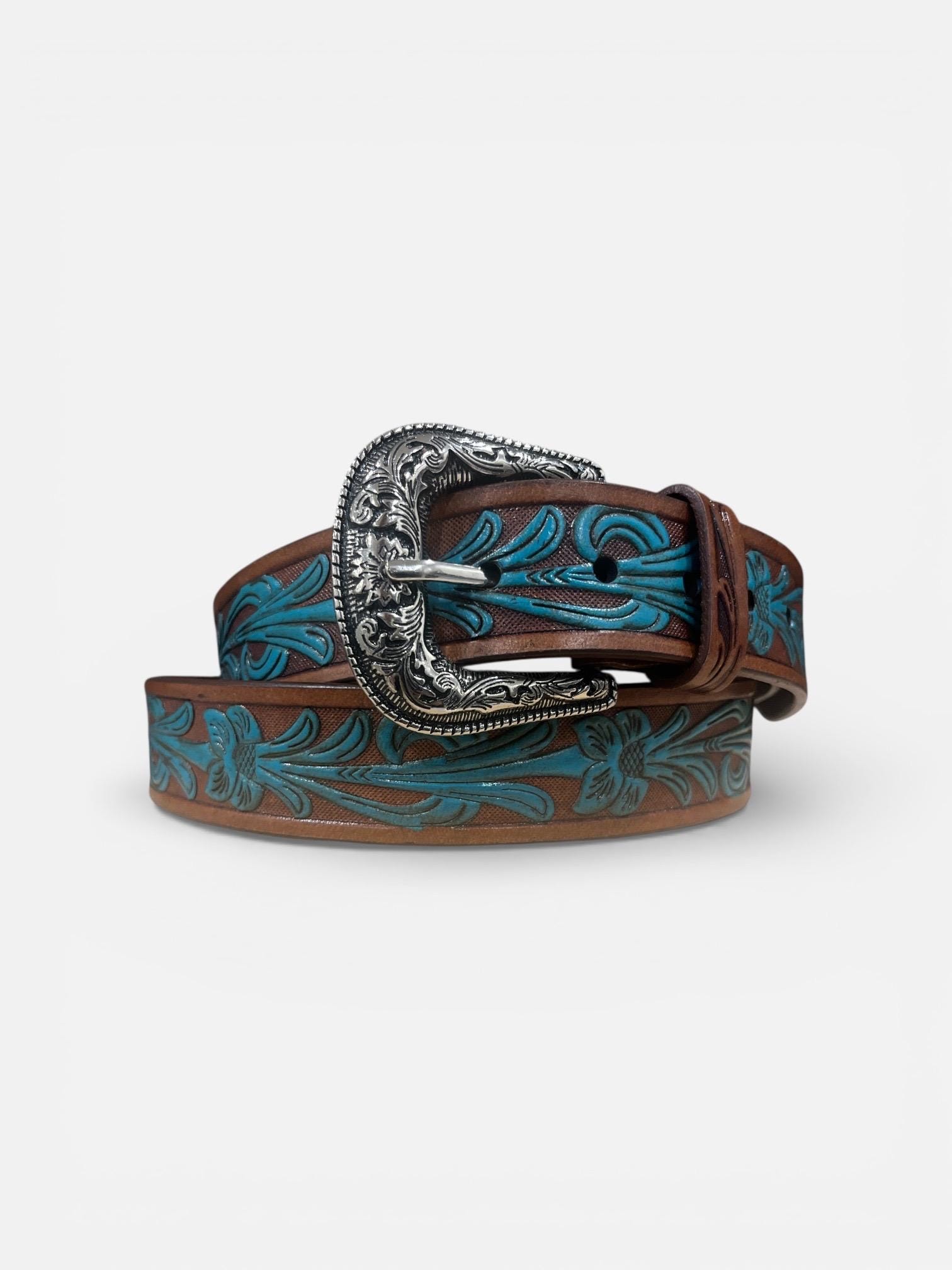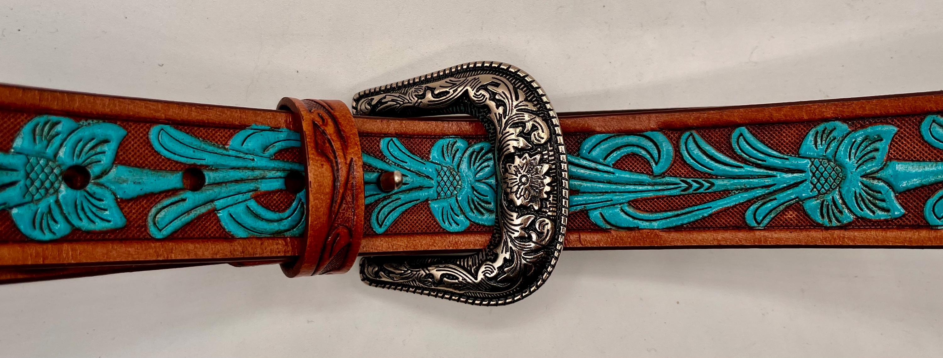 - Crafted from high-quality leather featuring hand-carved turquoise and brown detailing