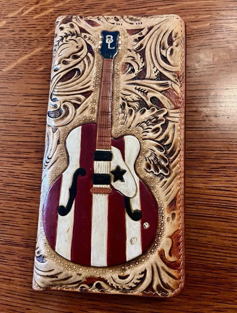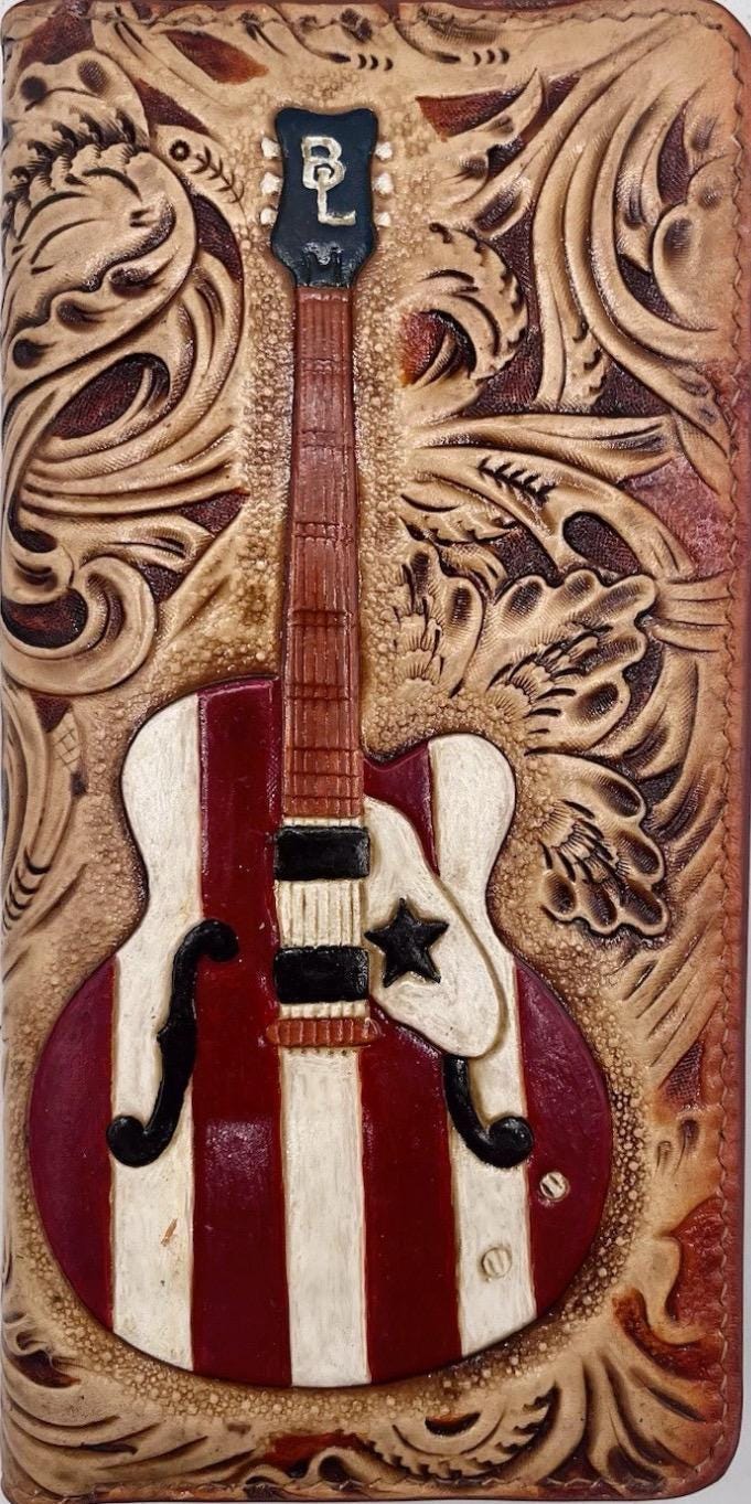 Inspired by the rich heritage of Gibson guitars, this men's long wallet is a masterpiece for any music lover or fan of stylish accessories. Hand carved leather meets a custom brass trigger snap chain, creating a unique guitar wallet that blends artistry with everyday function. Whether searching for a musician gift idea or a premium leather gift, this wallet offers timeless appeal and secure elegance.