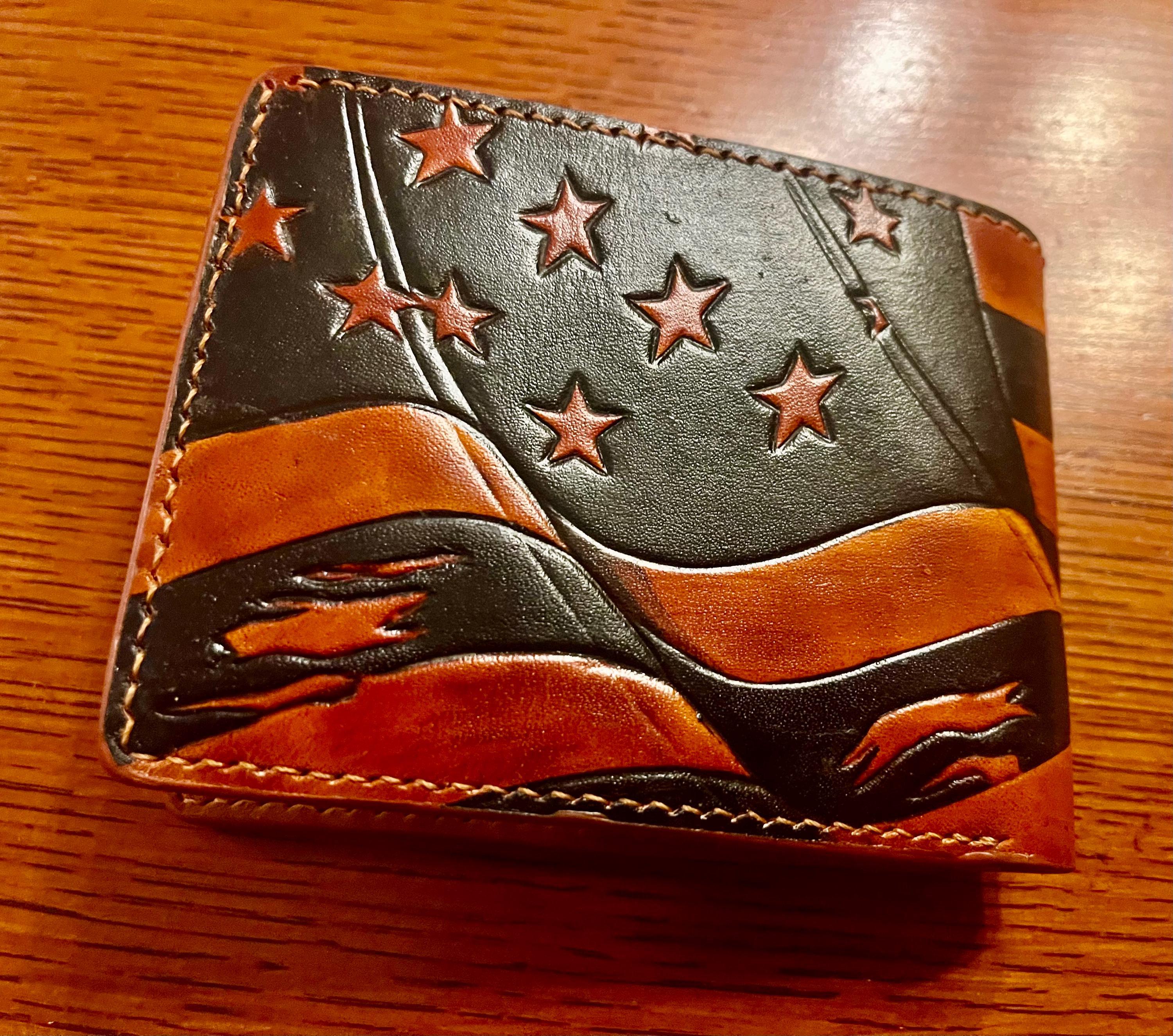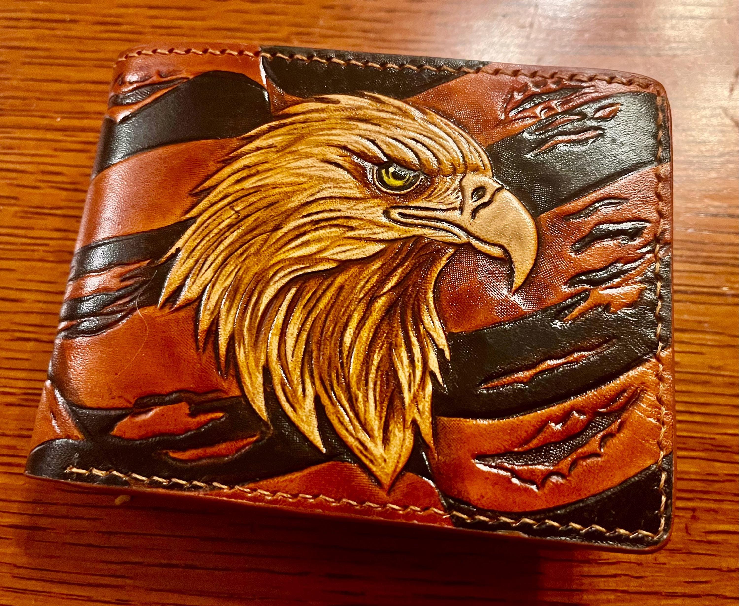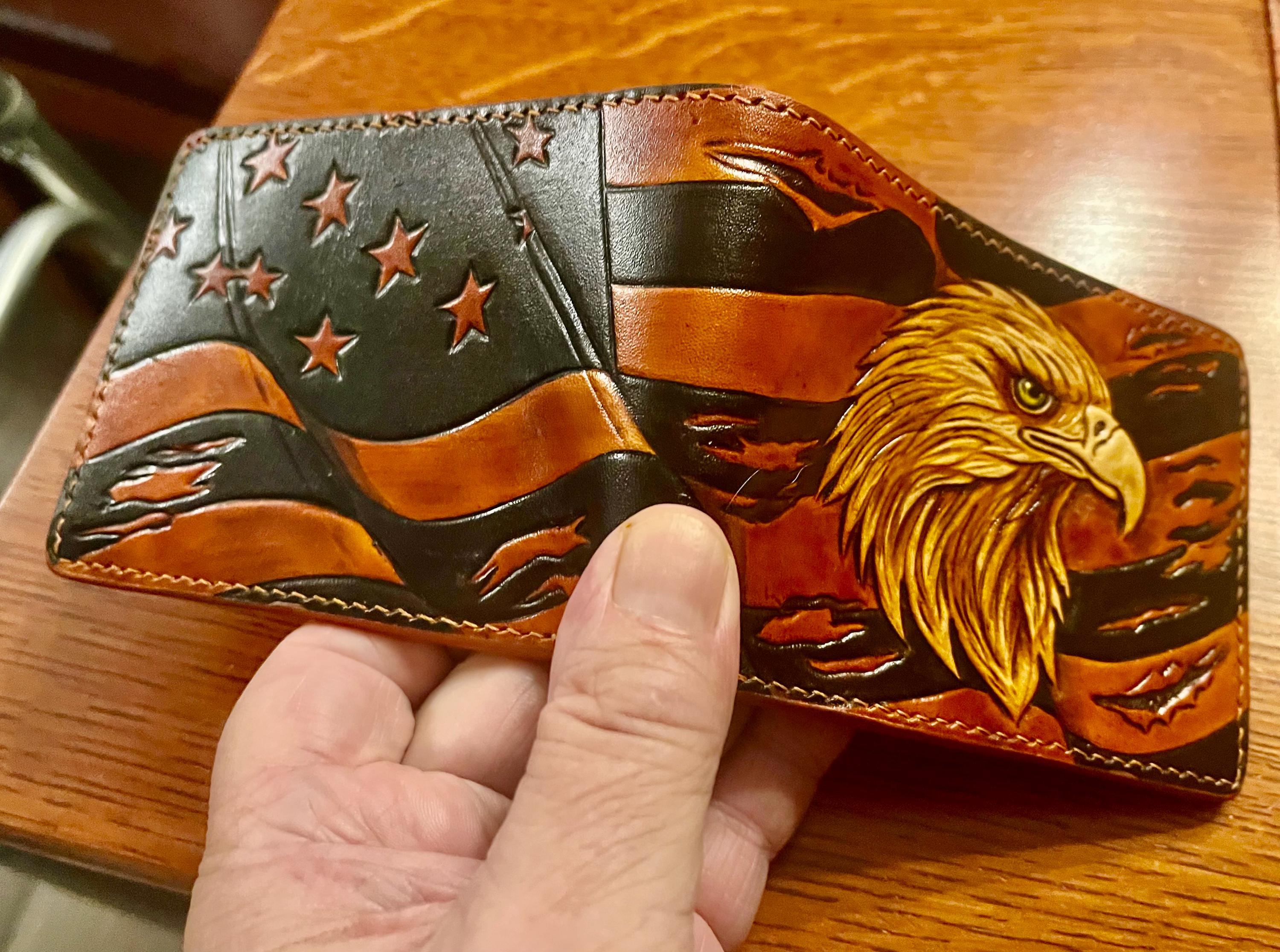 Experience the spirit of craftsmanship with this hand carved eagle and flag leather wallet, a true symbol of American pride and artisanal skill. Each billfold card holder is thoughtfully designed and crafted in Patchogue NY, blending functionality with a unique eagle flag design that makes it a standout men's stylish wallet. Whether you're searching for a leather wallet gift or a distinctive accessory for yourself, this piece embodies quality and tradition.