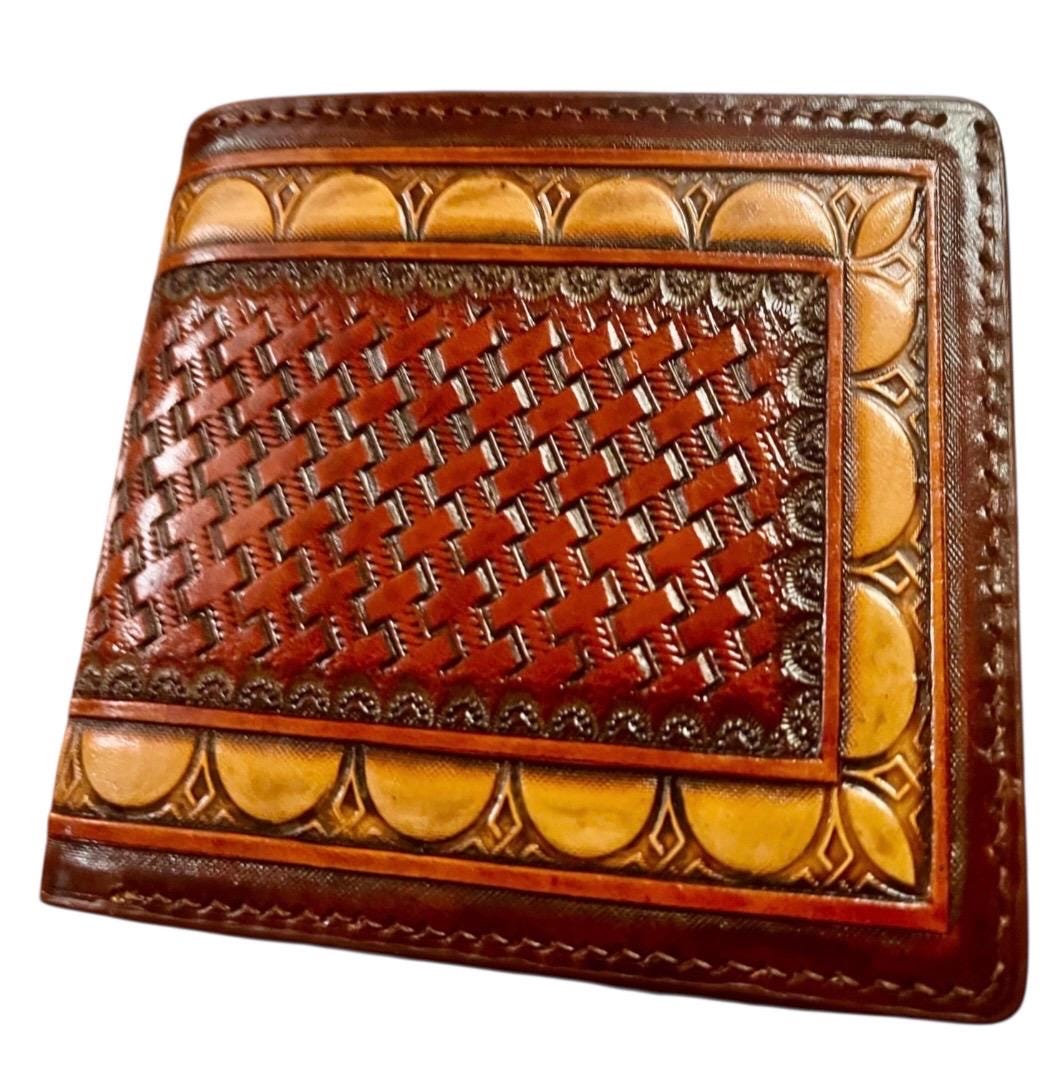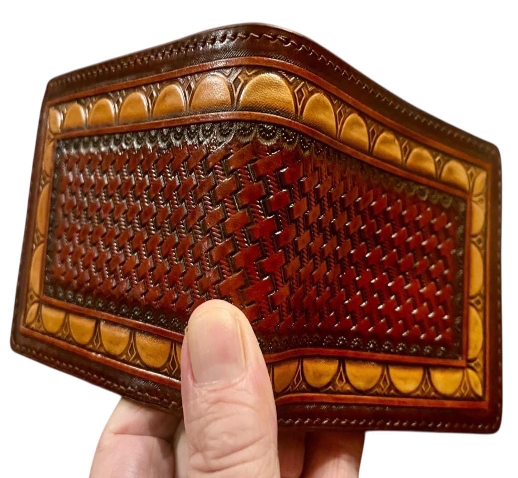 Experience the enduring elegance of a hand carved leather wallet, crafted with care in Patchogue, NY. This basketweave billfold blends artisanal skill and classic design, making it the perfect gift for him who values timeless style and quality. Each piece tells a story through its hand carved artistry, reflecting decades of expert craftsmanship.