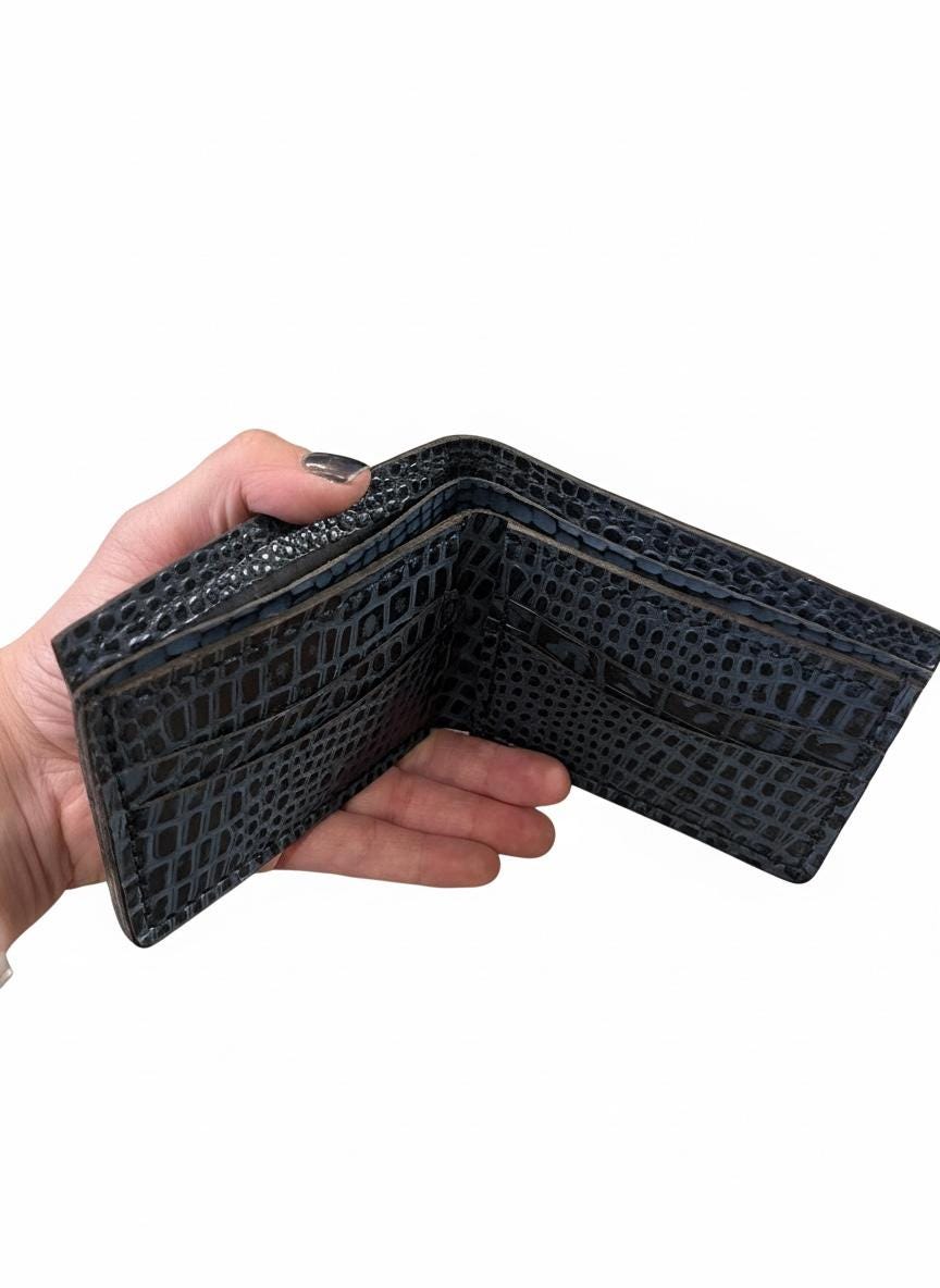 Experience the refined charm of this men's wallet, meticulously handmade by an artisan with over 50 years of expert leather craft. Featuring a distinctive two tone black finish, this wallet is designed for refined everyday use, blending timeless style with practical durability. Whether you're seeking a gift for him or a lasting accessory for yourself, this piece stands out with its unique craftsmanship and elegant appeal.
