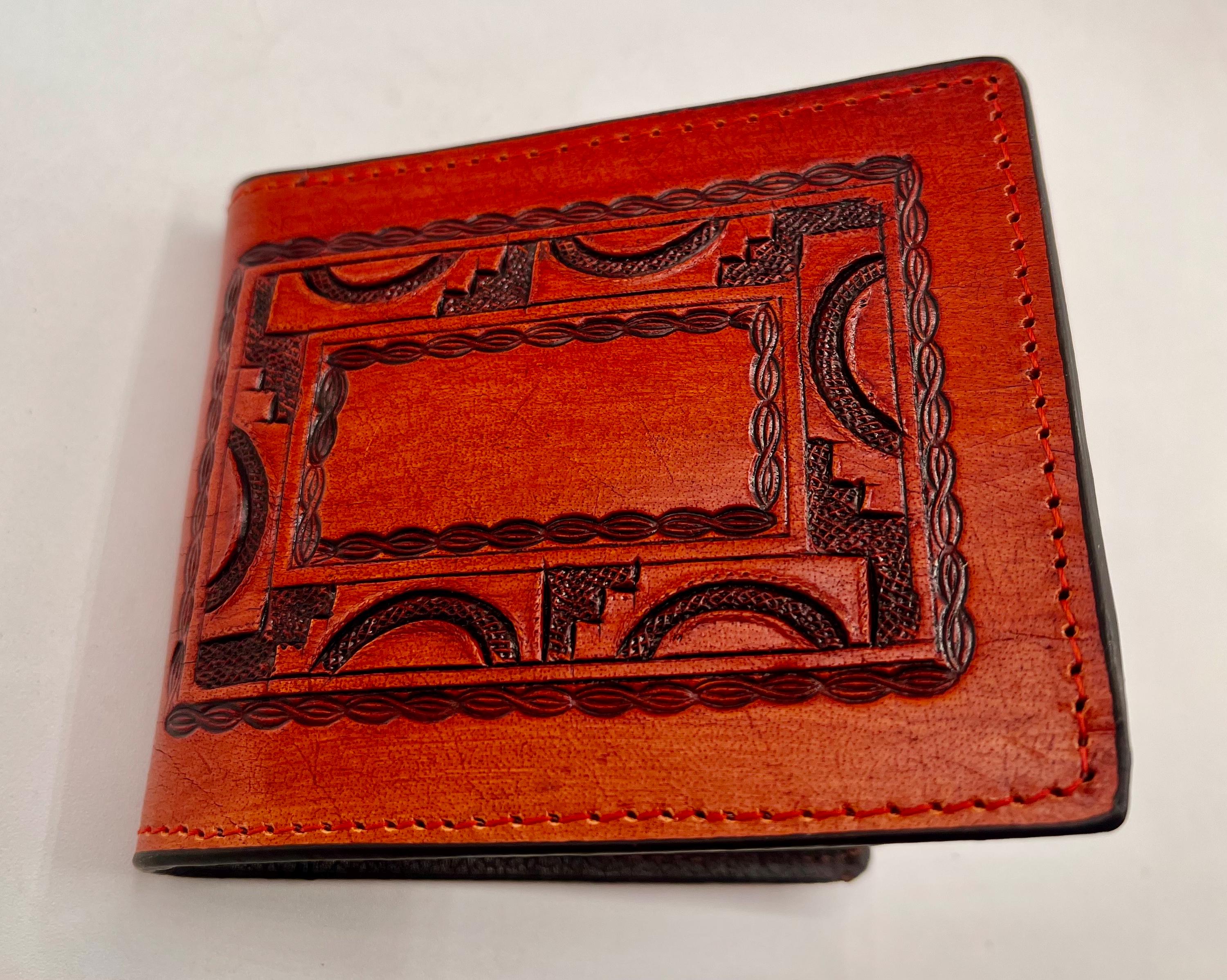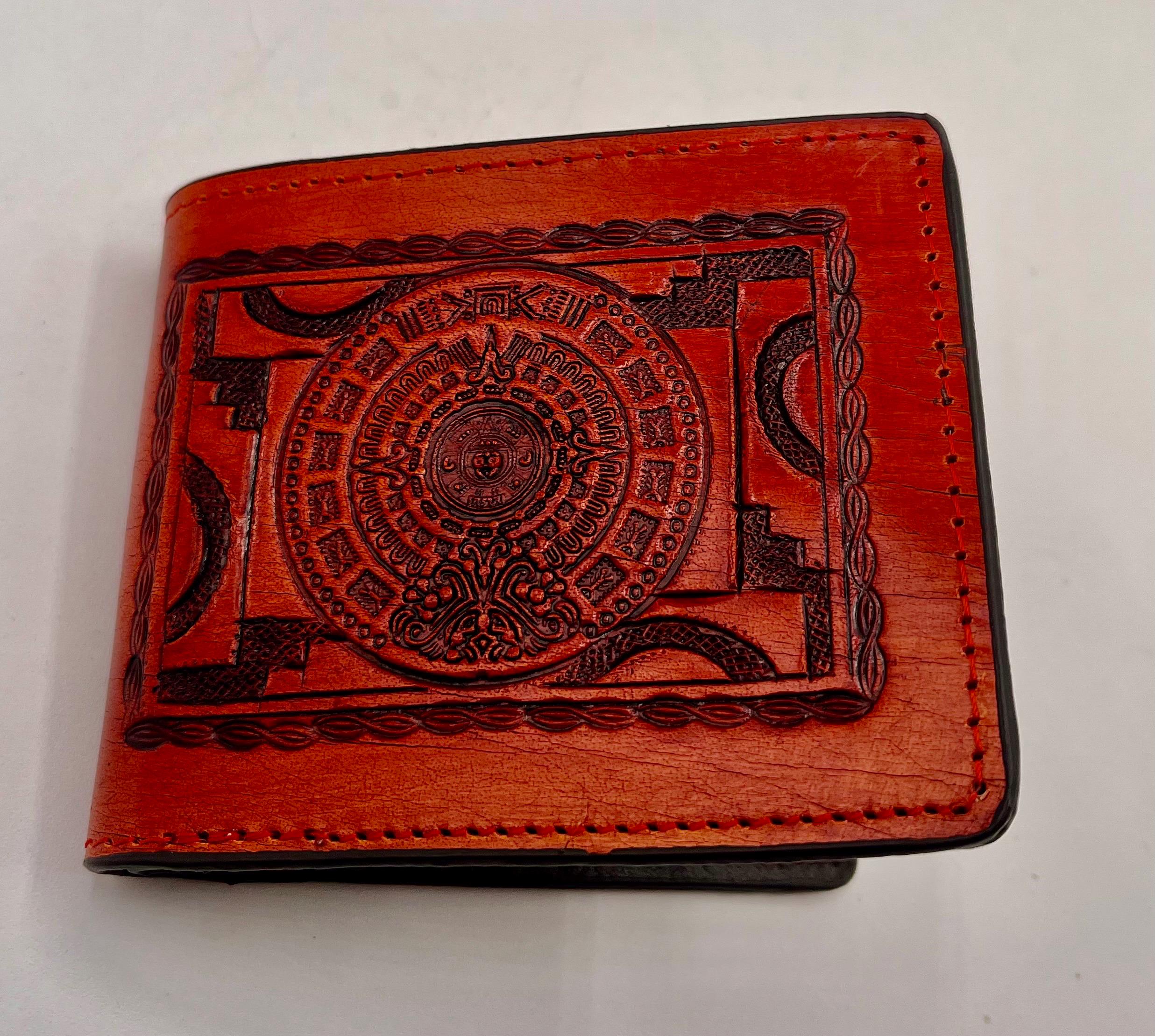 Experience the artistry and heritage embedded in this men's leather wallet, featuring a hand carved Montezuma Aztec calendar design that captures the spirit of ancient craftsmanship. This slim billfold wallet is tailored for those who value both style and functionality, making it a perfect addition to your everyday carry. Whether you're seeking a luxury mens billfold or a meaningful gift for him, this wallet blends timeless elegance with practical design.