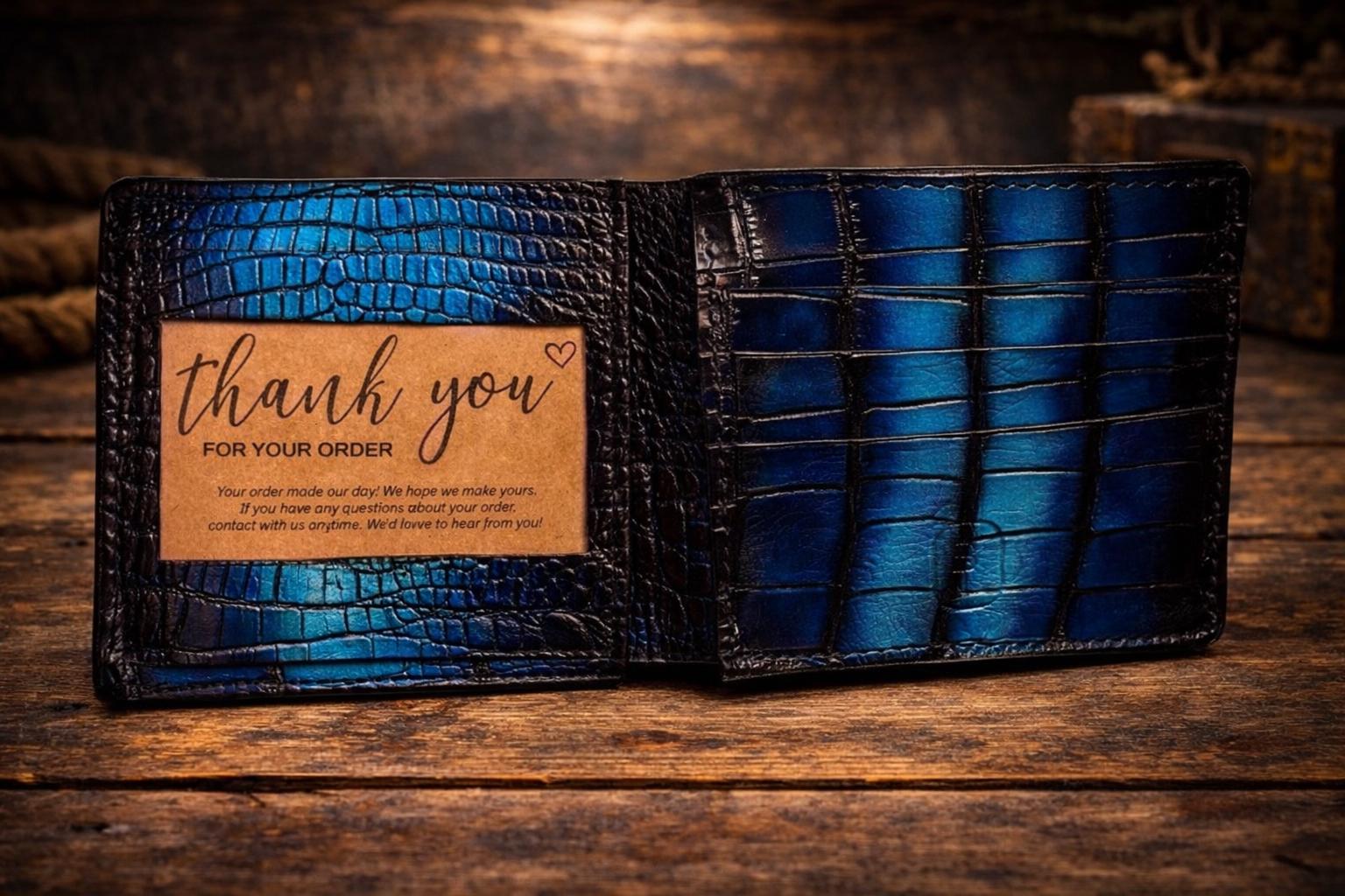 Experience the refined craftsmanship of a men's handmade wallet that beautifully blends style with practicality. This black and blue two tone wallet, crafted from genuine American alligator leather, offers a striking yet timeless look perfect for everyday use. Designed with care in Patchogue, NY, it reflects decades of expertise and dedication to quality.