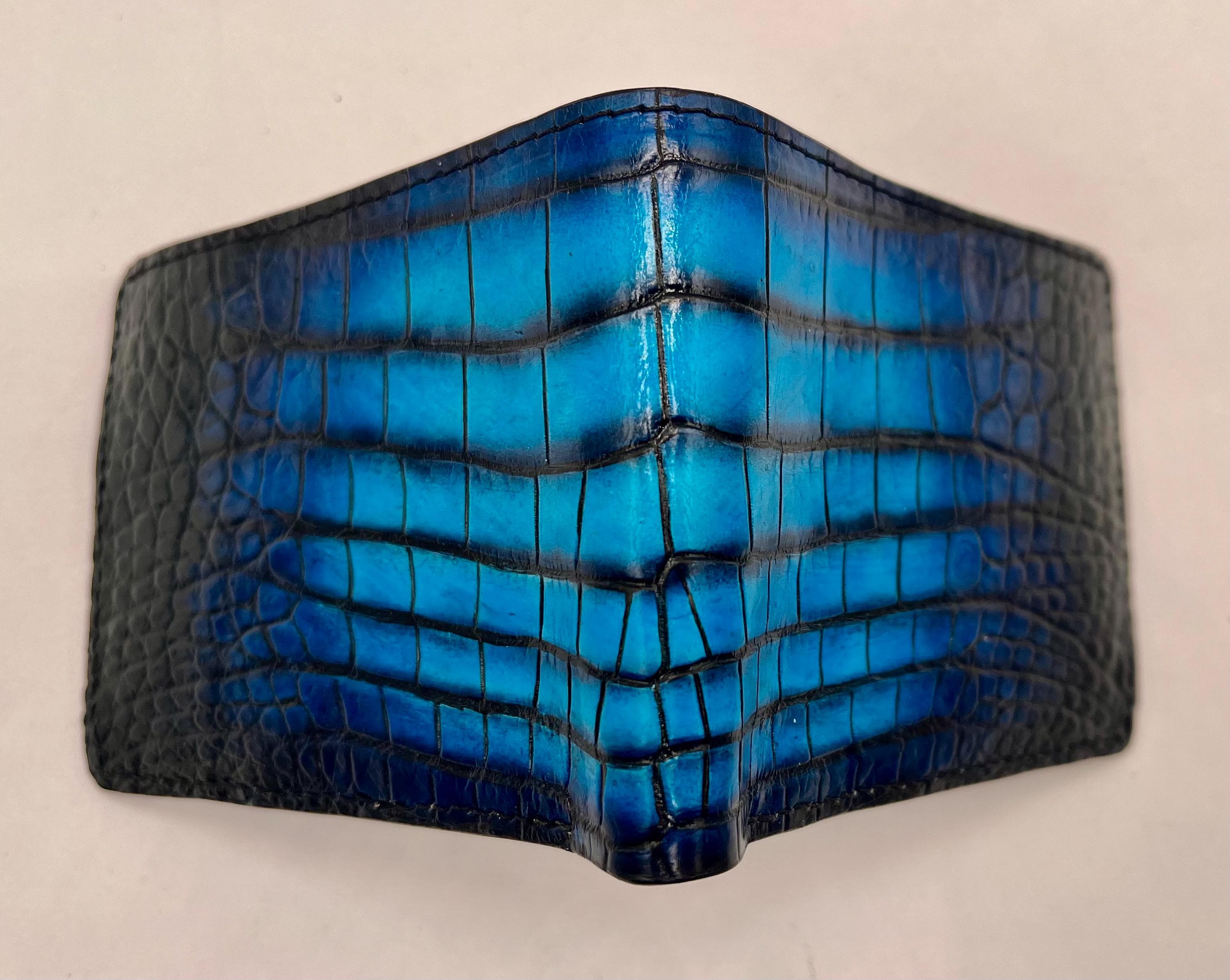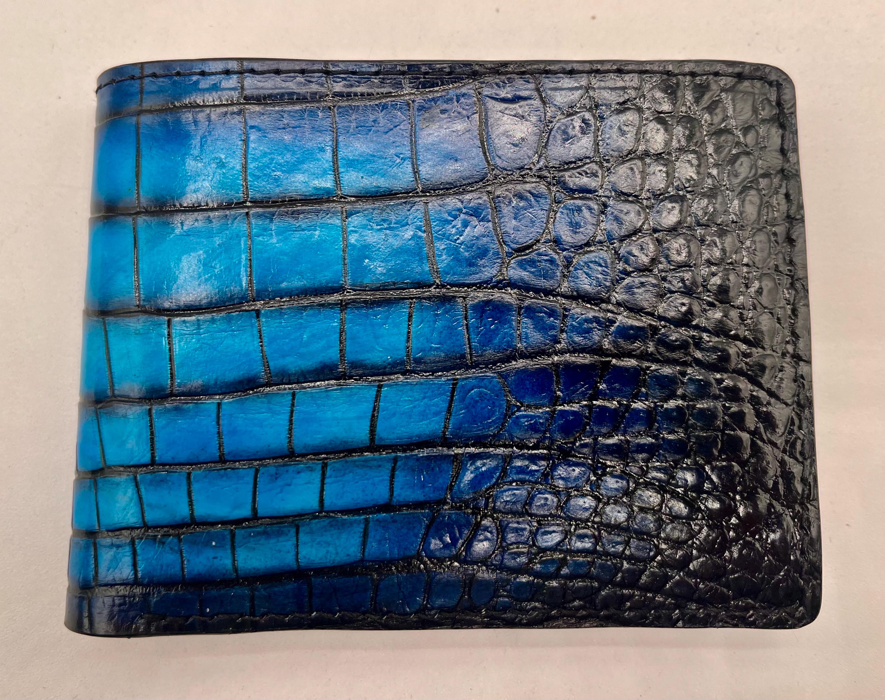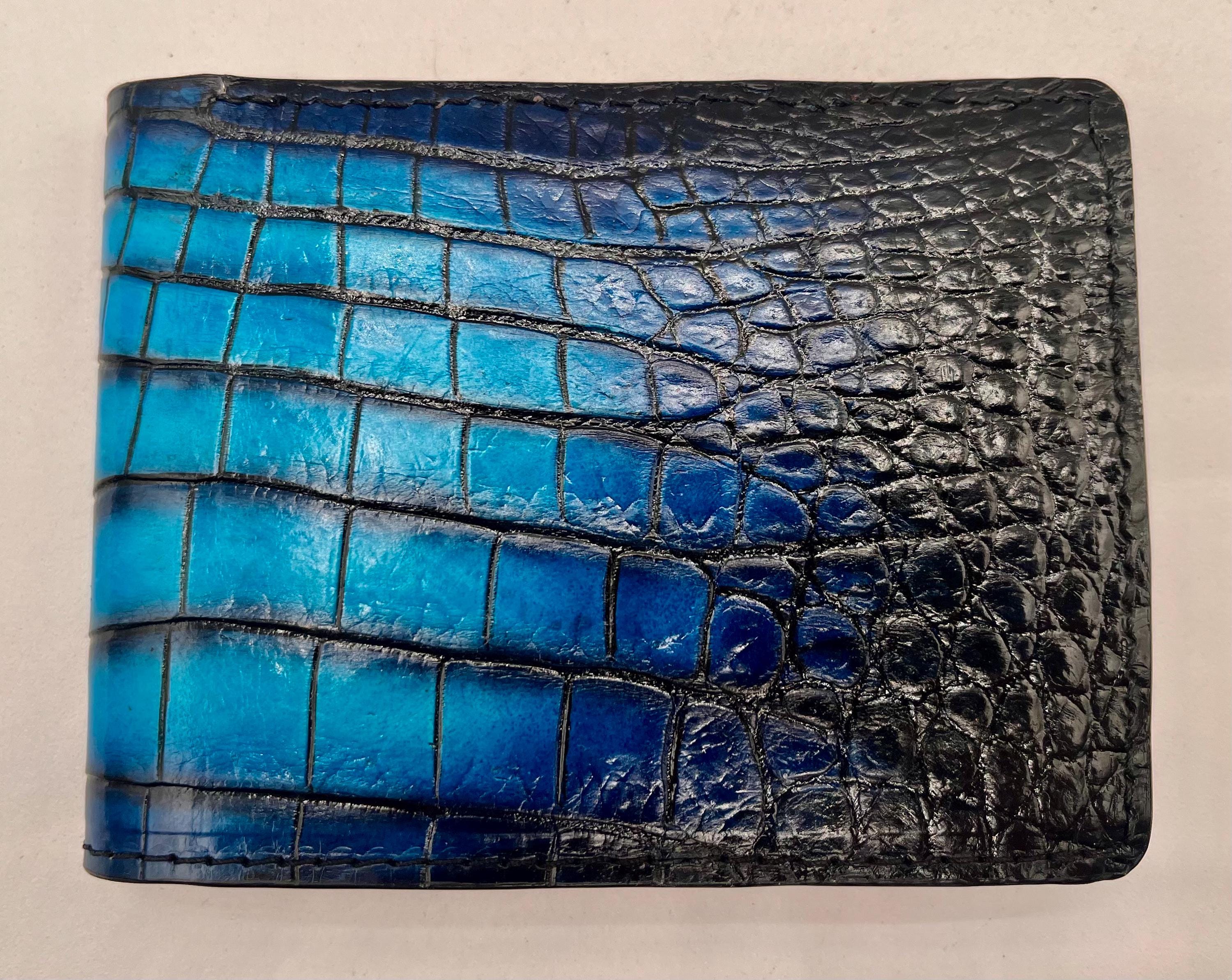 - Crafted from authentic American alligator leather featuring a distinctive black and blue two-tone finish