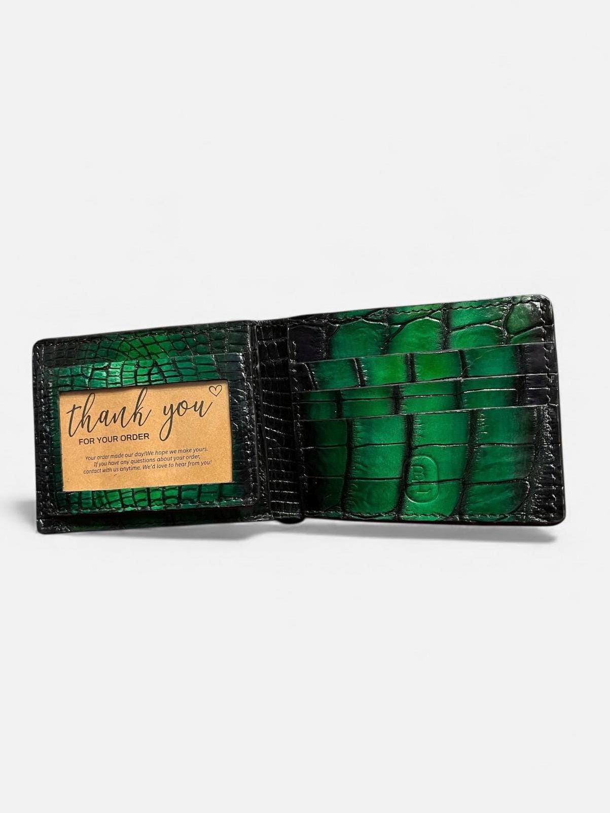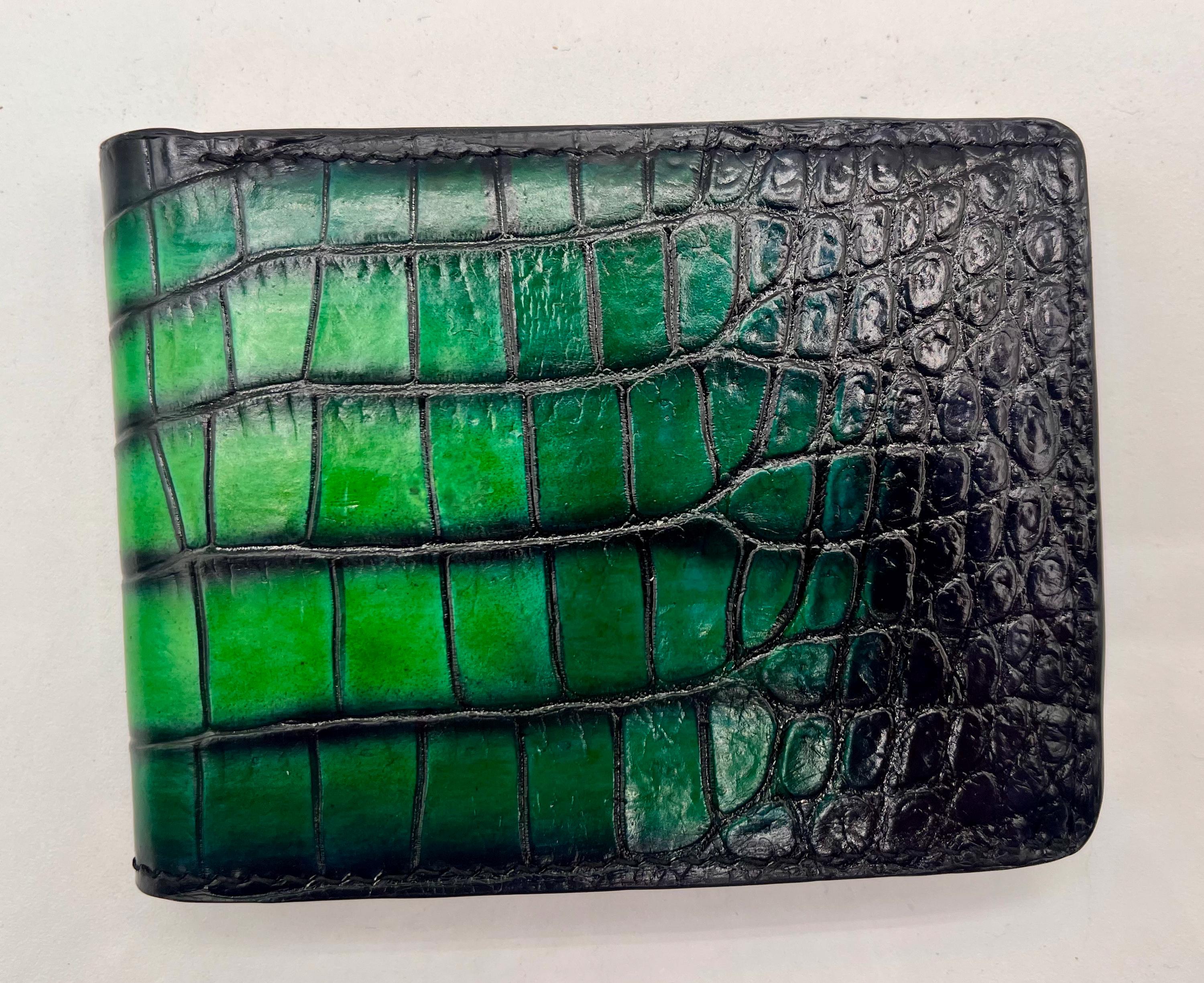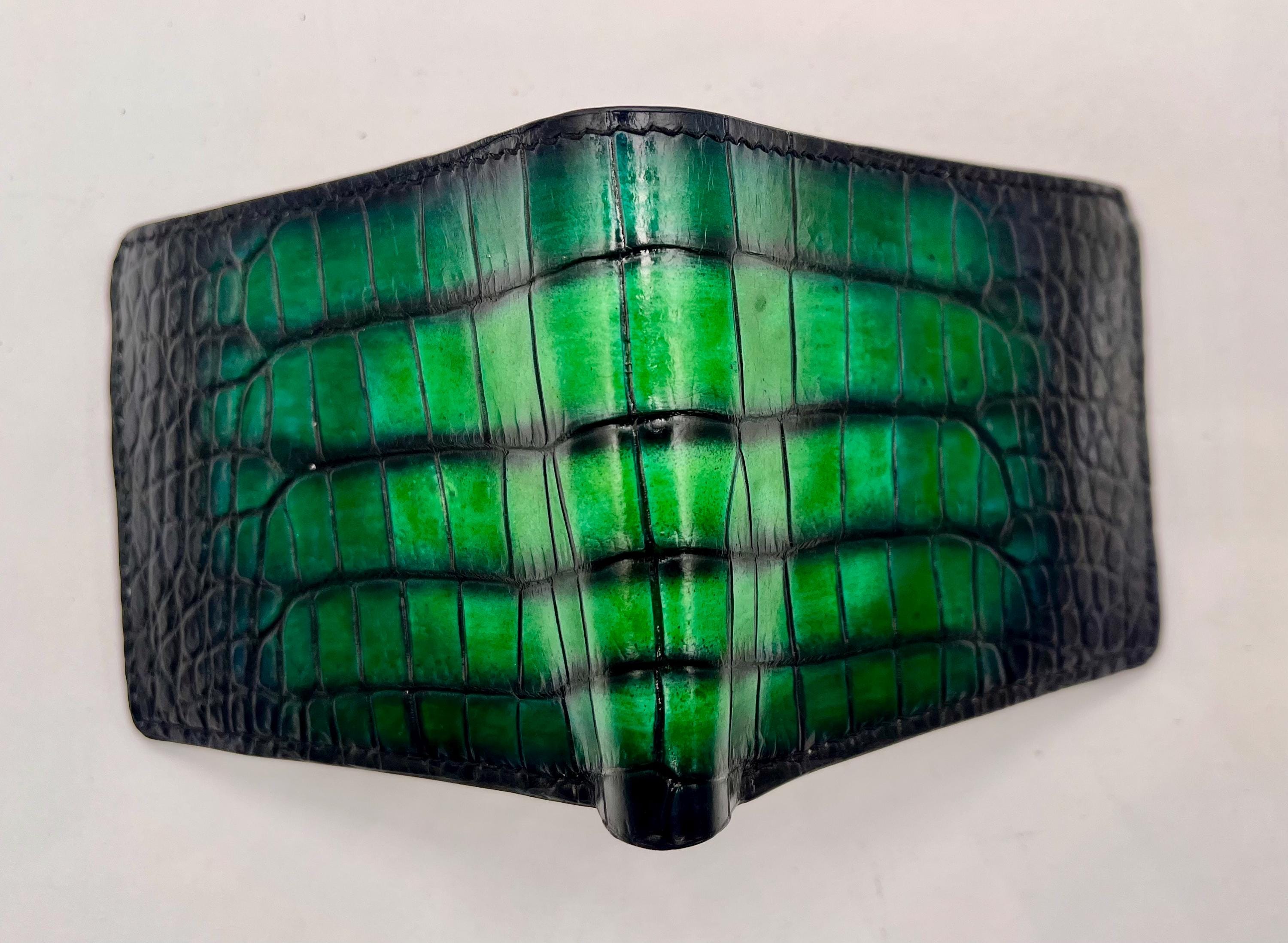 - Crafted from genuine American alligator leather showcasing a striking two-tone black and green finish