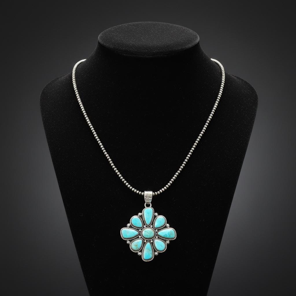 - Genuine sterling silver pendant set with nine authentic Kingman turquoise stones