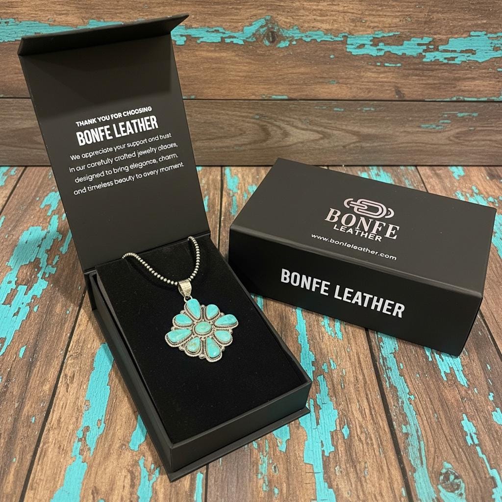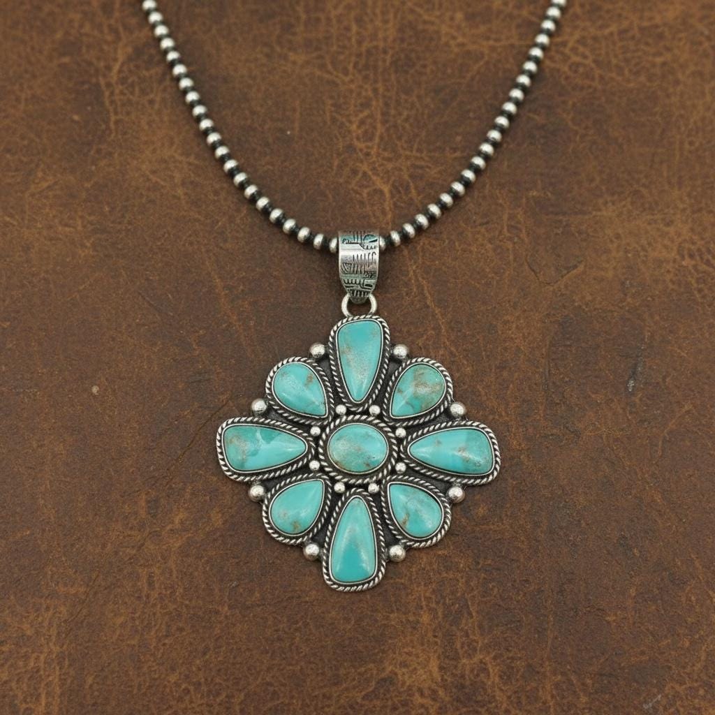Discover the captivating beauty of Southwest jewelry through this exquisite handmade pendant, featuring nine vibrant Kingman turquoise stones. Crafted with care in genuine sterling silver, this necklace blends timeless elegance with artisanal craftsmanship.