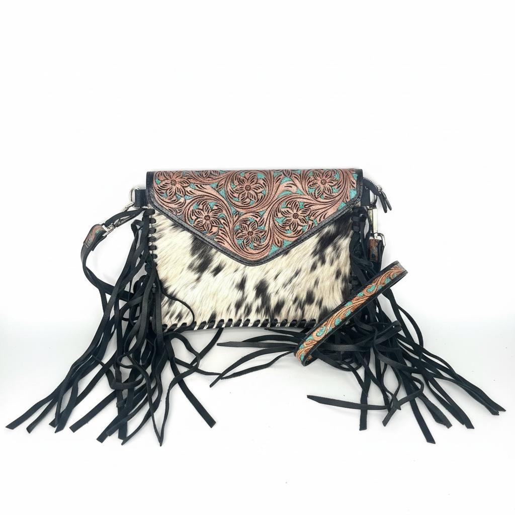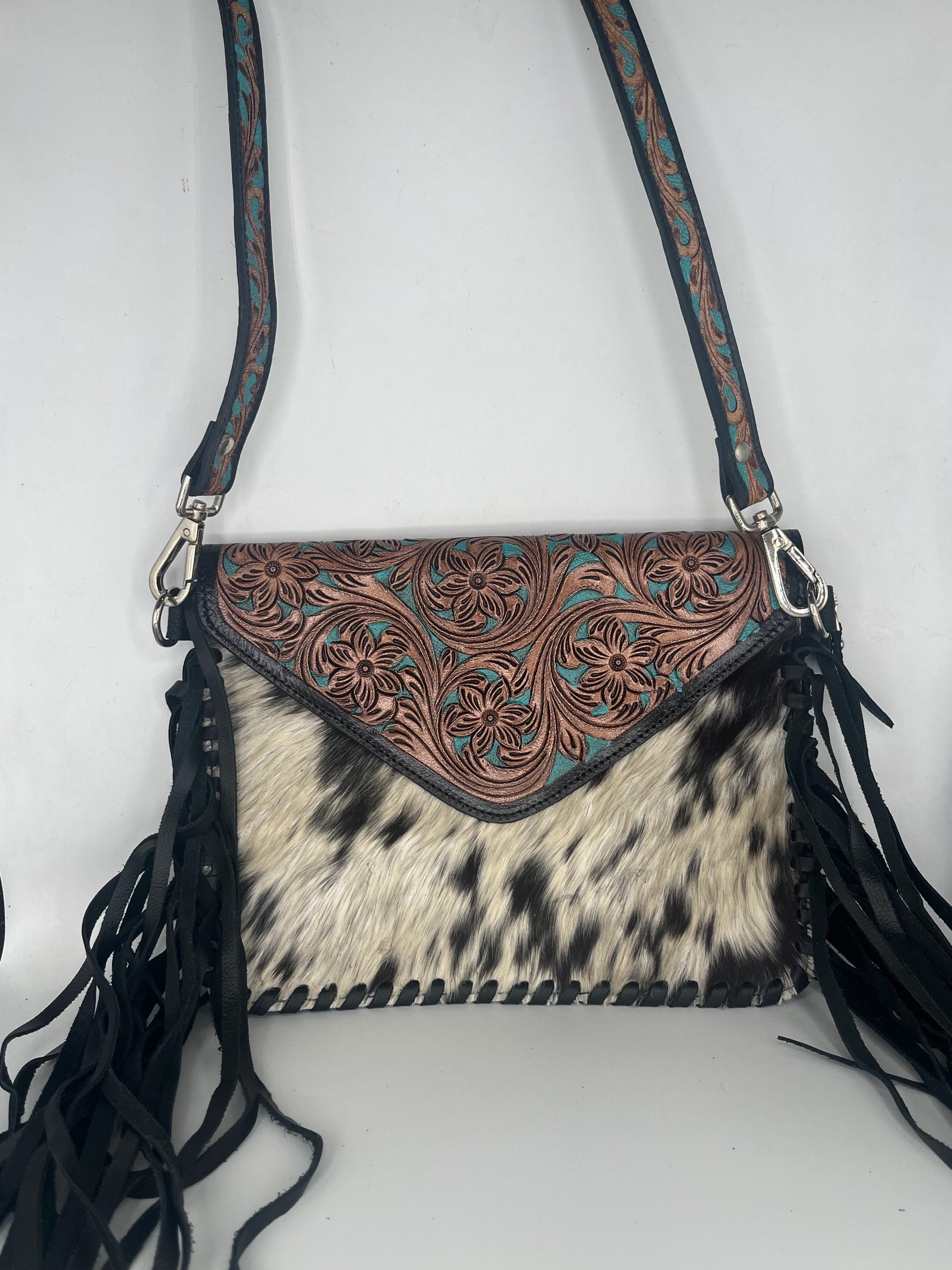Step into the world of timeless craftsmanship with this southwestern-inspired cross body sling bag, where skilled artisan work brings each detail to life. Featuring hand carved leather adorned with turquoise and tan accents and a cow hair base, this versatile sling bag blends tradition with everyday practicality. Whether for daily use or special occasions, this artisan crafted tote carries a story of heritage and dedication.