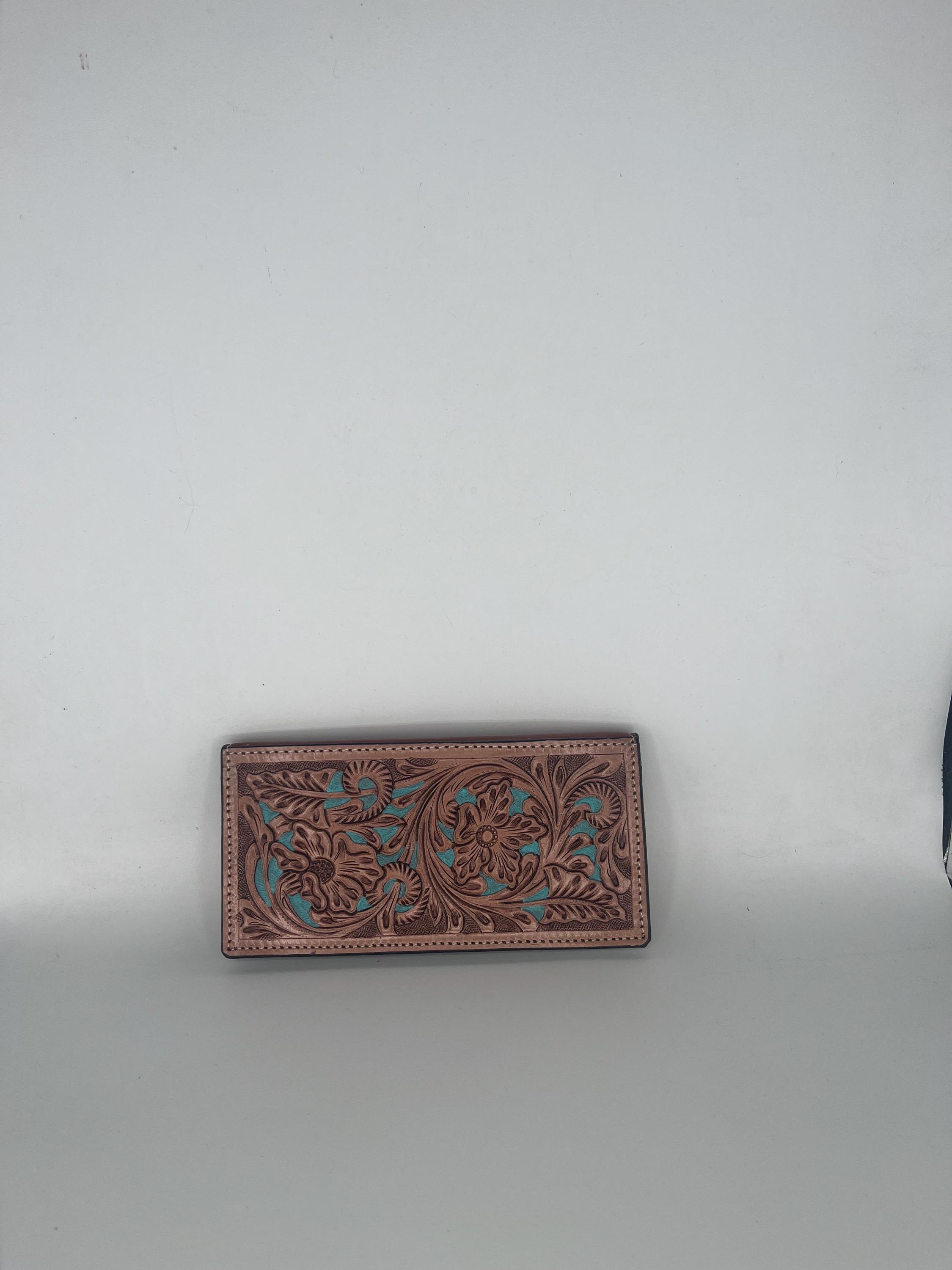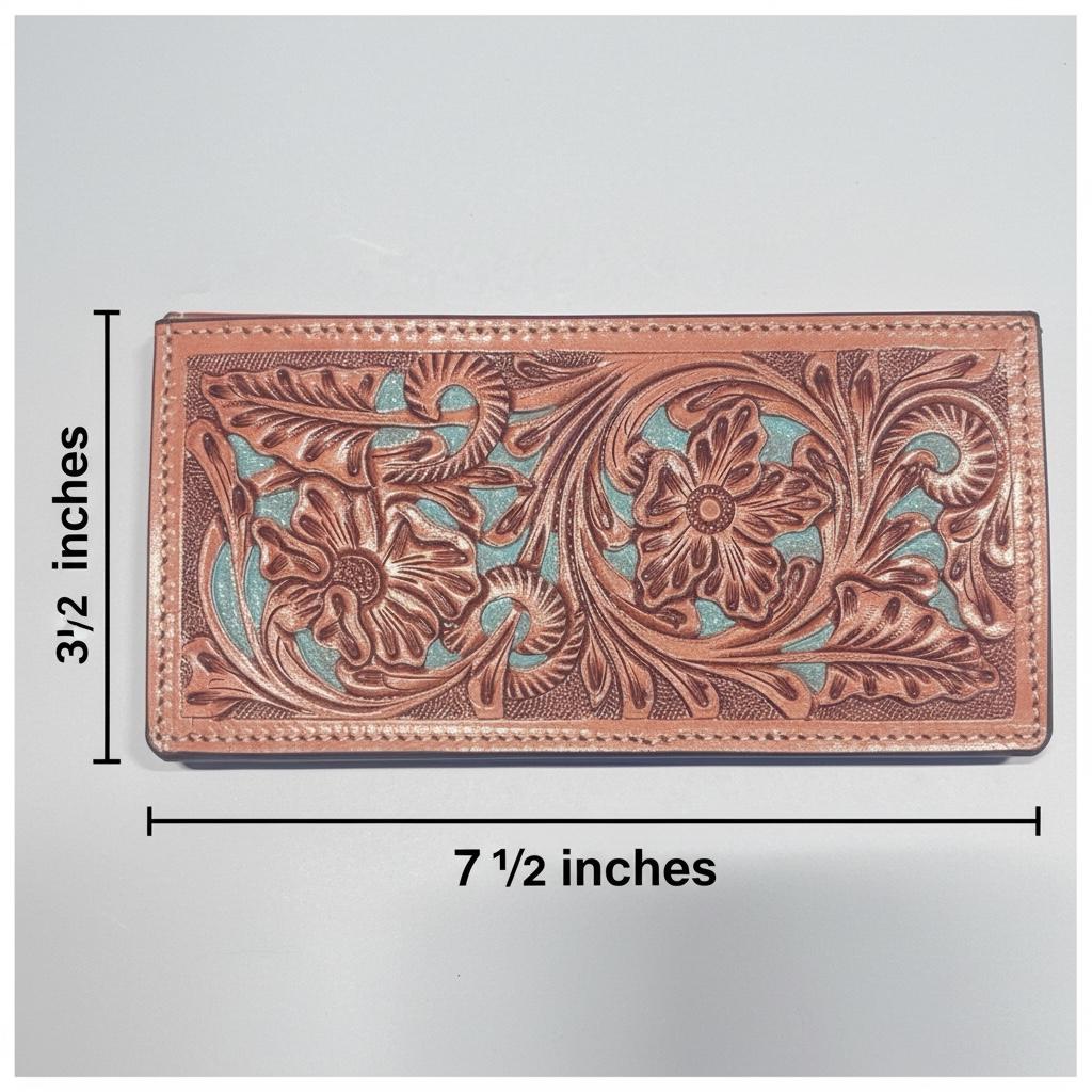 Hand-Carved Floral Leather Wallet – Western Tooled Bifold Wallet in Tan & Turquoise or Burgundy & Brown