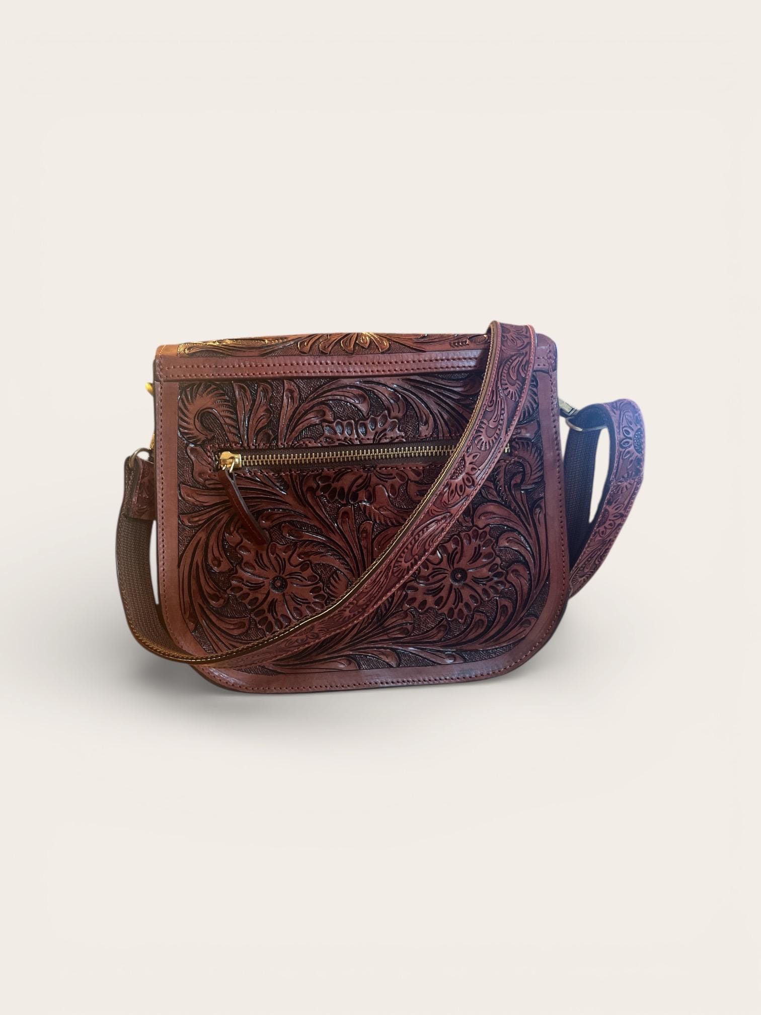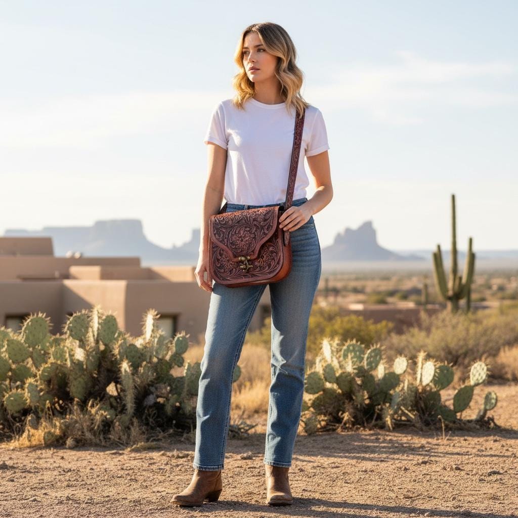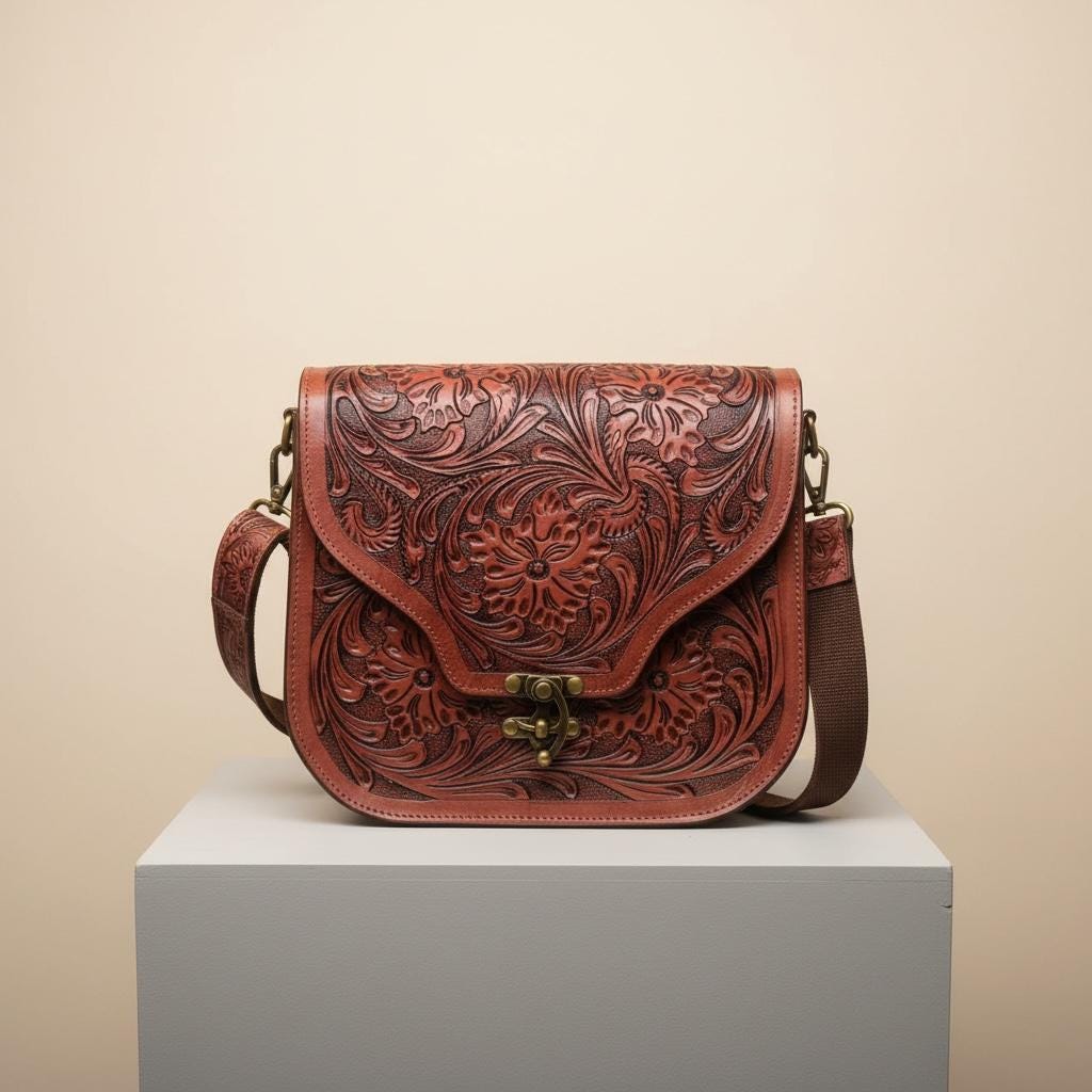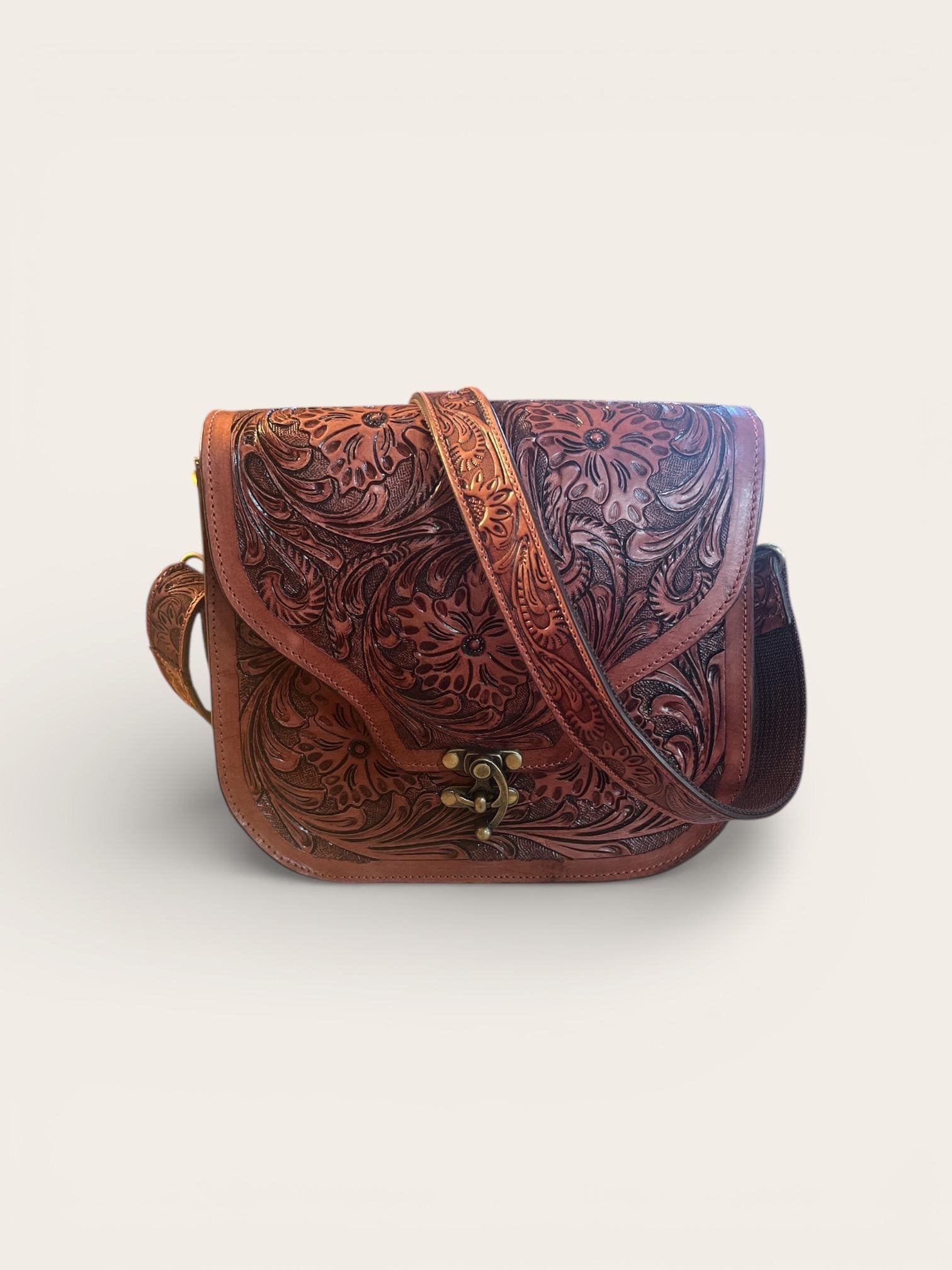 Step into the spirit of the Southwest with this beautifully hand carved purse, a true testament to artisan hand carved craftsmanship. Crafted from premium tan leather, this crossbody purse blends rustic western bag charm with everyday use practicality, making it a versatile addition to your wardrobe. Each piece tells a story of tradition and meticulous care, perfect for those seeking a unique, luxury leather goods experience.