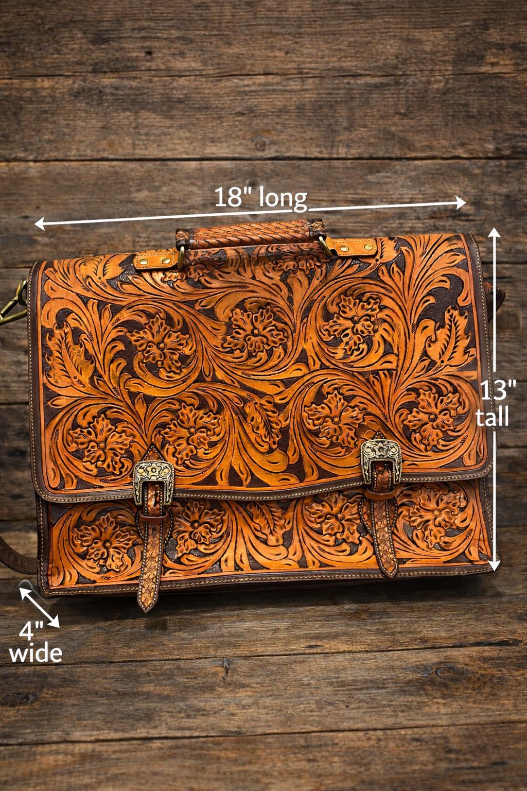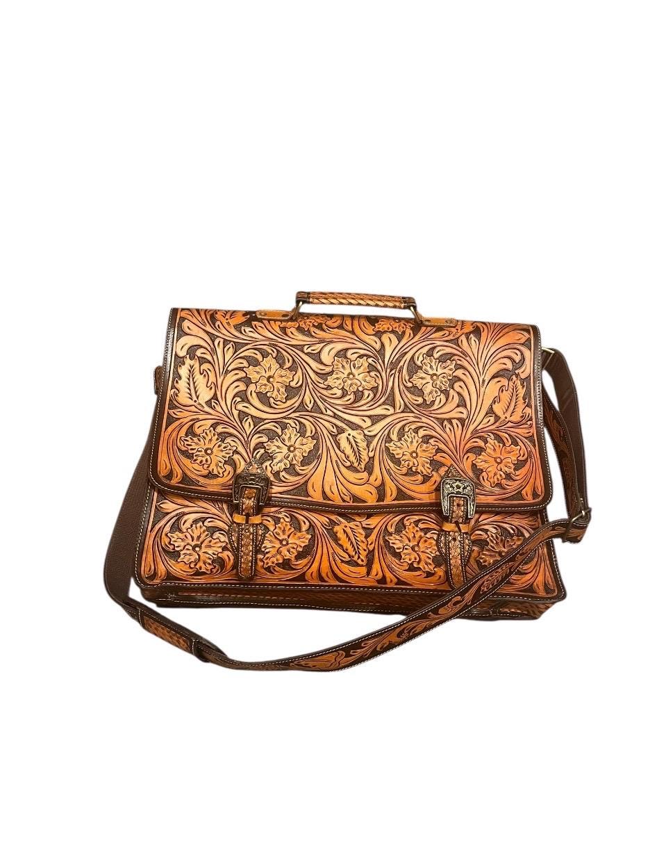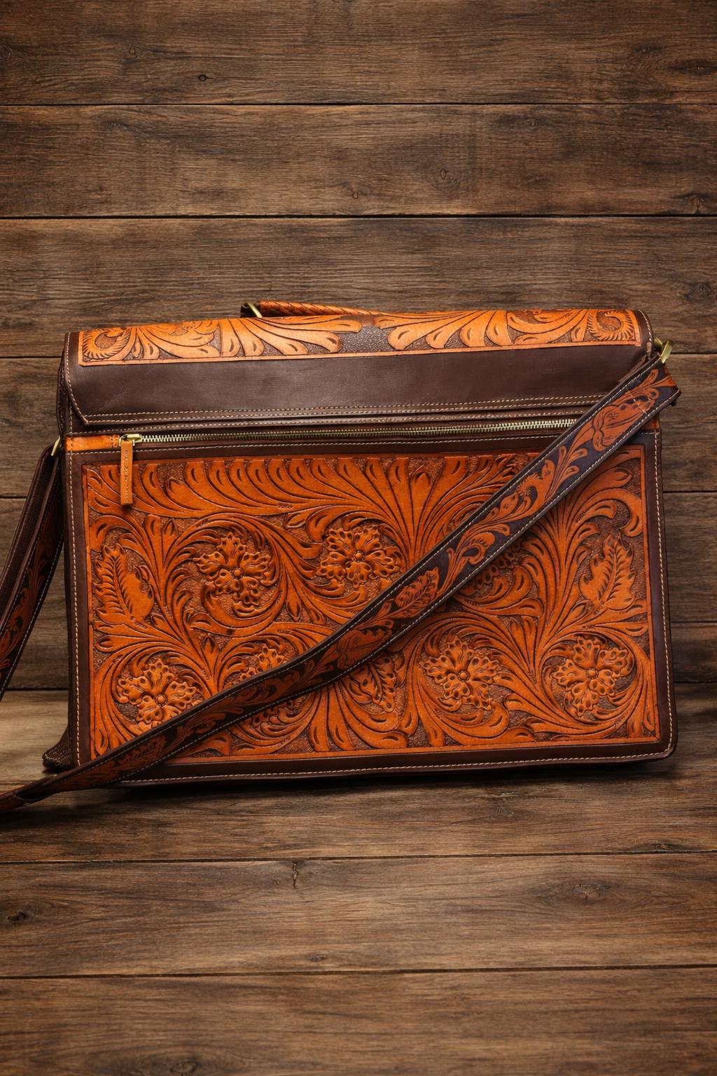 Discover the artistry behind our southwestern large leather laptop bag, where hand carved leather craftsmanship meets practical design. Each bag is a labor of love, meticulously tooled by expert artisans over the course of a week to create a unique messenger bag perfect for daily use. Whether you're a teacher or a professional, this laptop tote combines style and function seamlessly.