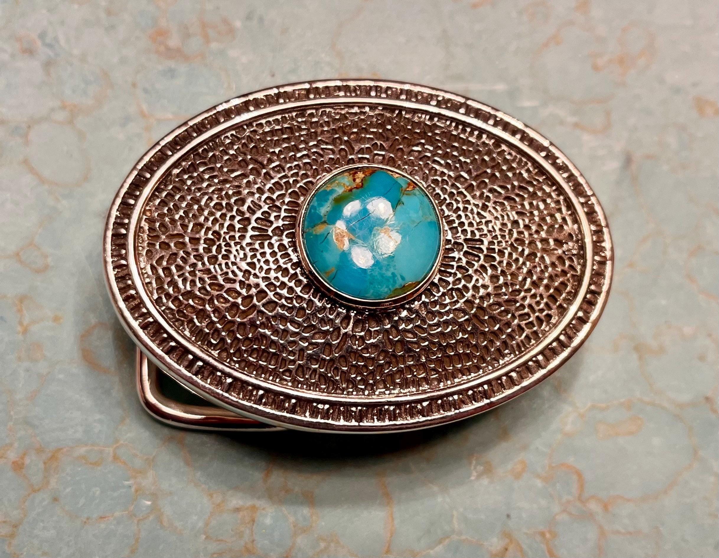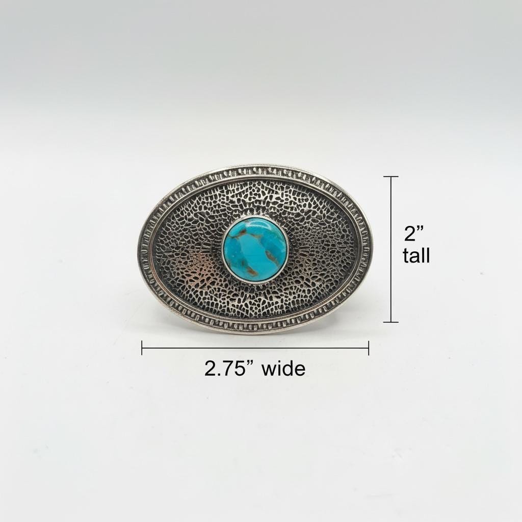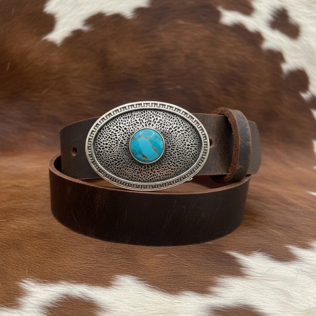 Elevate your western and southwestern wardrobe with this genuine turquoise and sterling silver belt buckle paired with a handcrafted full-grain leather belt, made in the USA.
