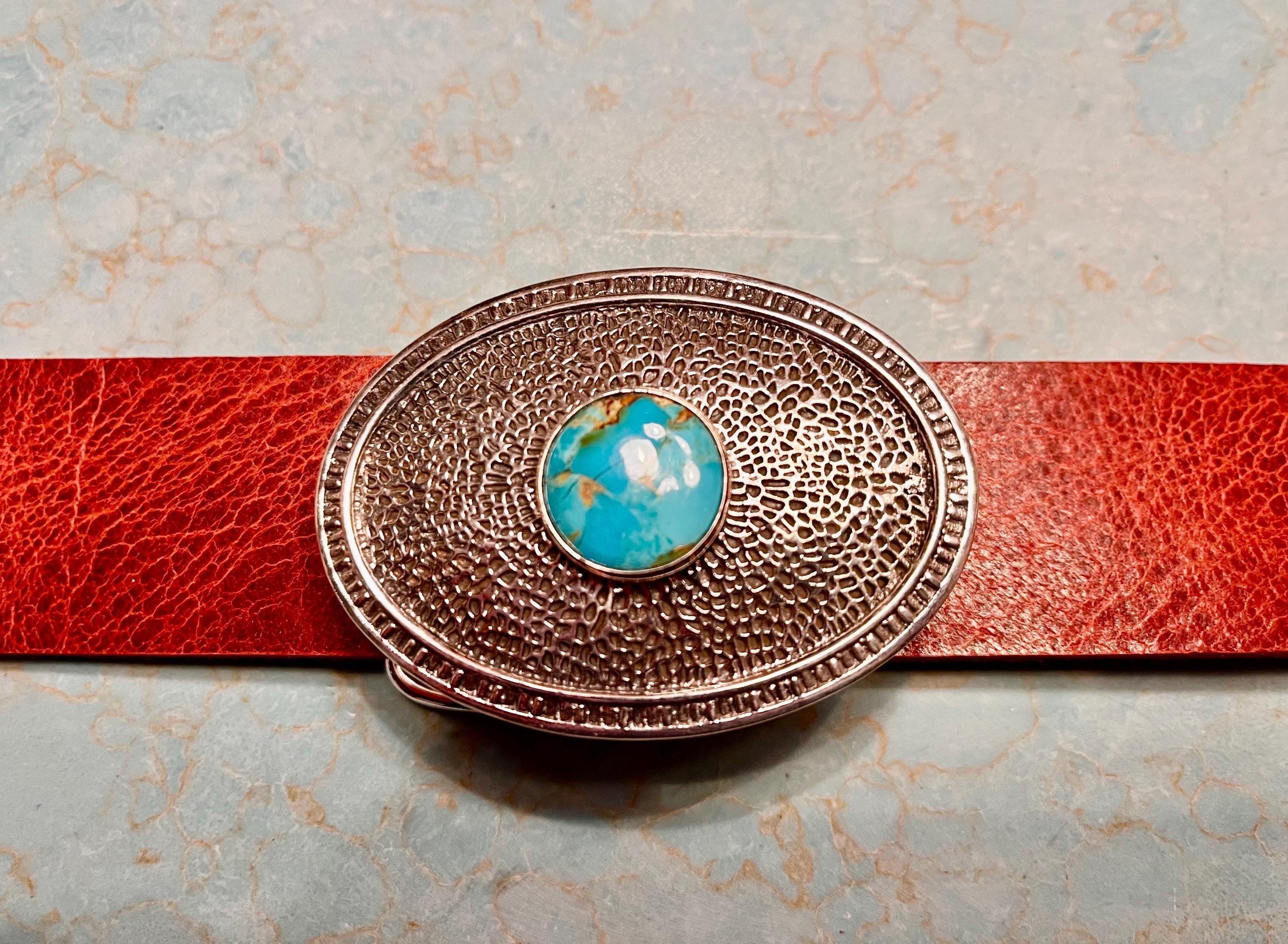 This timeless buckle features natural turquoise set in solid sterling silver, creating a striking statement piece rooted in Southwestern heritage and craftsmanship. Each buckle is paired with our custom-made leather belt, cut and finished by hand for durability, comfort, and heirloom quality.