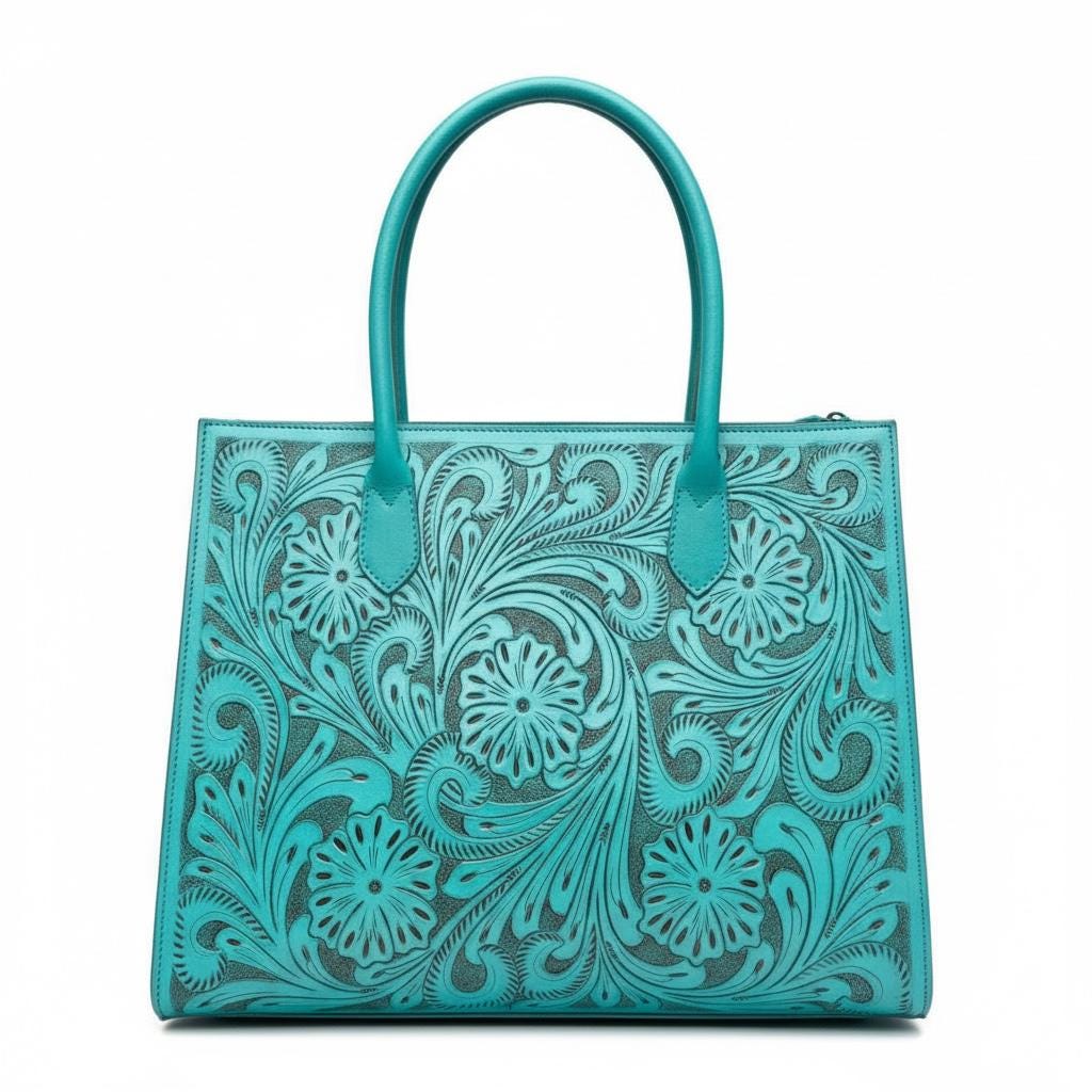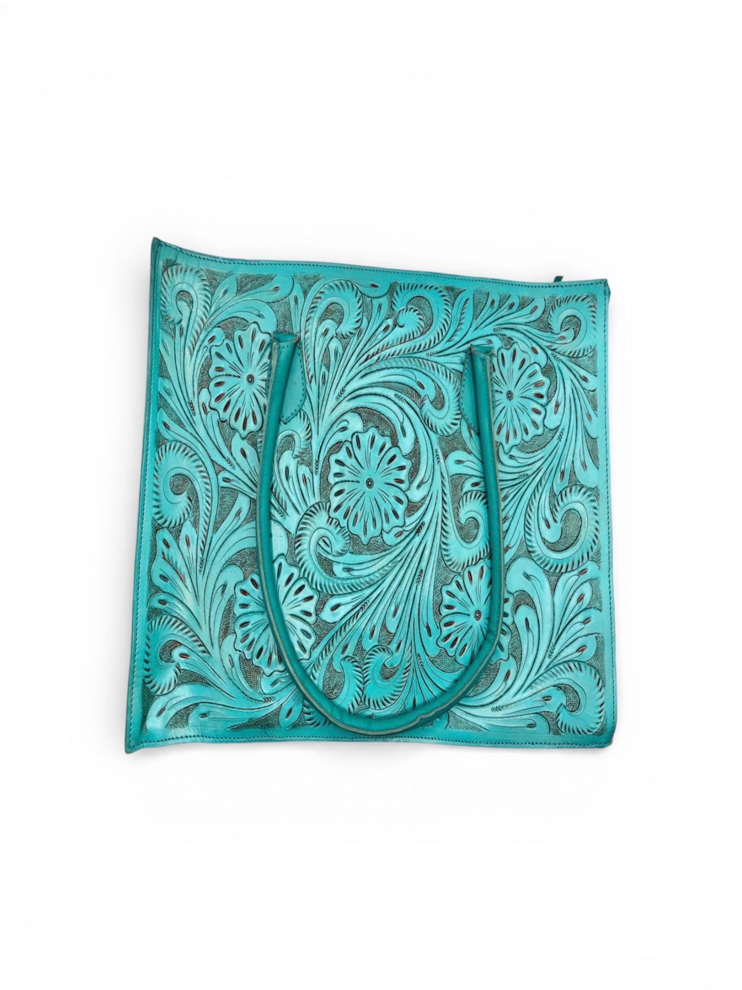 Discover the artistry behind this hand carved leather messenger bag, where skilled craftsmanship brings each detail to life over the course of a week. Designed with both style and function in mind, this heirloom quality bag fits laptop supplies effortlessly, making it perfect for daily use or special occasions. Available in rich brown or vibrant aqua turquoise, this tooled leather bag embodies southwestern charm and timeless appeal.