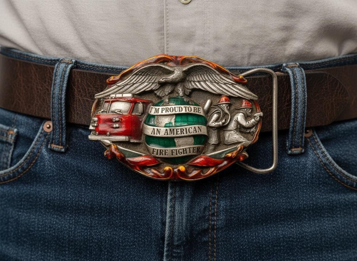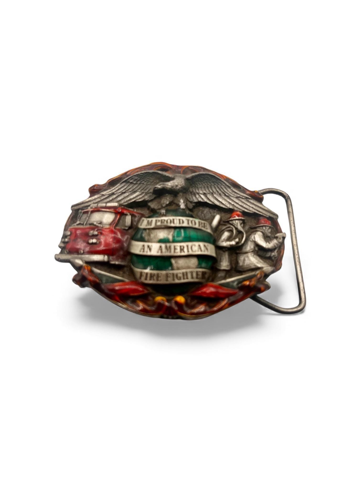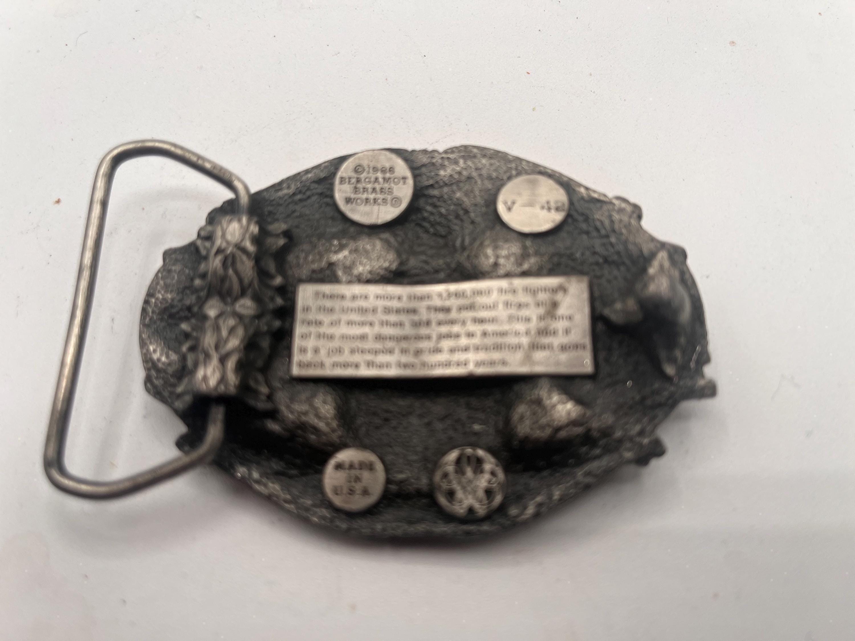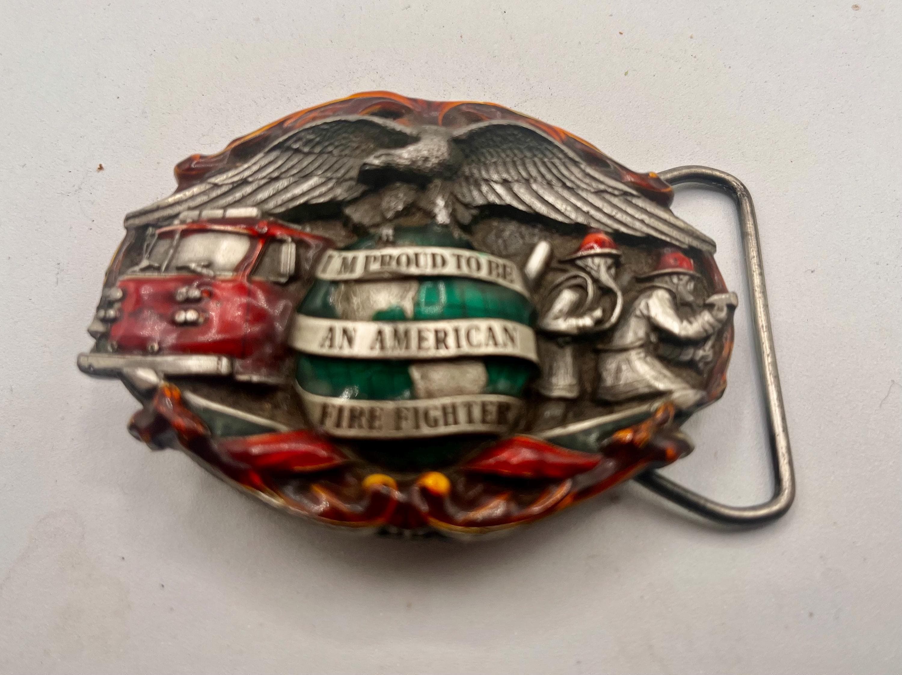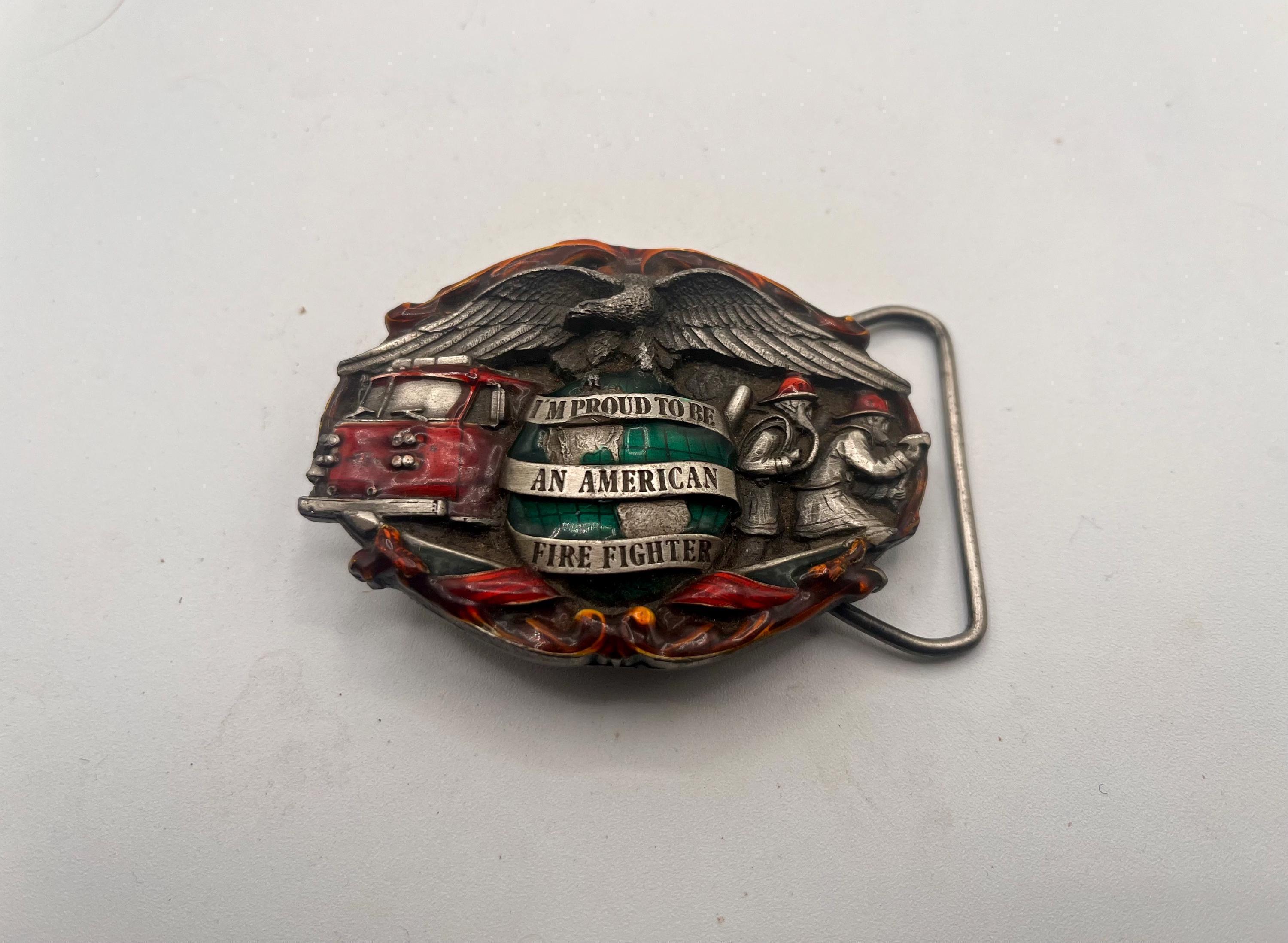 Honor America’s hardworking firefighters with this vintage 1988 solid Bergamot Brass Works belt buckle, featuring an intricate, deeply detailed design celebrating the legacy of the American Firefighter. This buckle is heavy, well-crafted, and built to last — a true vintage collectible.