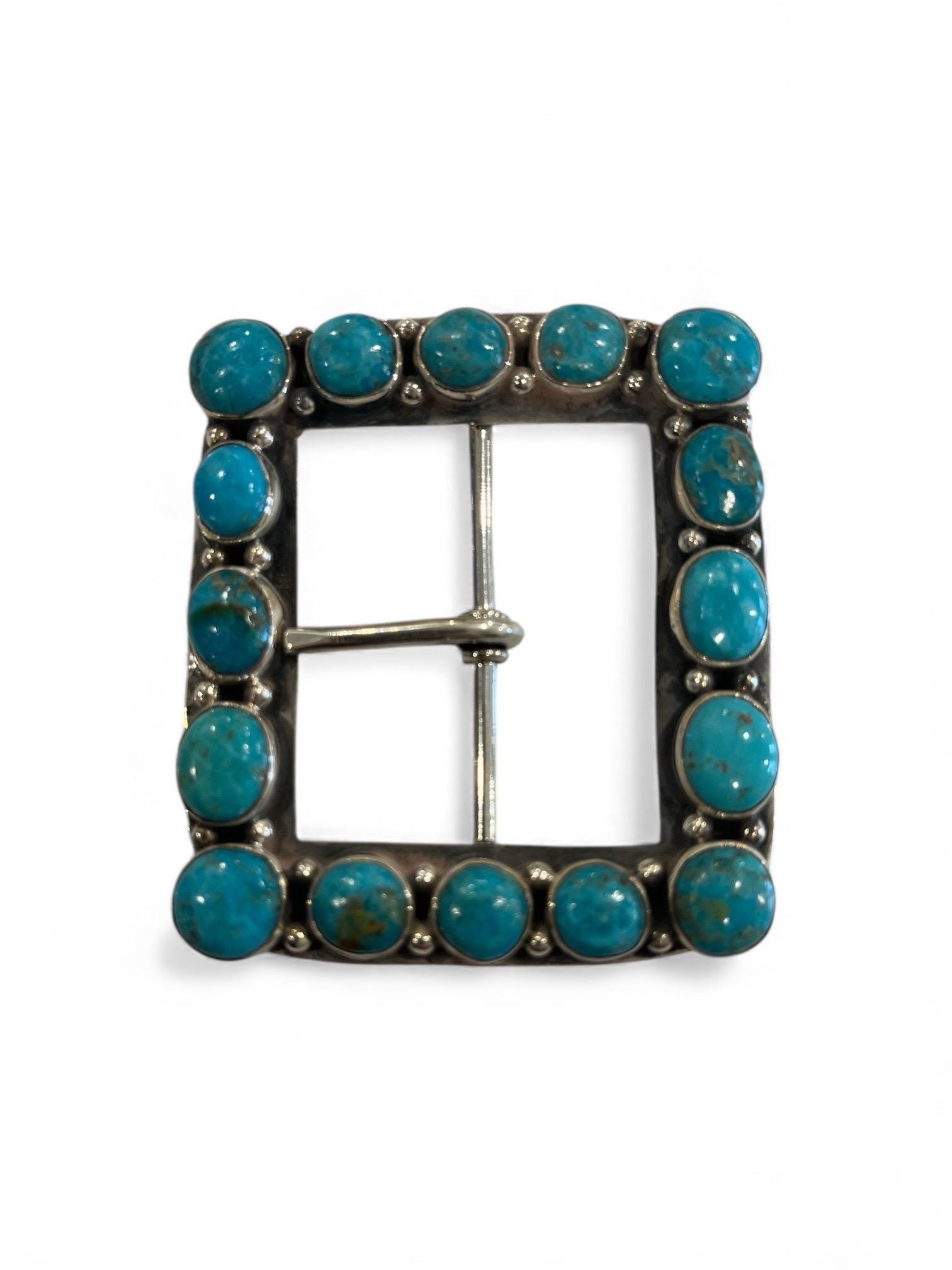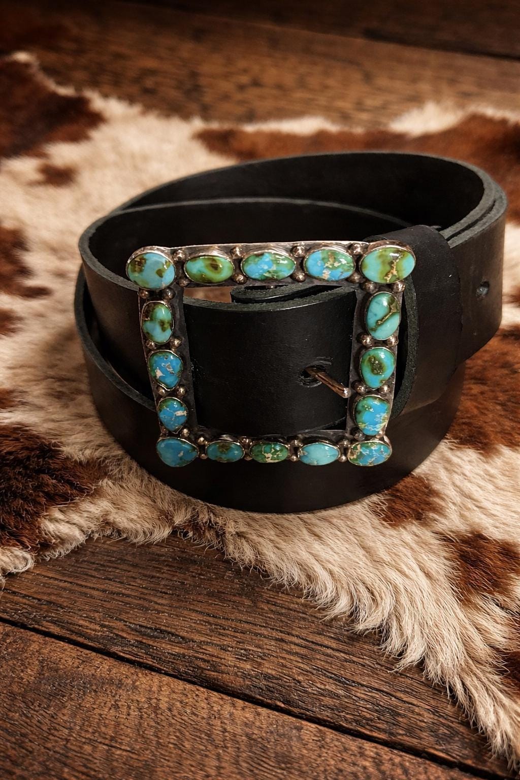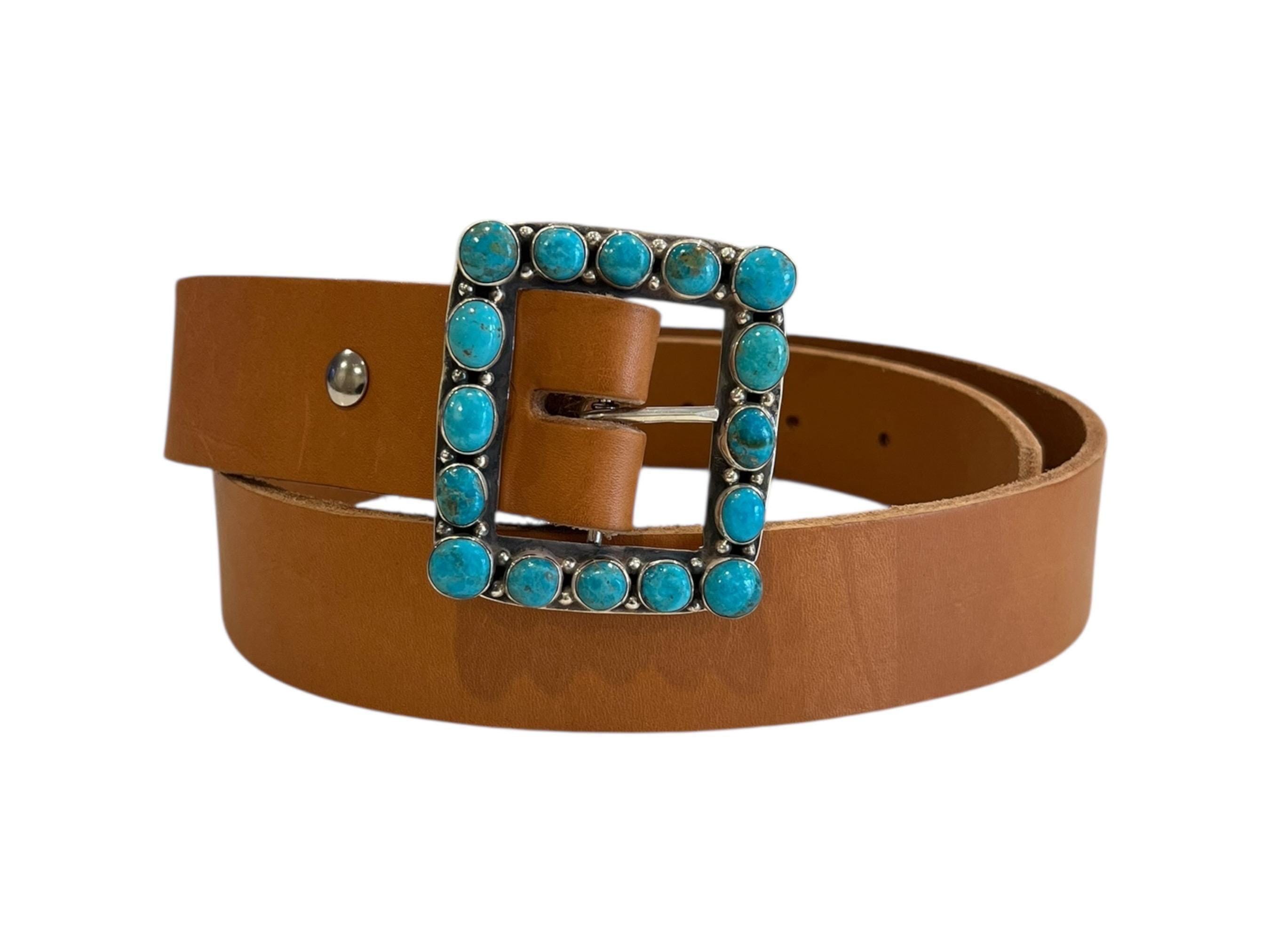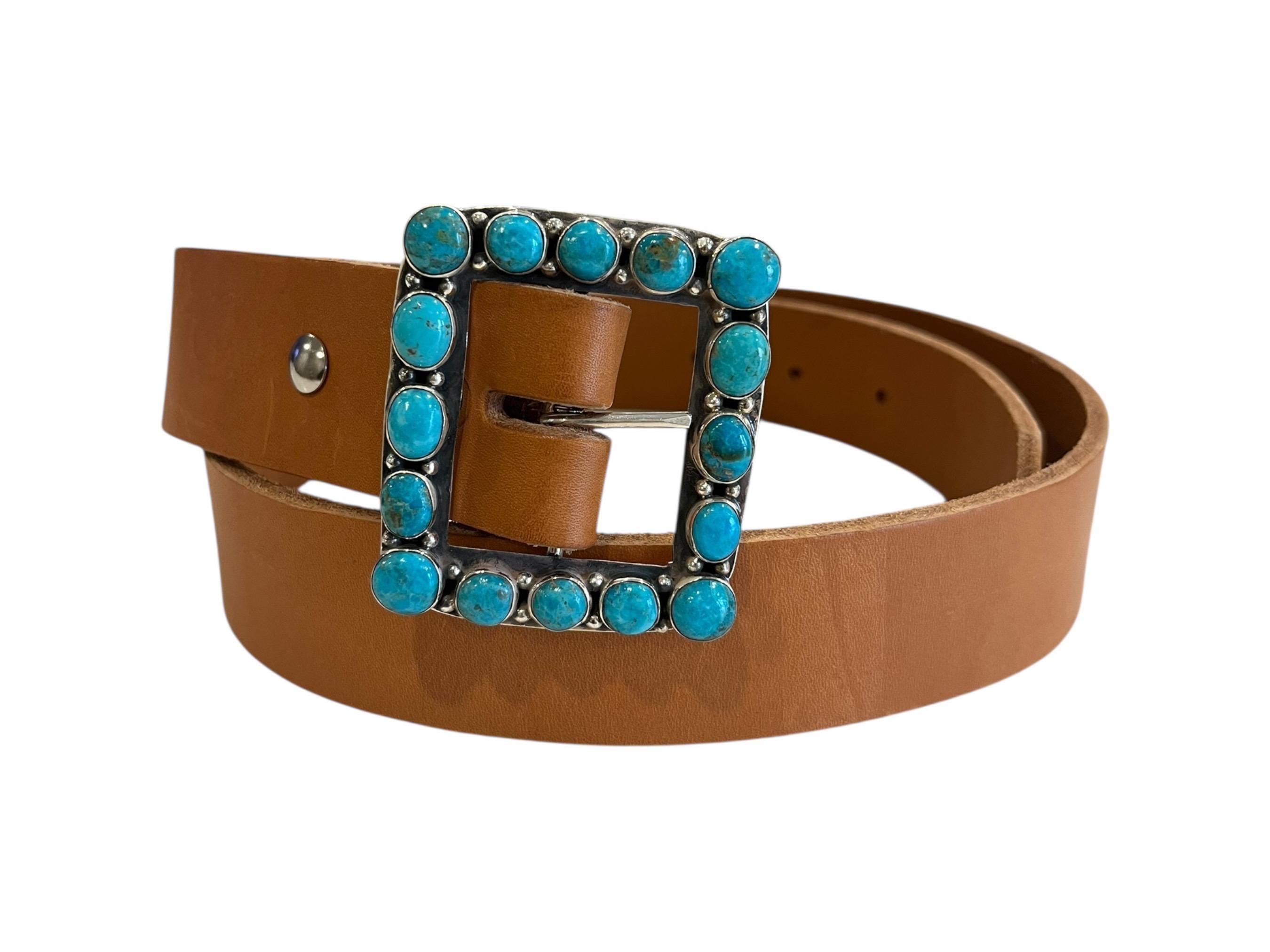 This timeless buckle features natural turquoise set in solid sterling silver, creating a striking statement piece rooted in Southwestern heritage and craftsmanship. Each buckle is paired with our custom-made leather belt, cut and finished by hand for durability, comfort, and heirloom quality.