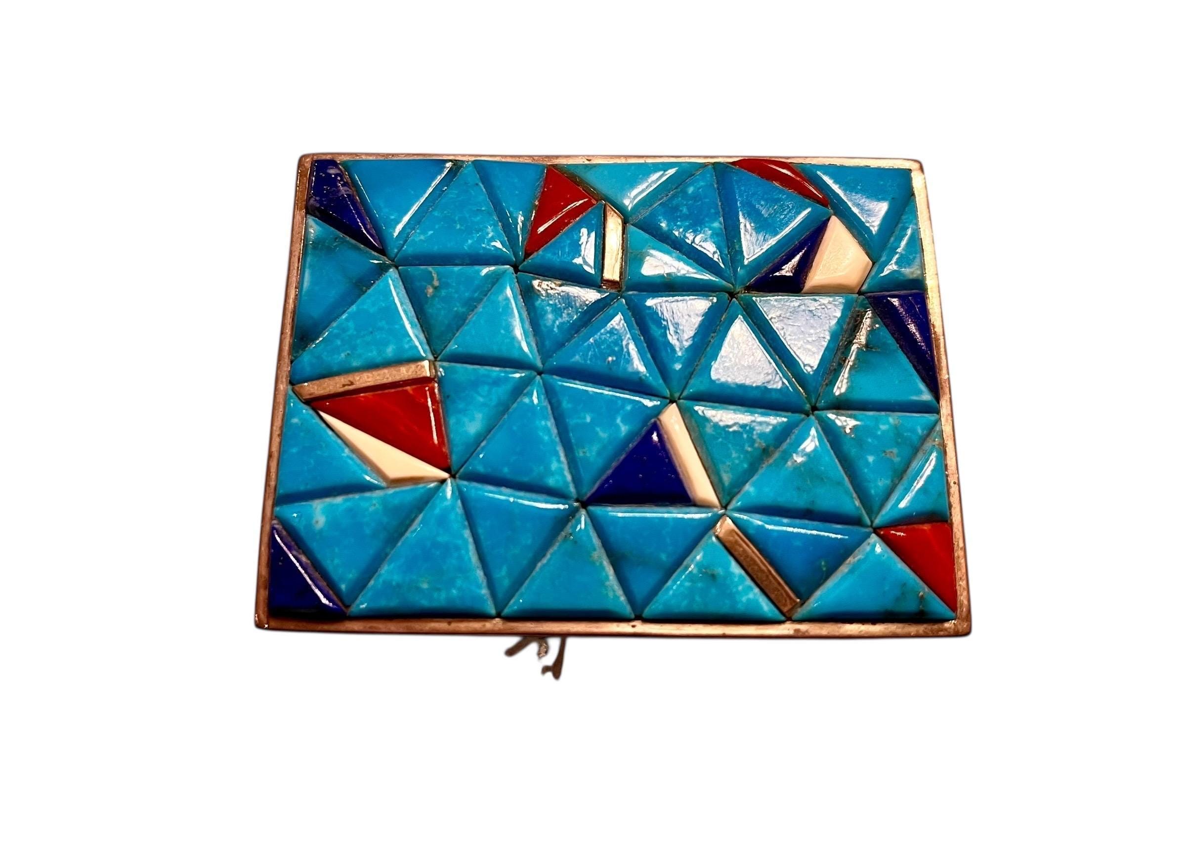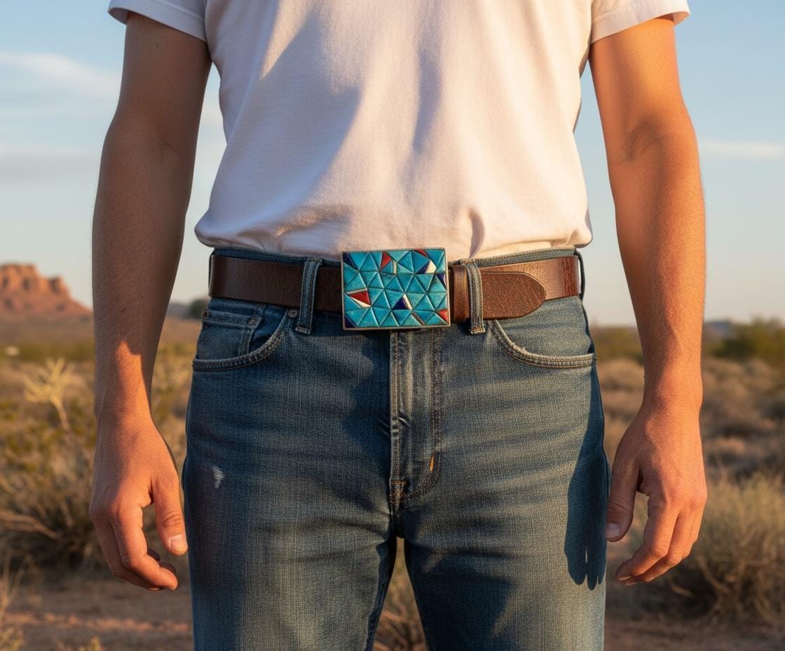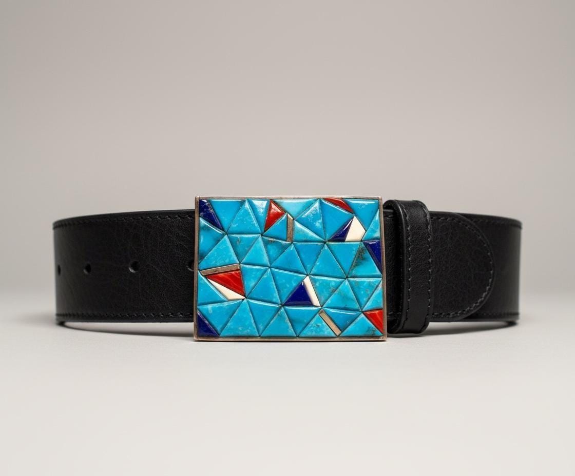 This stunning Southwestern turquoise and sterling silver belt buckle features a mosaic design that embodies strength and heritage. This piece pairs beautifully with a supple saddle leather belt available in rich British tan, dark brown, or black hues. Each buckle is a testament to decades of Southwestern artistry and meticulous handmade craftsmanship.