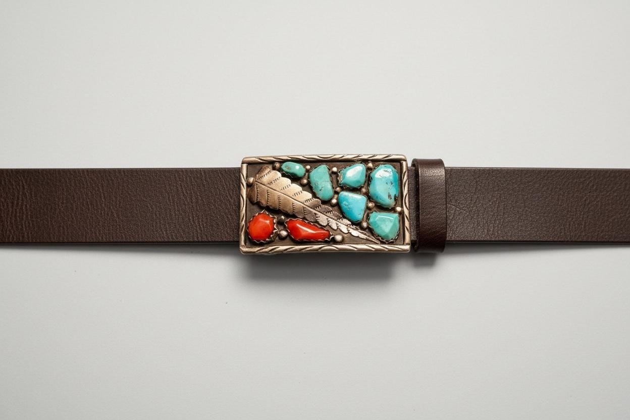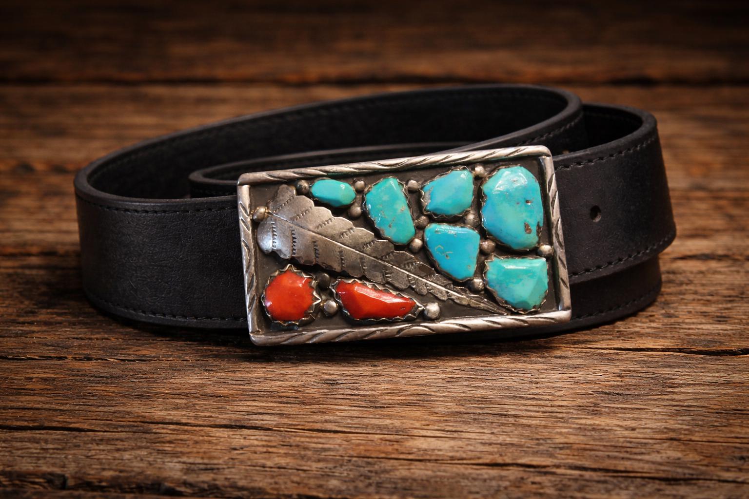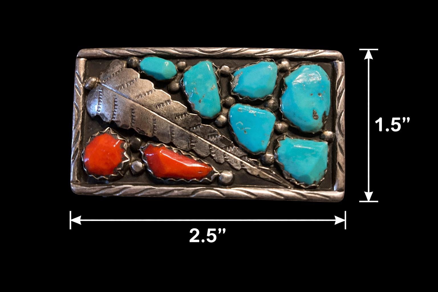 The buckle displays beautiful natural turquoise and coral stones, complemented by a detailed sterling silver feather and hand-applied rope border.