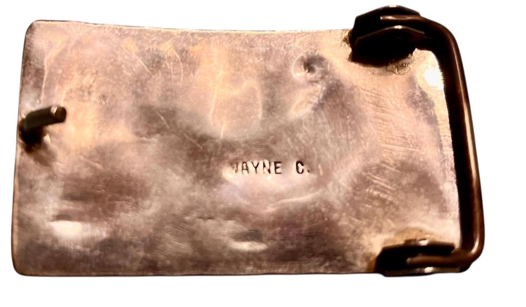 This buckle is signed Wayne C. While the hallmark and craftsmanship indicate authentic handmade sterling silver work consistent with Native American silversmith traditions, the artist’s specific tribal affiliation has not been independently verified.