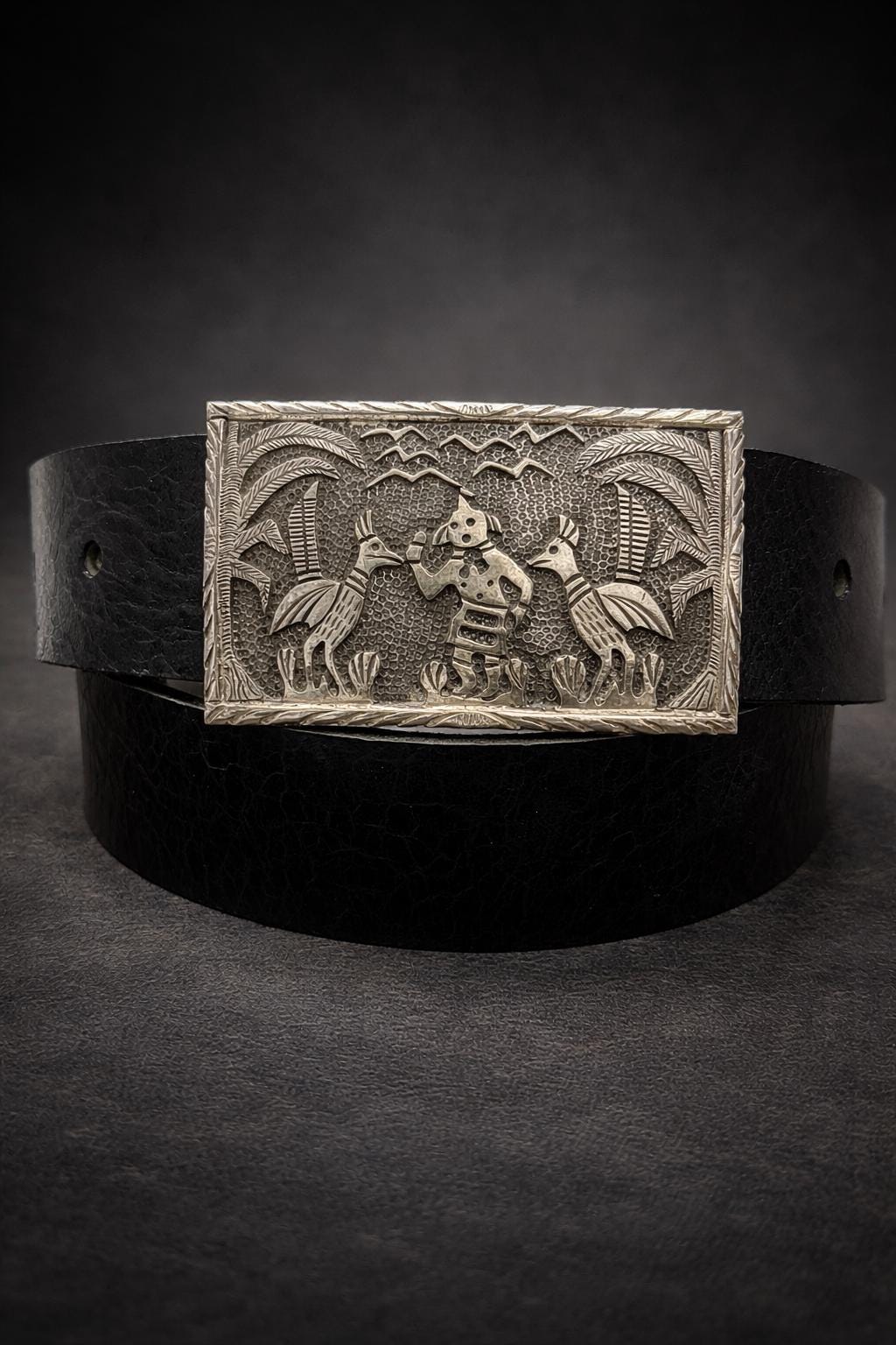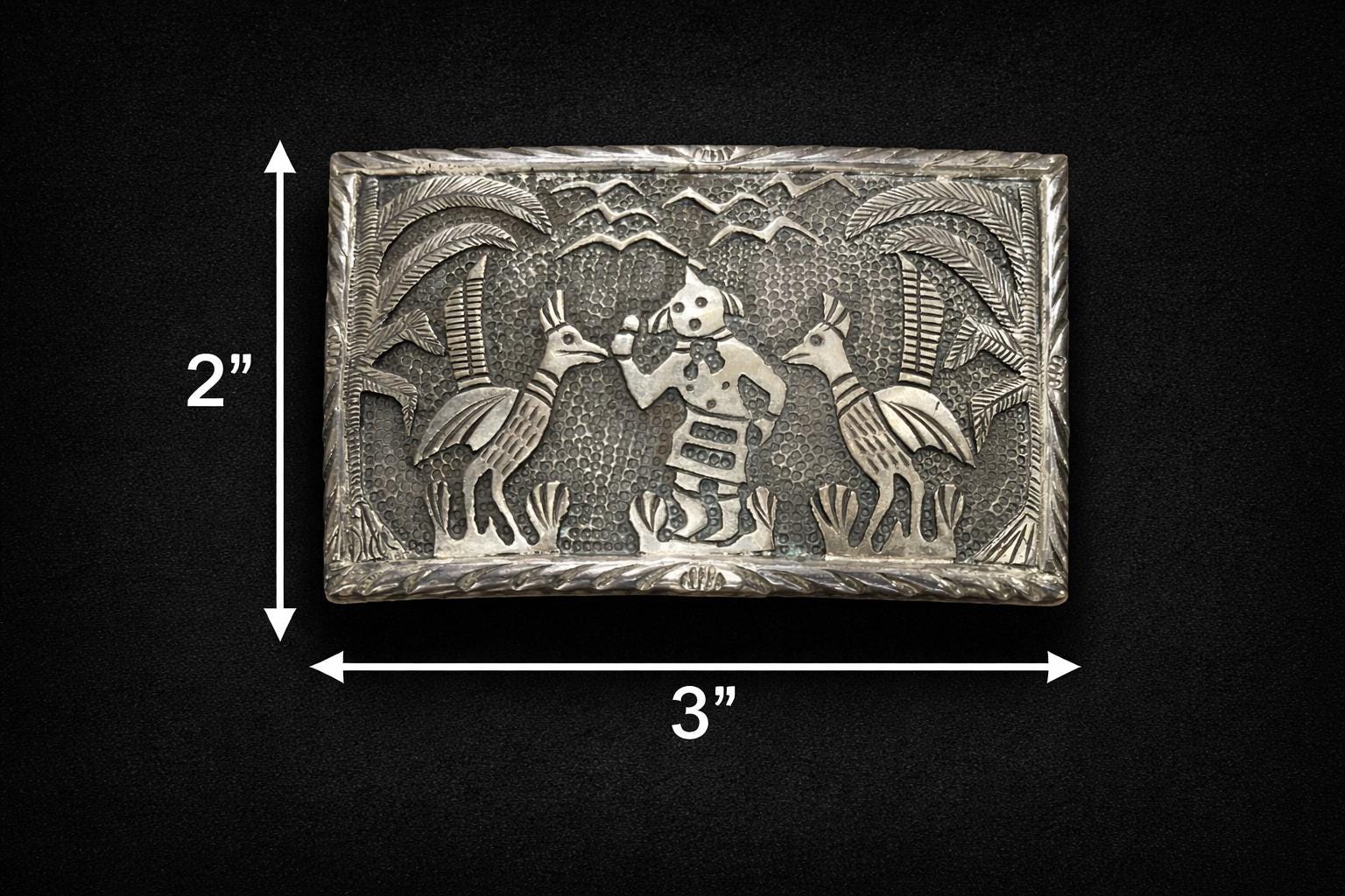Exceptional vintage sterling silver storyteller belt buckle featuring a traditional narrative scene with Thunderbird and central figure motif. This handcrafted piece showcases detailed hand stamping, layered overlay work, and a richly textured background.
